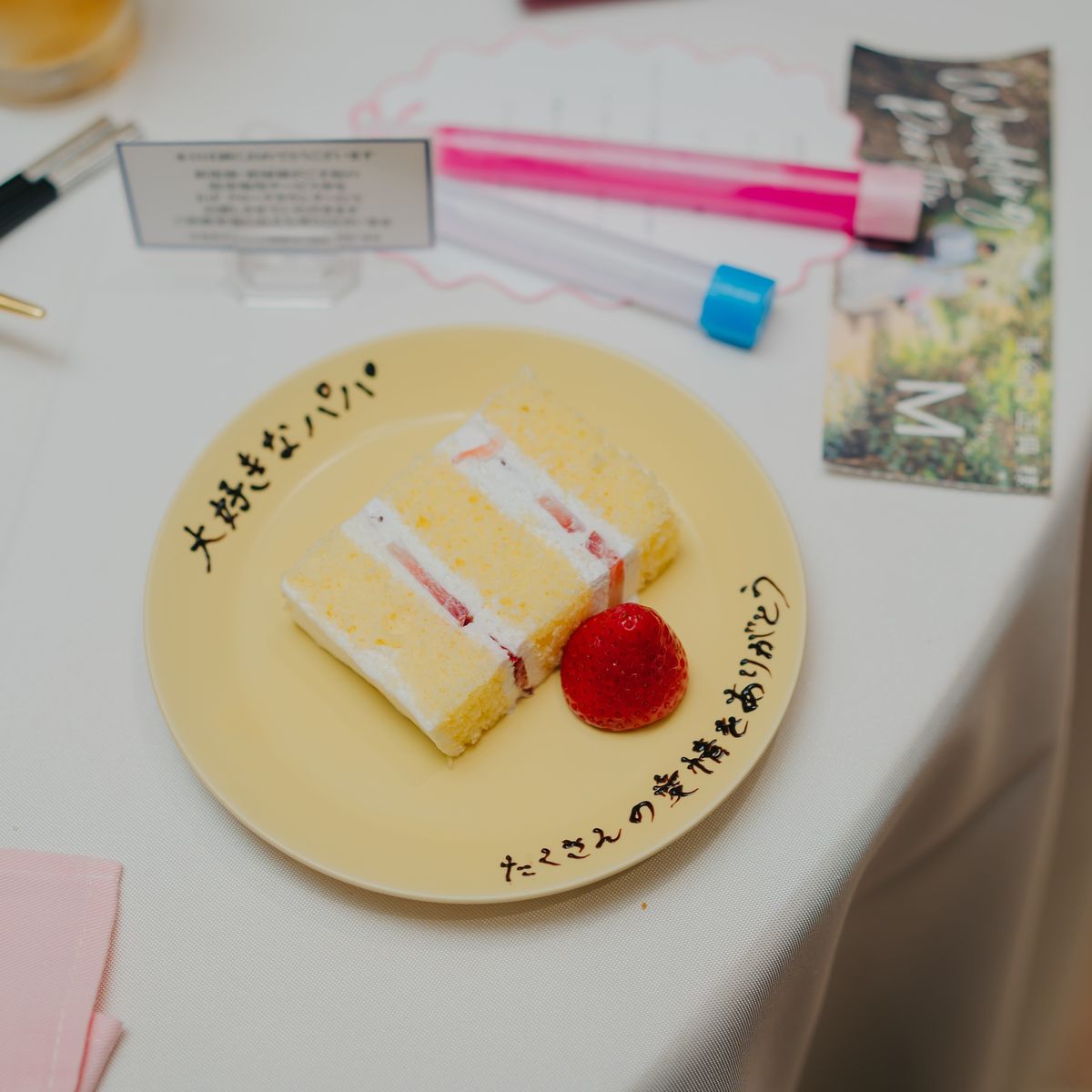 ご新郎からのサプライズでプレゼントされたバラの花束。1本+38本で39本になった花束には、それぞれの本数に深い意味が込められていたそうです。再入場ではご新郎が歌を披露し、会場全体が笑顔と拍手に包まれる瞬間に。ペンライトを振って楽しむ一体感も特別でした。さらに、デザートに添えた両親へのメッセージプレートなど、小さな心配りも。感謝と愛を笑顔で届ける、唯一無二の演出が光りました。