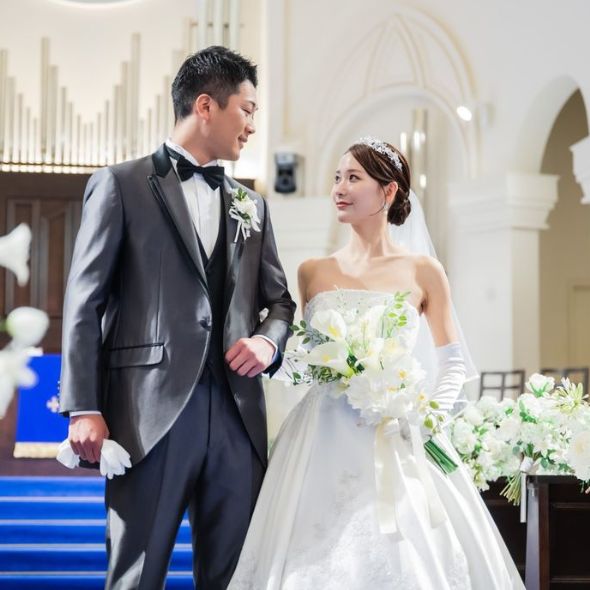 アニヴェルセルの特徴でもある青いバージンロードに惹かれたことも、式場選びの決め手の一つだったそう。また、挙式から披露宴までの動線が室内のため天候の心配が無いこと、防音室があるので、赤ちゃん連れのゲストにも安心して参列していただけることも、ゲスト想いのおふたりに気に入っていただいたポイントです。チャペル内では映像を流し、聖歌隊と生演奏の音色が響き渡る中で挙式が行なわれました。
