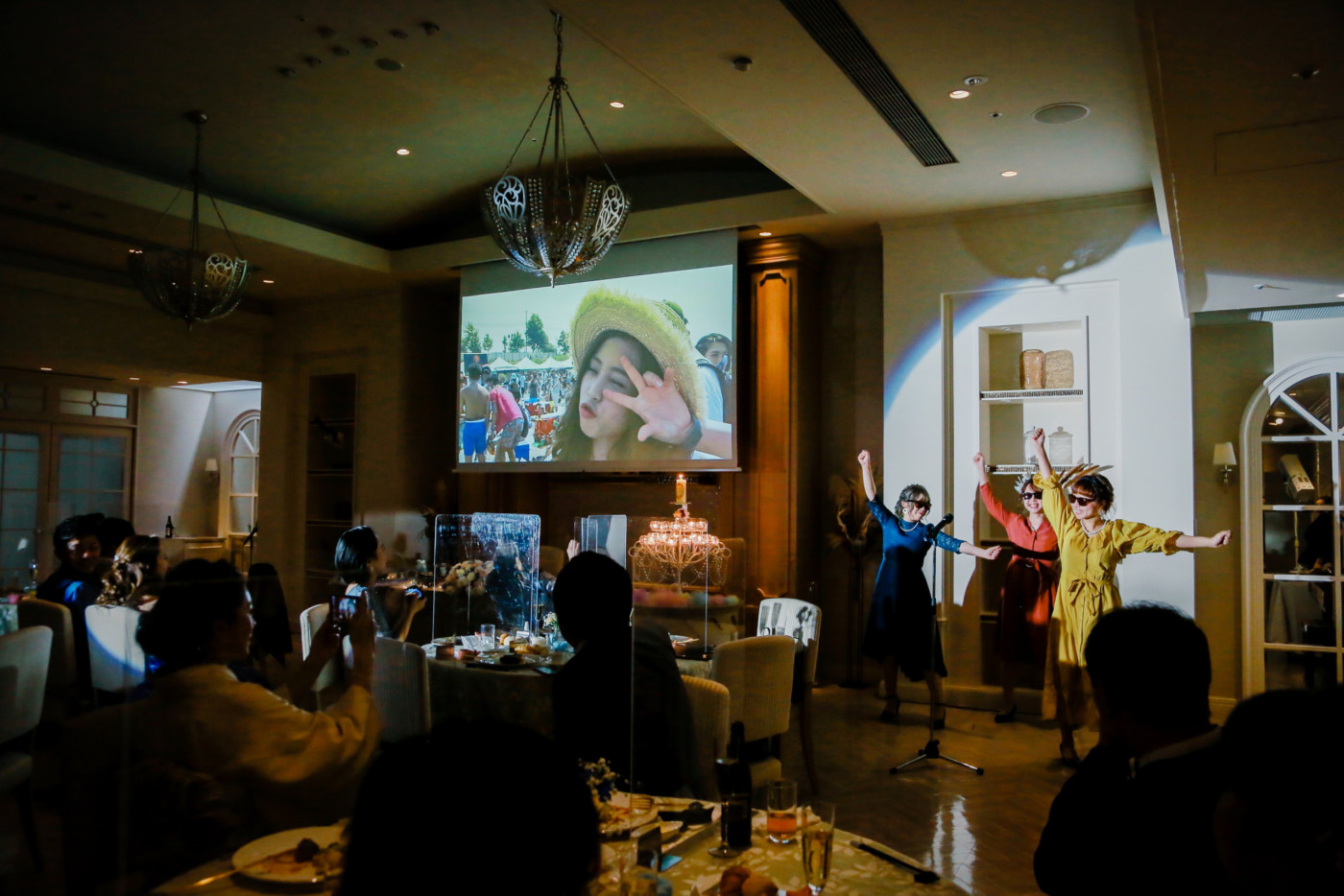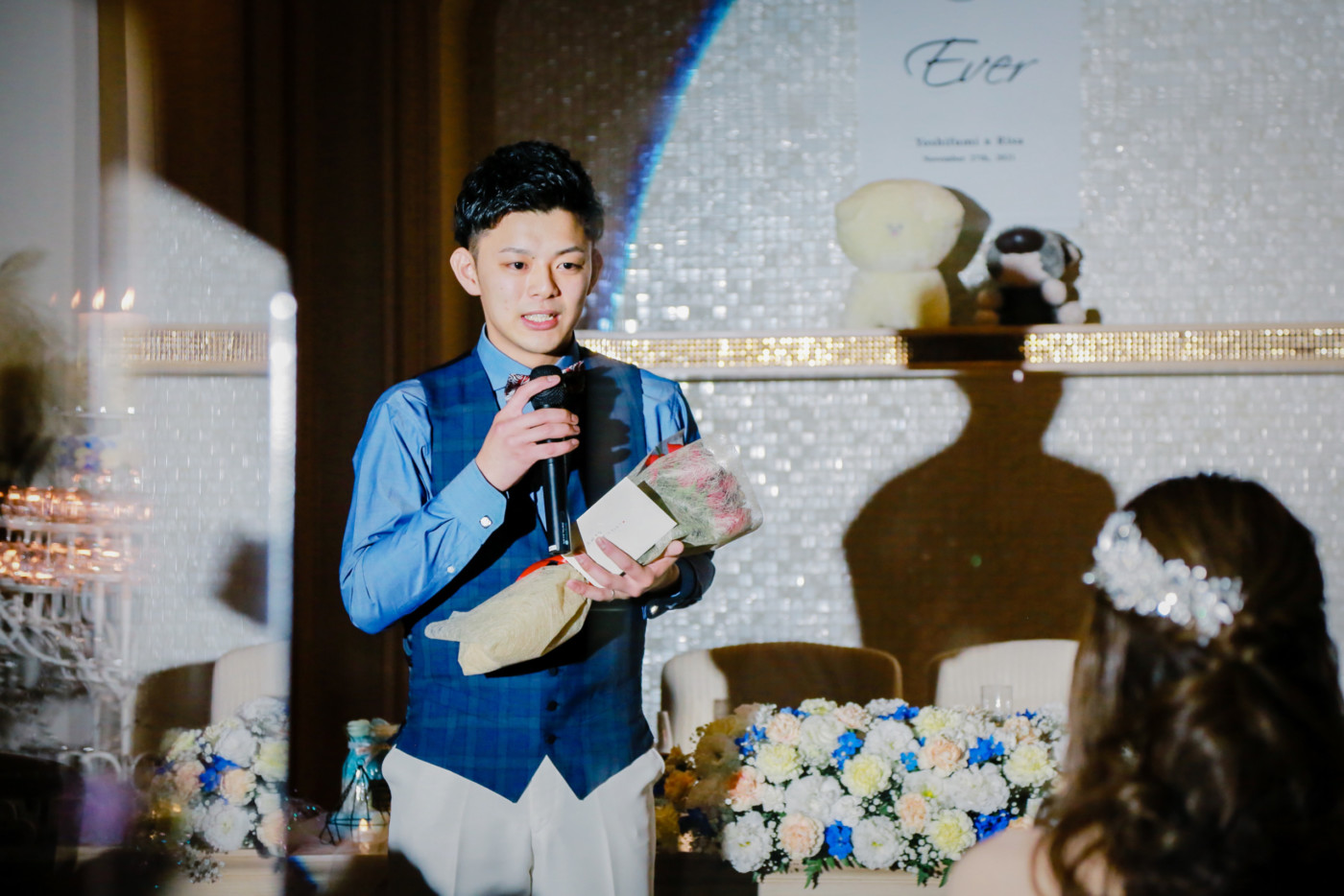 ご新婦お父様にも登場頂くサプライズ余興で盛り上がり! そしてご新郎はご新婦へのサプライズに映像と花束と手紙をご用意。