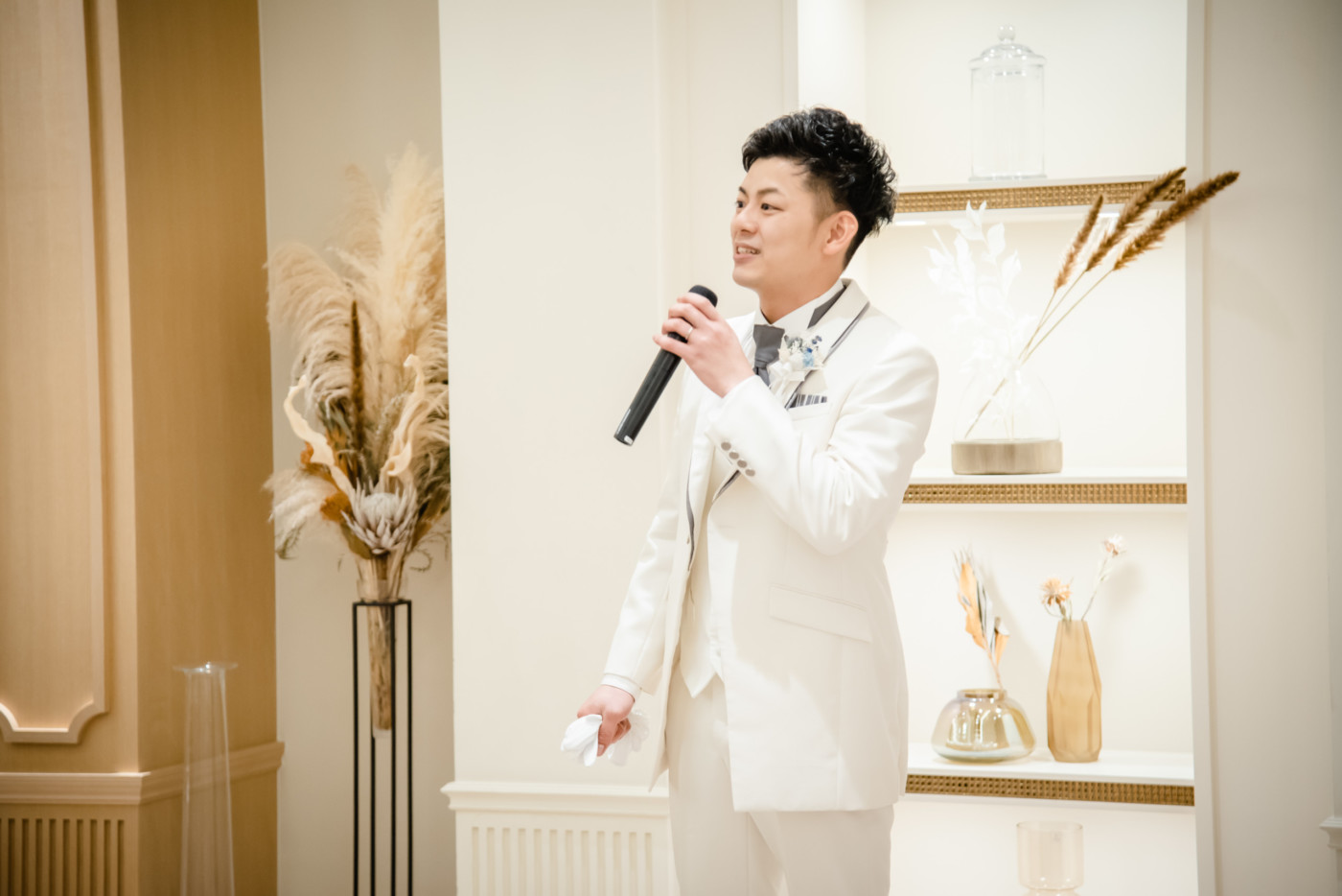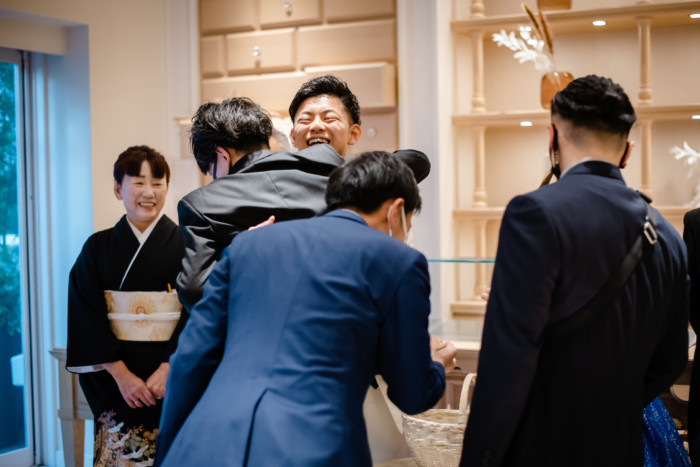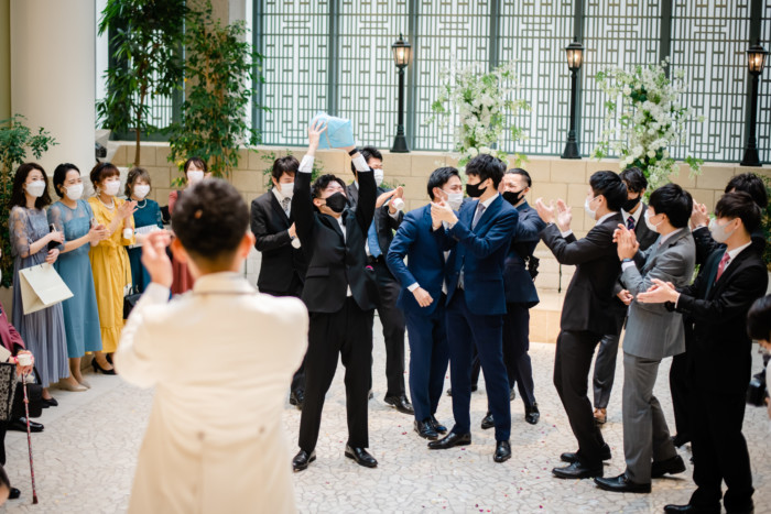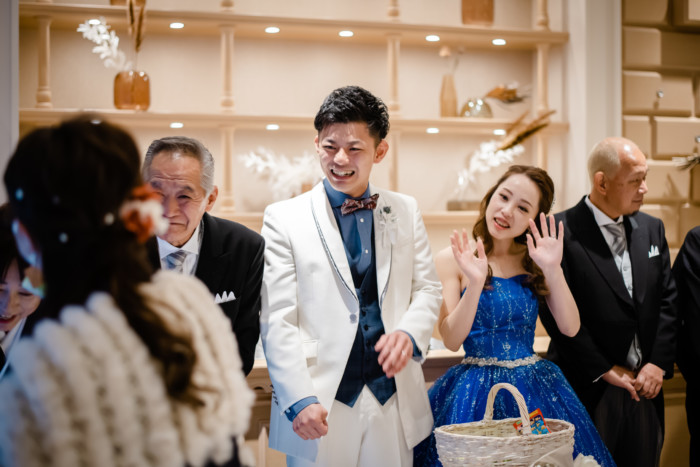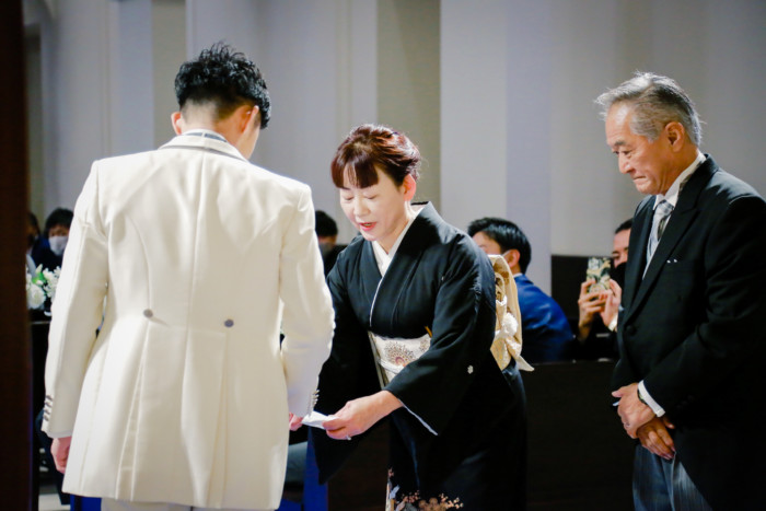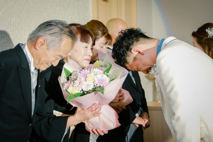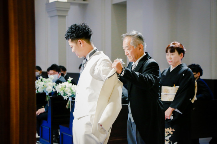 ご新郎入場はジャケットセレモニーをお父様、グローブをお母様より御手渡し頂きました。