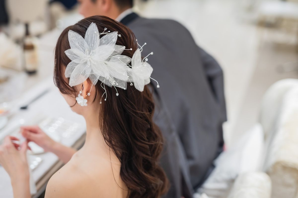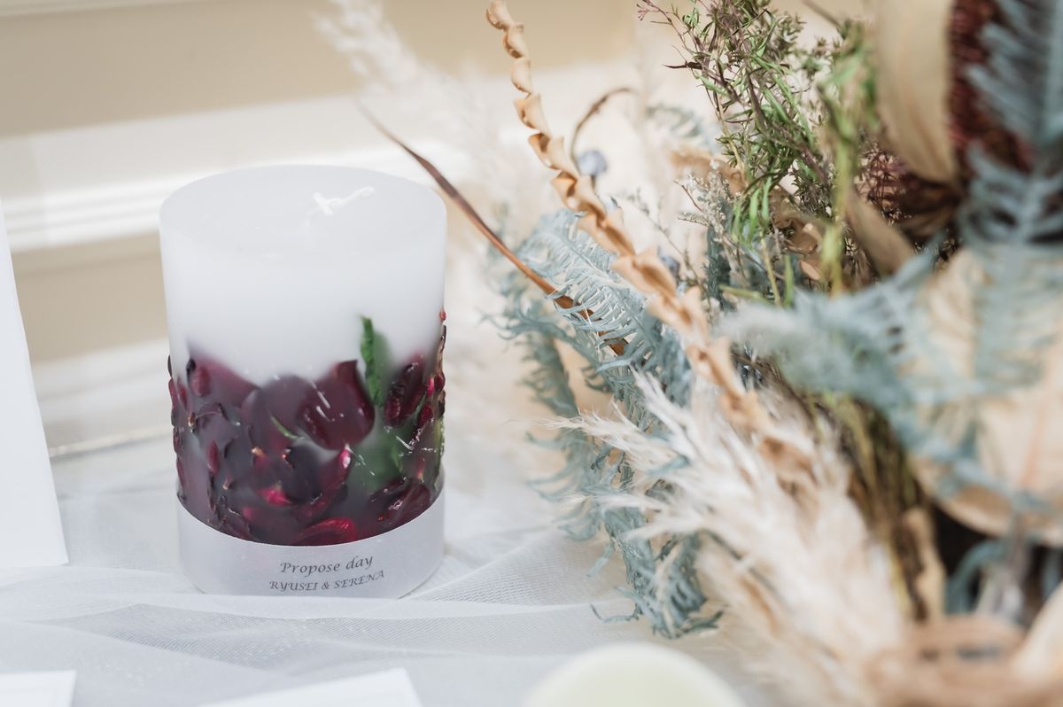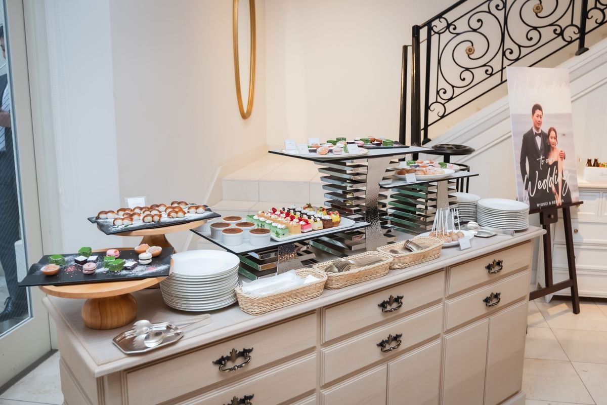 「サロン ドゥ フルール」はオフホワイトを基調とした会場で、当初広さについて不安に思う点もあったそうですが、実際は距離感が近いことでアットホームな雰囲気に。むしろゲストの表情を見ながら会話できてよかったと喜んでいただけました。装花はドライフラワーや水中花、キャンドルを用いて大人可愛い雰囲気を表現。料理は特に平目のアンクルートが好評で、ゲストから「美味しかった」と喜びの声が多数届きました。