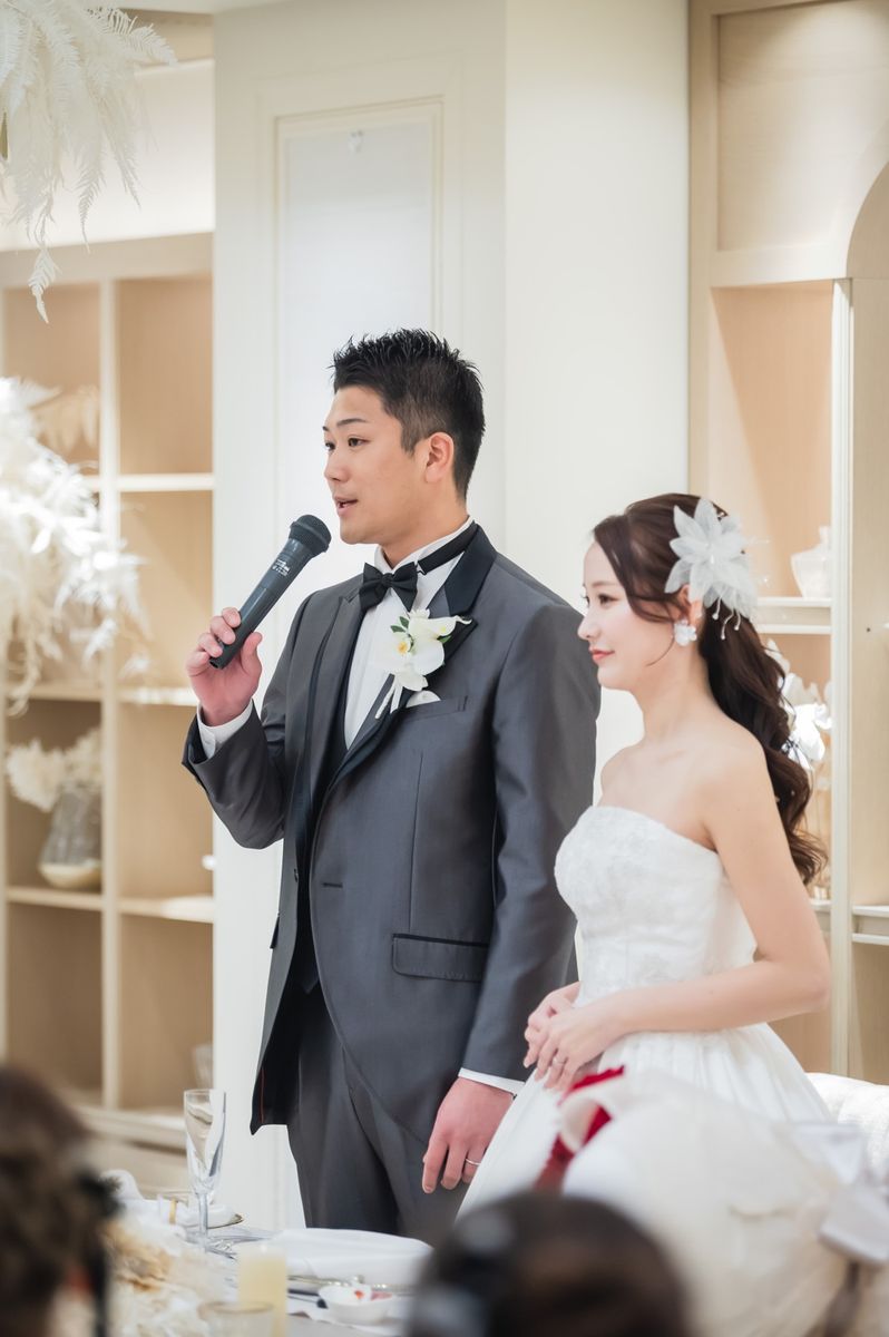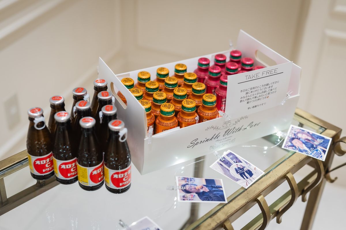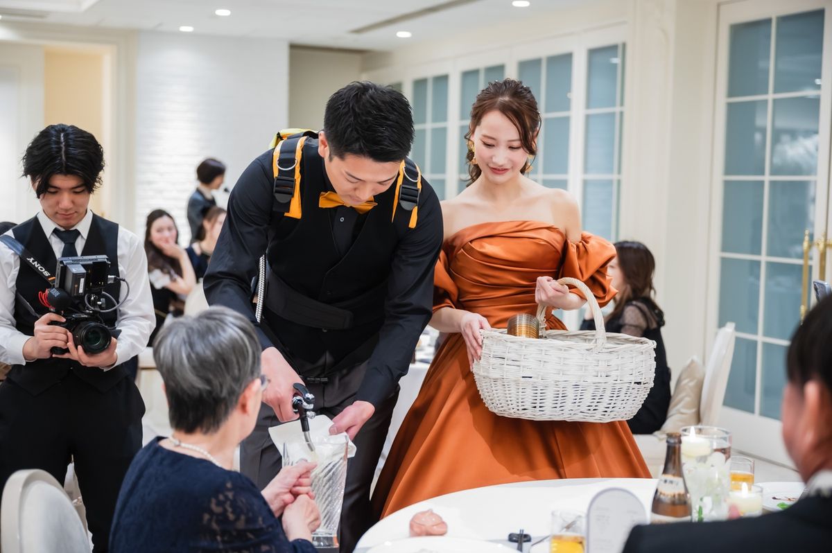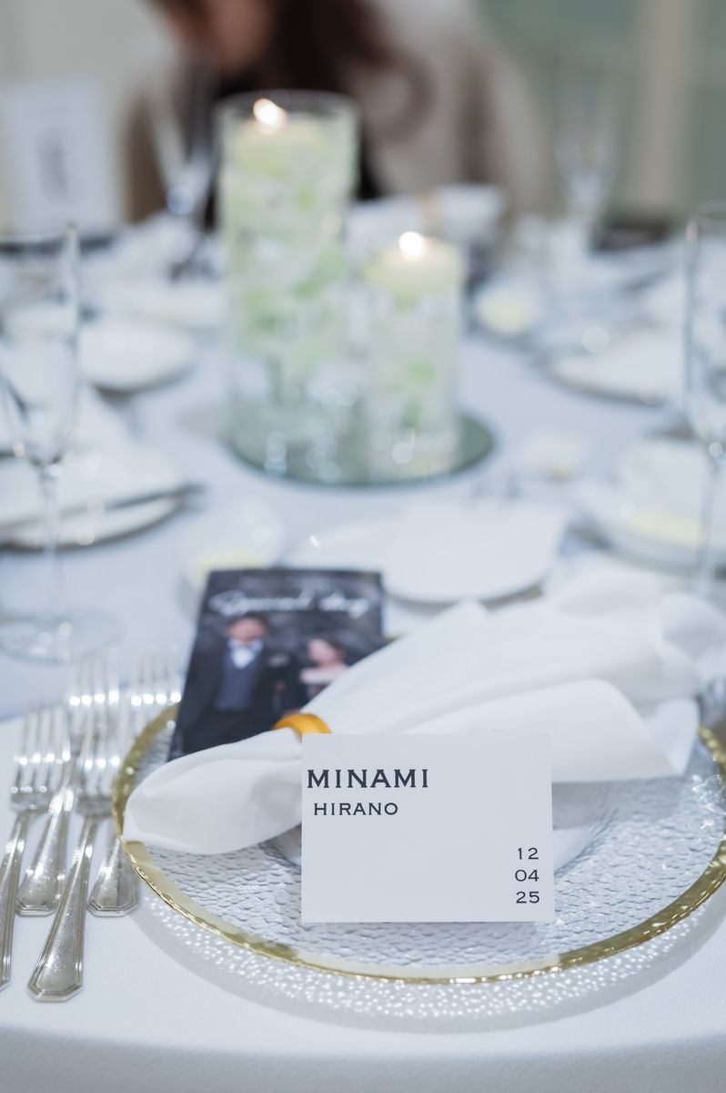 ゲストに喜んでもらえる工夫として、席札に思い出のお写真と直筆メッセージを添えられました。ご家族も、懐かしい思い出がよみがえり「感動した」と喜ばれていたのが印象的です。また、テーブルをまわってのビールサーブや、プチギフトに選んだお水も好評で、おふたりらしい気配りが光りました。飾らず自然体なスタイルで感謝を届けた、心温まる1日でした。