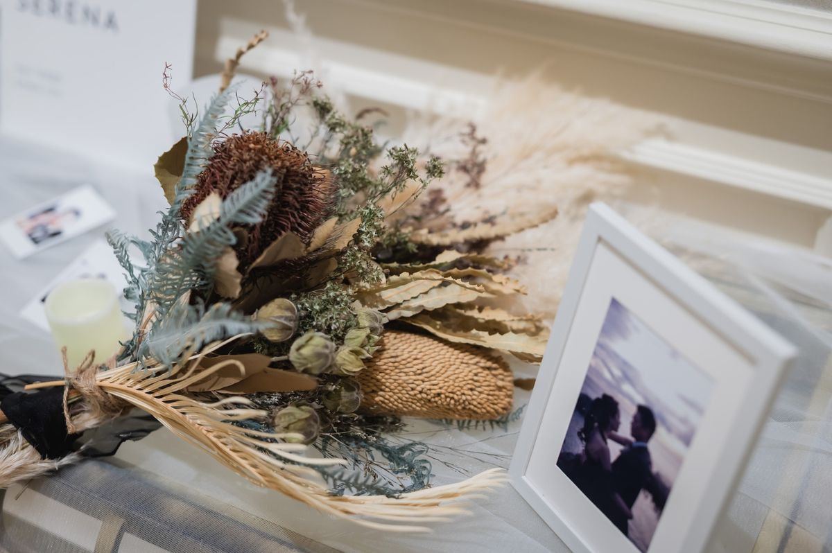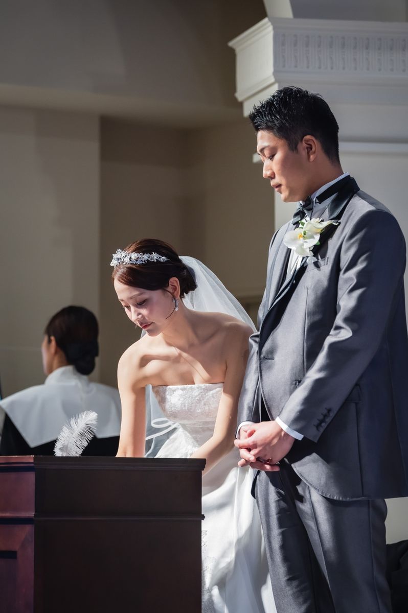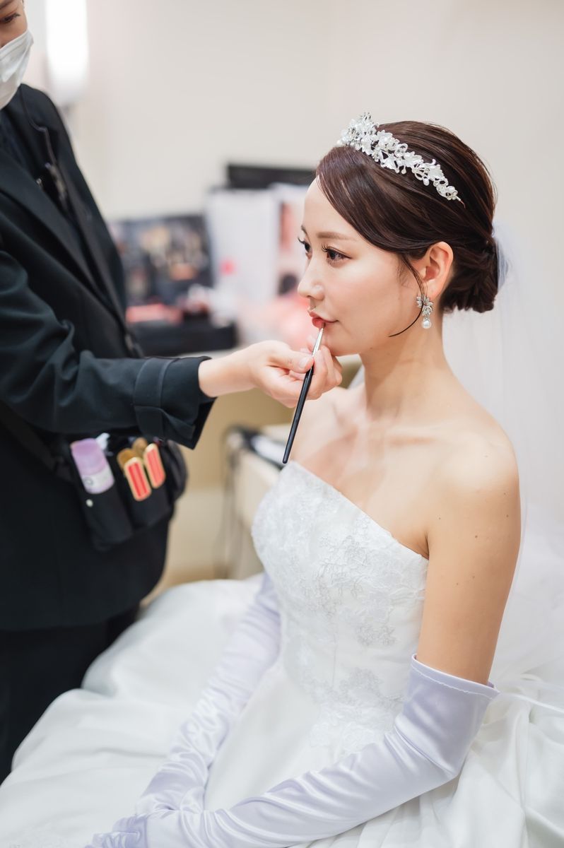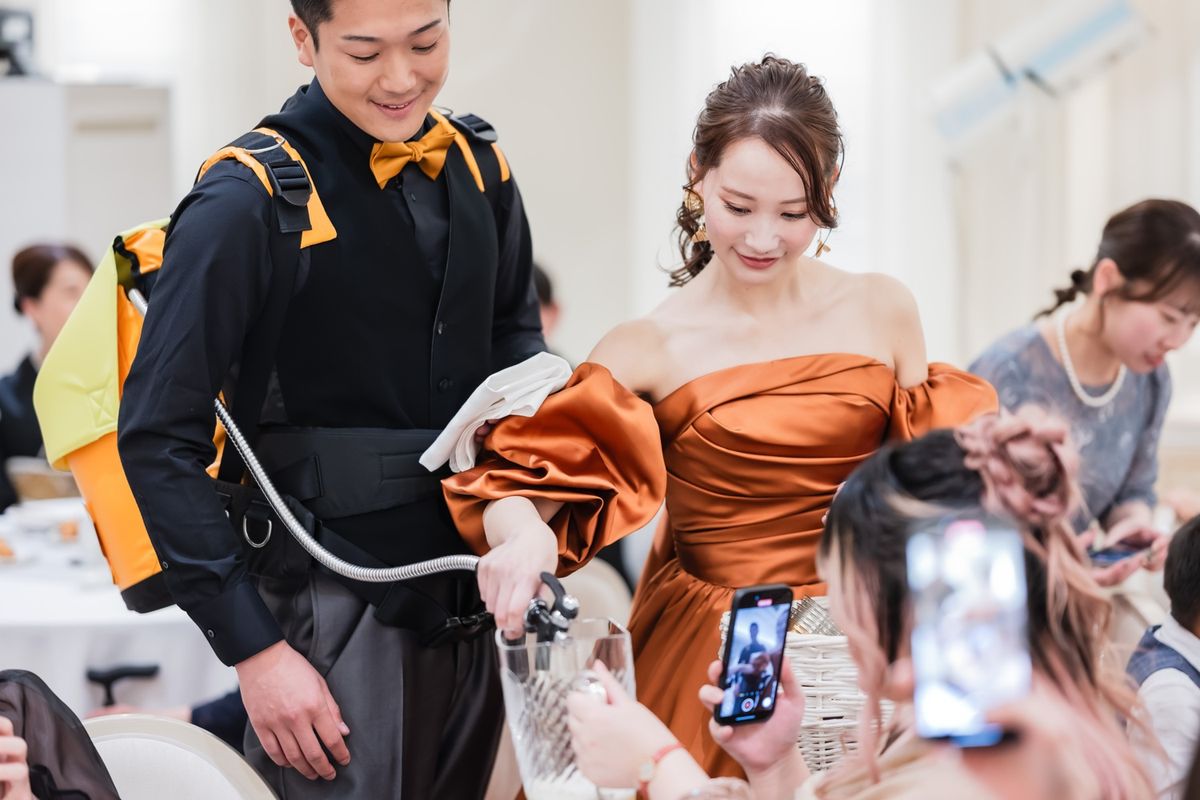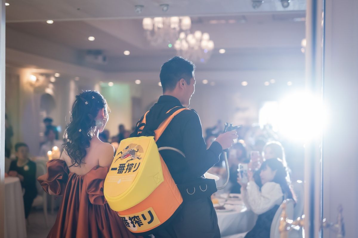 ゲストに喜んでもらえる工夫として、席札に思い出のお写真と直筆メッセージを添えられました。ご家族も、懐かしい思い出がよみがえり「感動した」と喜ばれていたのが印象的です。また、テーブルをまわってのビールサーブや、プチギフトに選んだお水も好評で、おふたりらしい気配りが光りました。飾らず自然体なスタイルで感謝を届けた、心温まる1日でした。