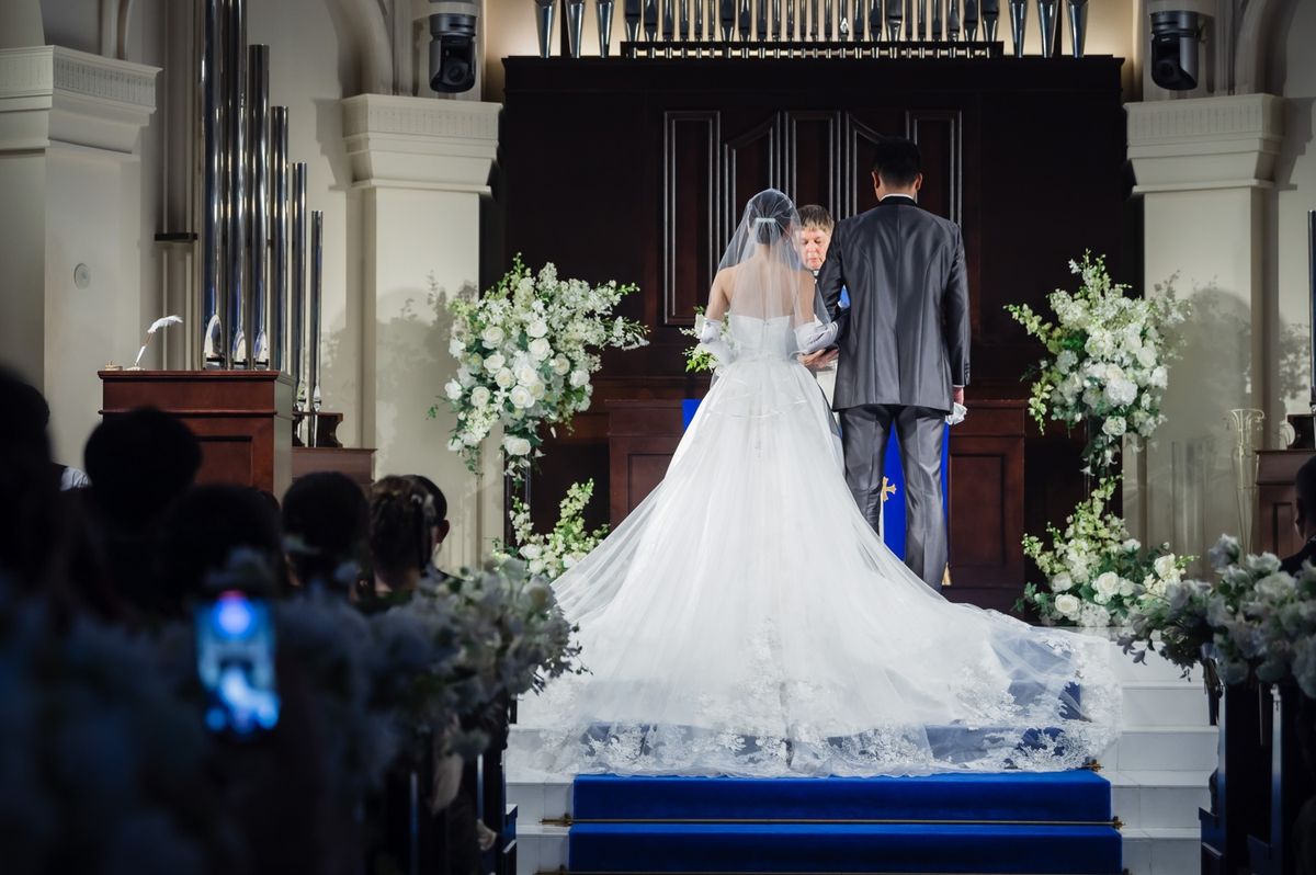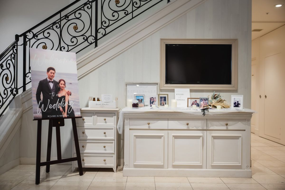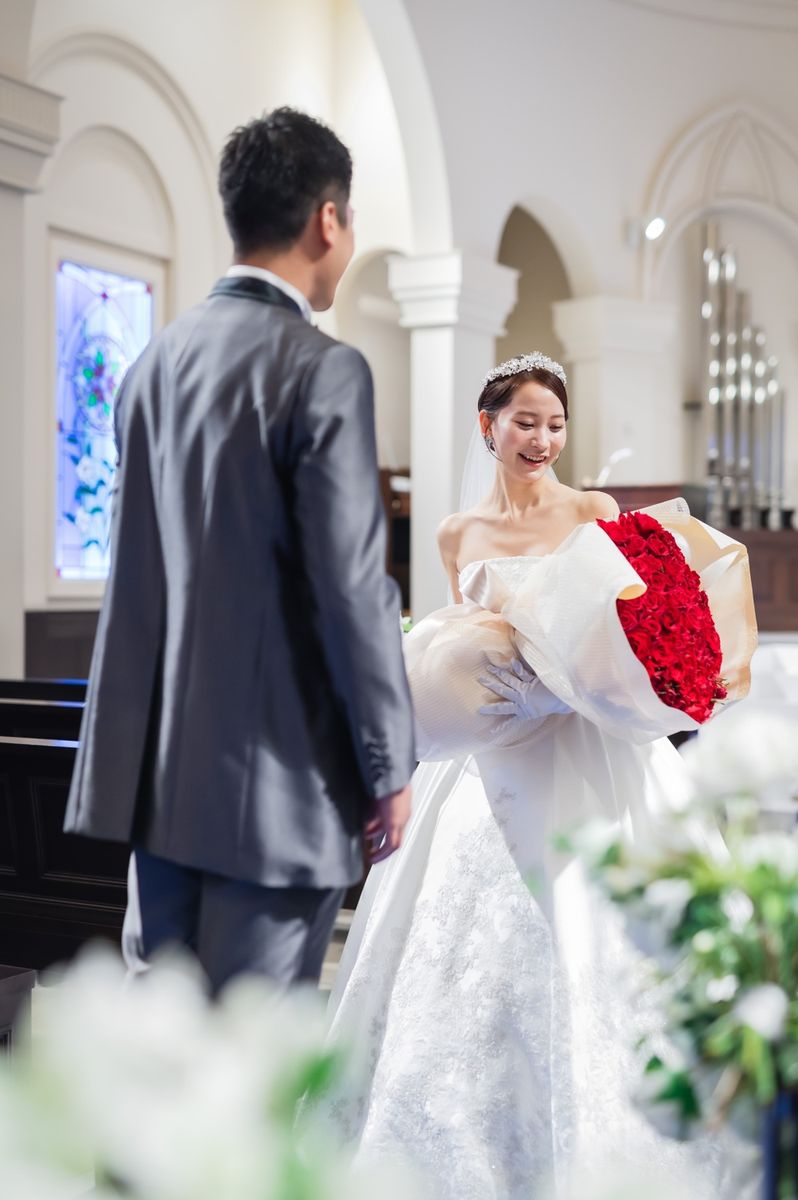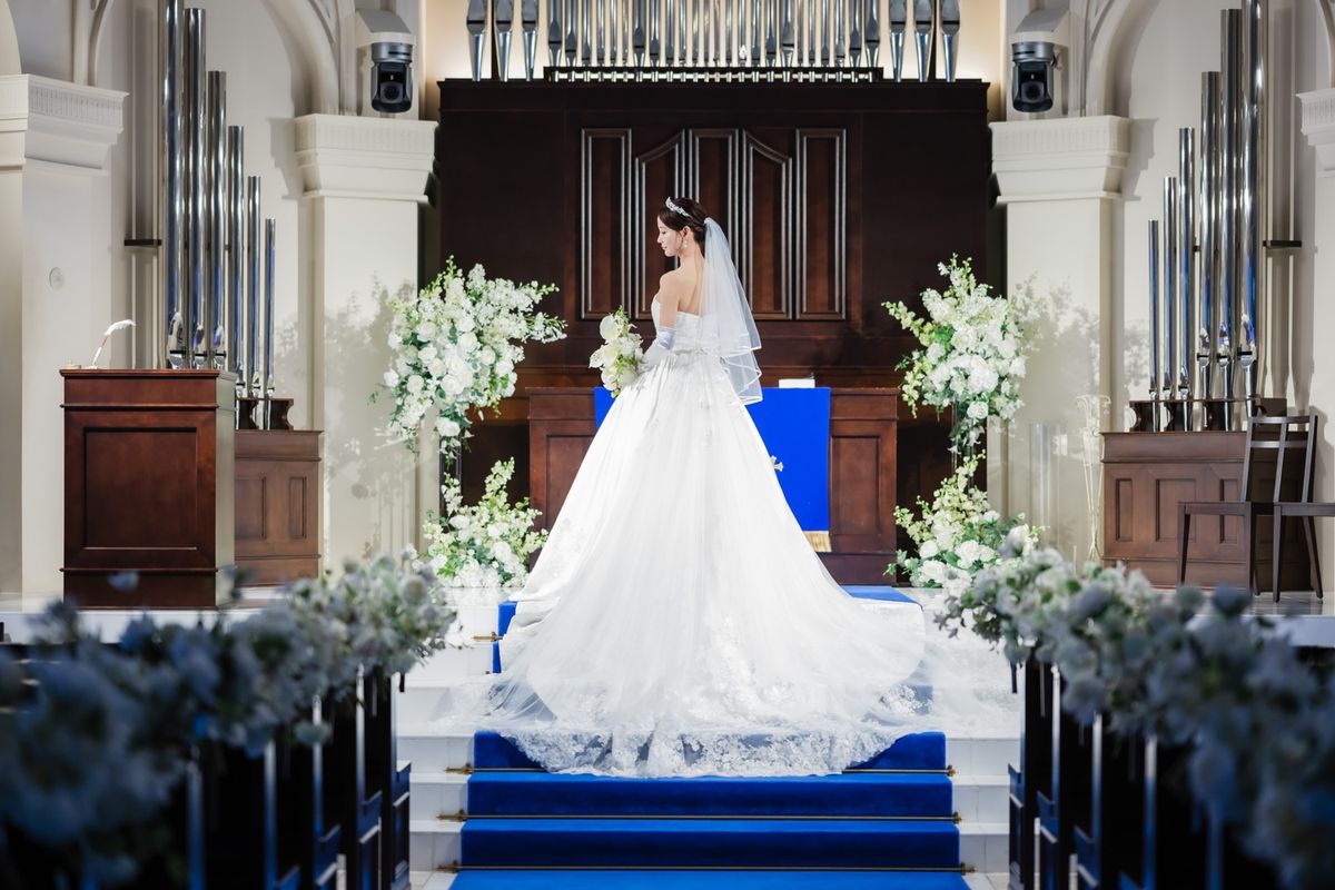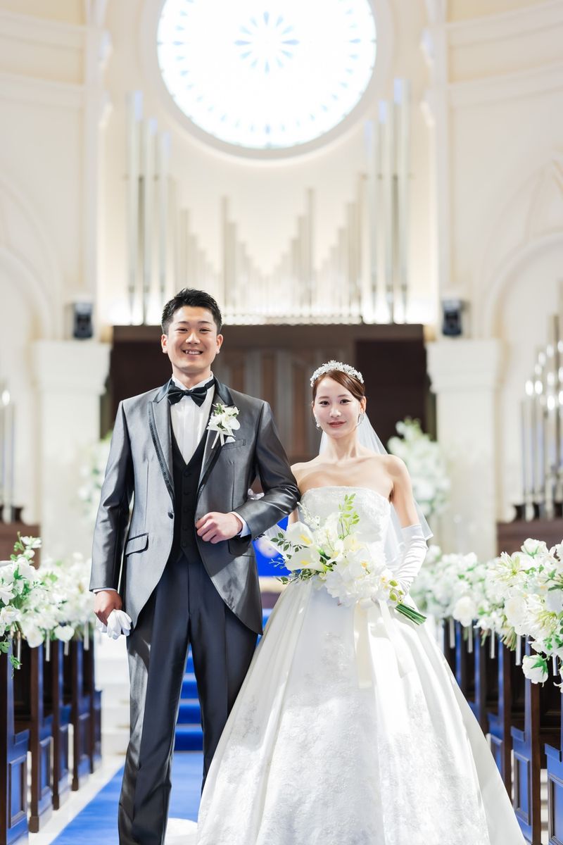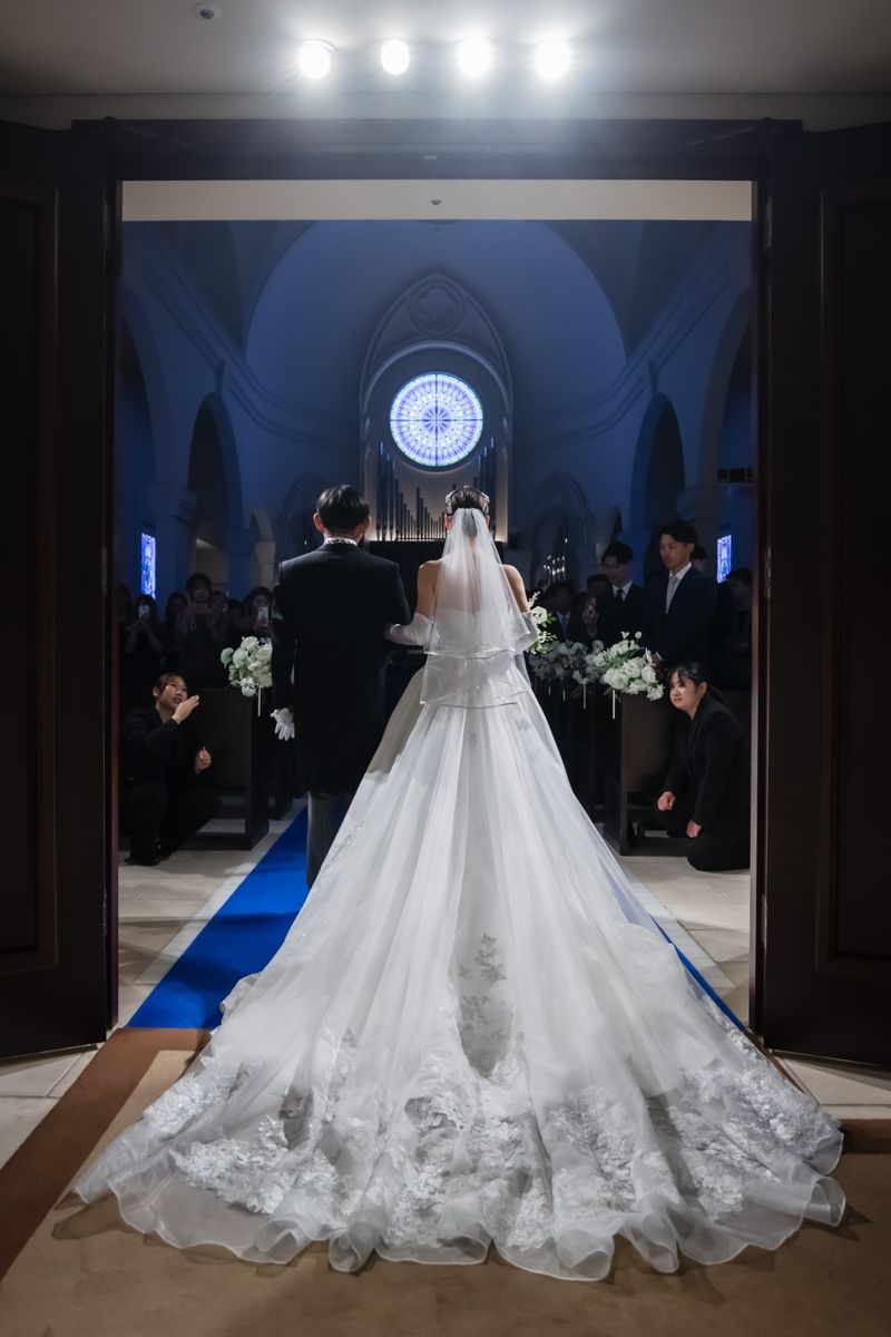 一目惚れした青のバージンロードが純白のドレスを美しく引き立て、ゲストからも「とても綺麗!」と称賛の声が挙がりました。ドレスはツヤのある生地とレースがお気に入りという一着で、キラキラとしたアクセサリーを合わせていらっしゃいます。また、セレモニームービーを用いた演出は感謝を伝える場面をより感動的に彩り、印象的な時間に。写真映えする空間での誓いは、一生の思い出になったご様子です。