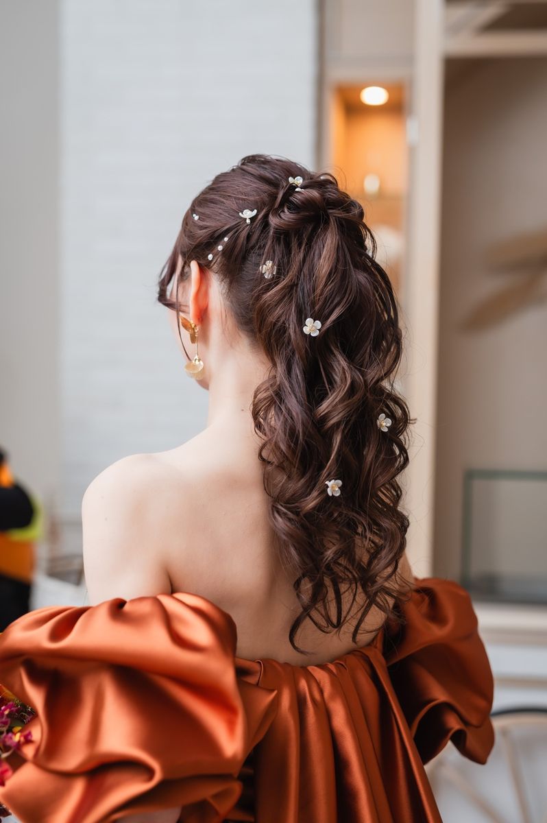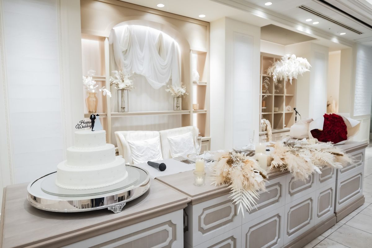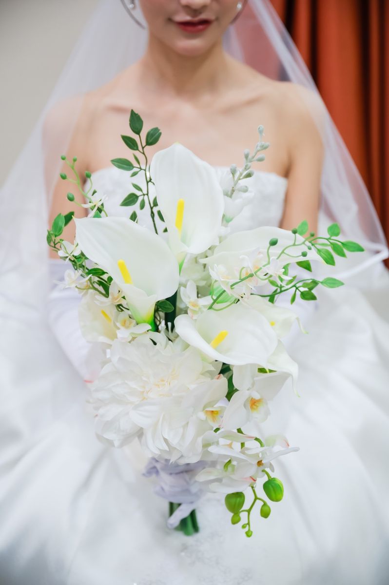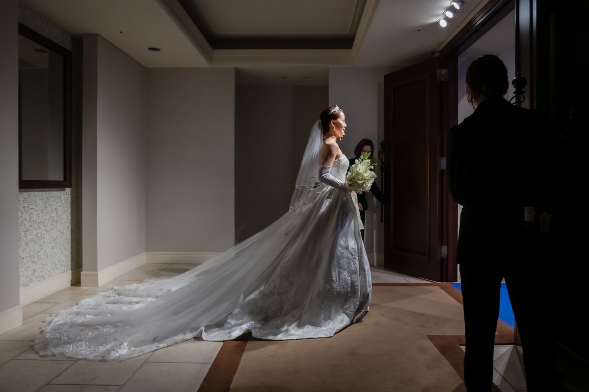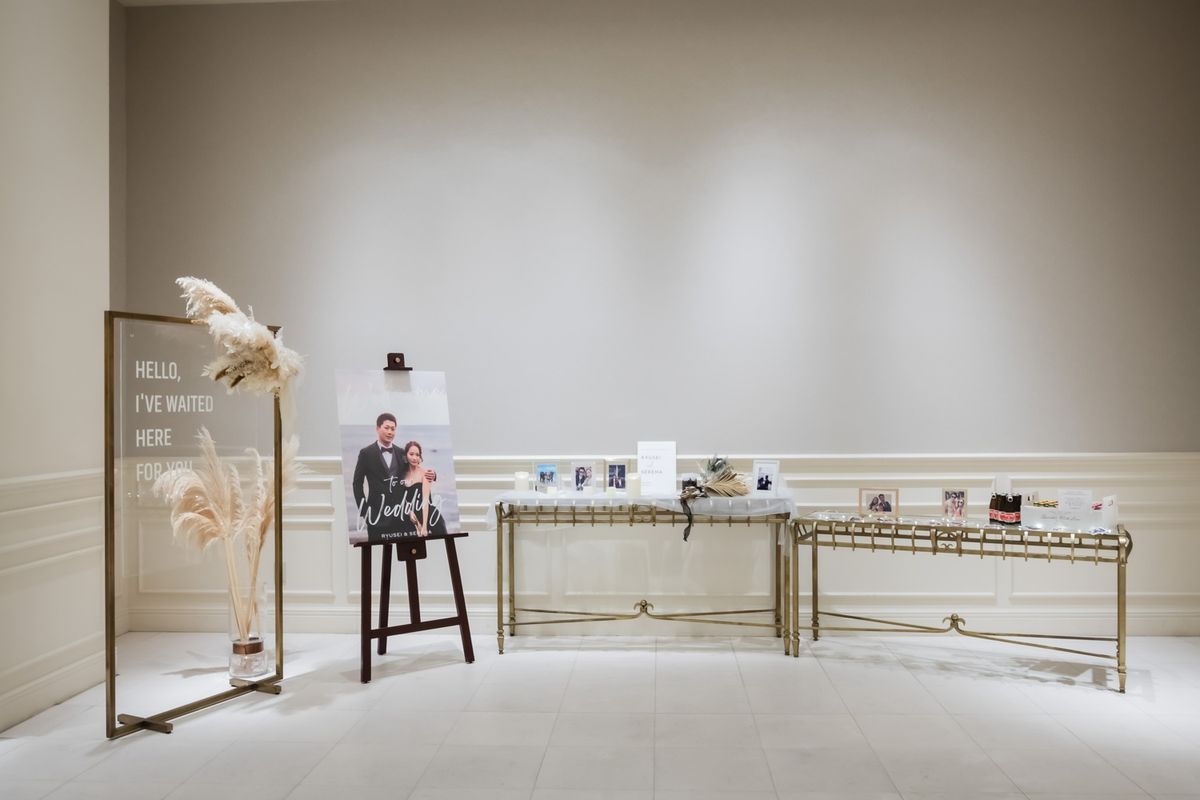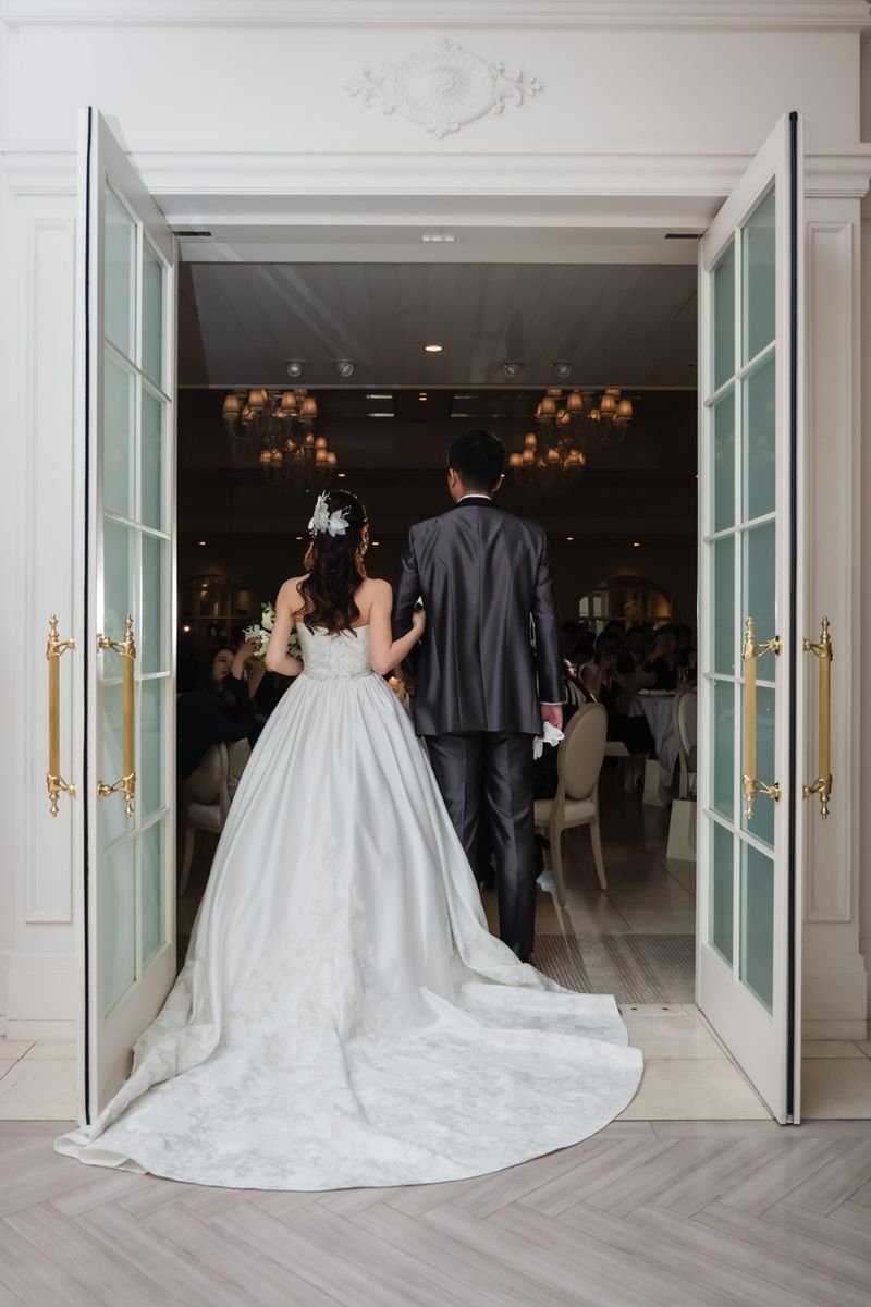 一目惚れした青のバージンロードが純白のドレスを美しく引き立て、ゲストからも「とても綺麗!」と称賛の声が挙がりました。ドレスはツヤのある生地とレースがお気に入りという一着で、キラキラとしたアクセサリーを合わせていらっしゃいます。また、セレモニームービーを用いた演出は感謝を伝える場面をより感動的に彩り、印象的な時間に。写真映えする空間での誓いは、一生の思い出になったご様子です。