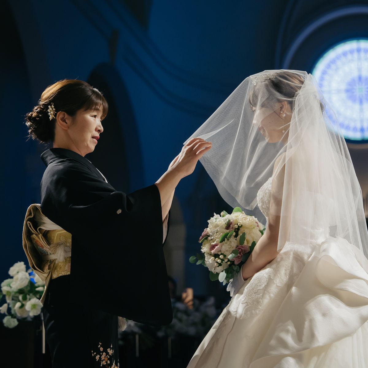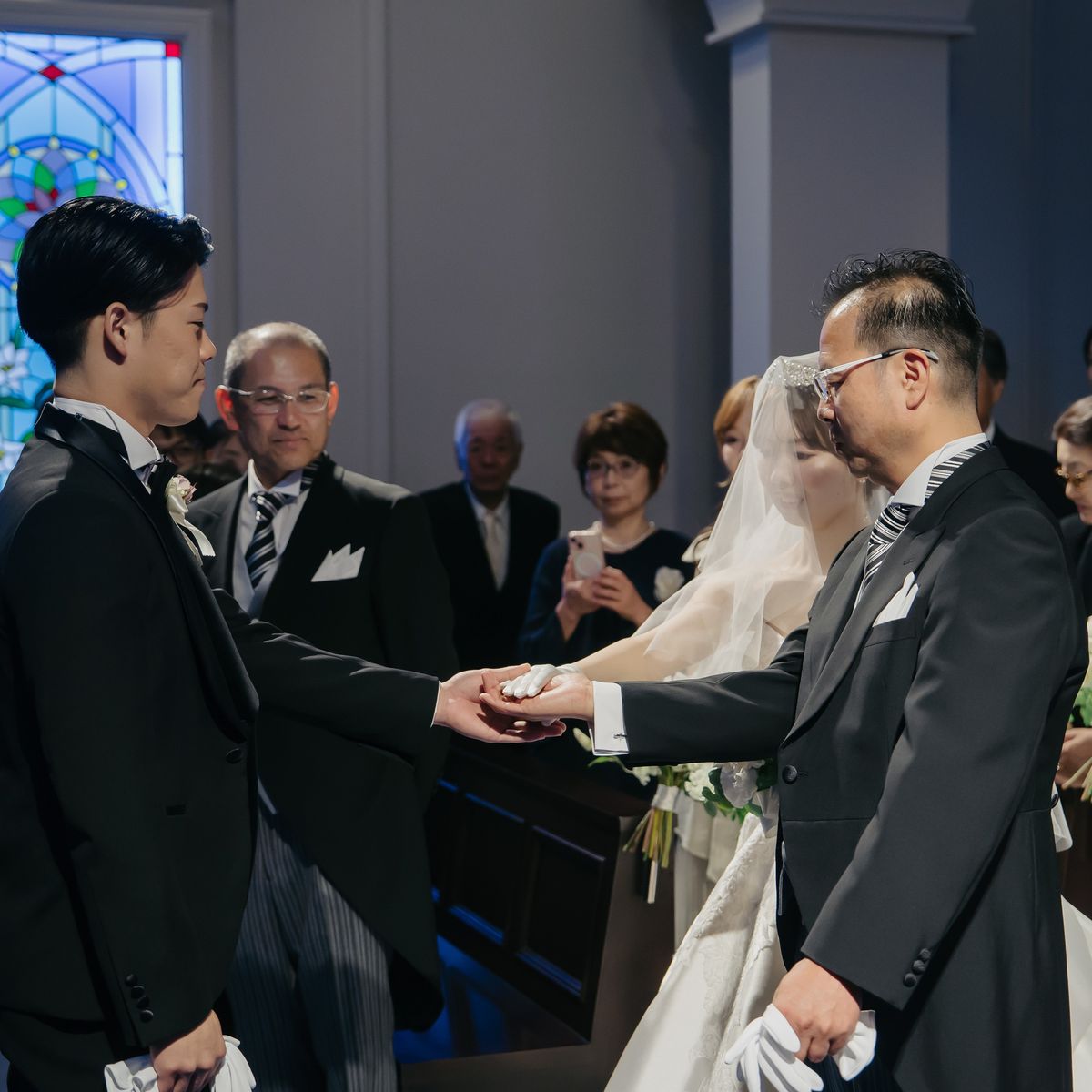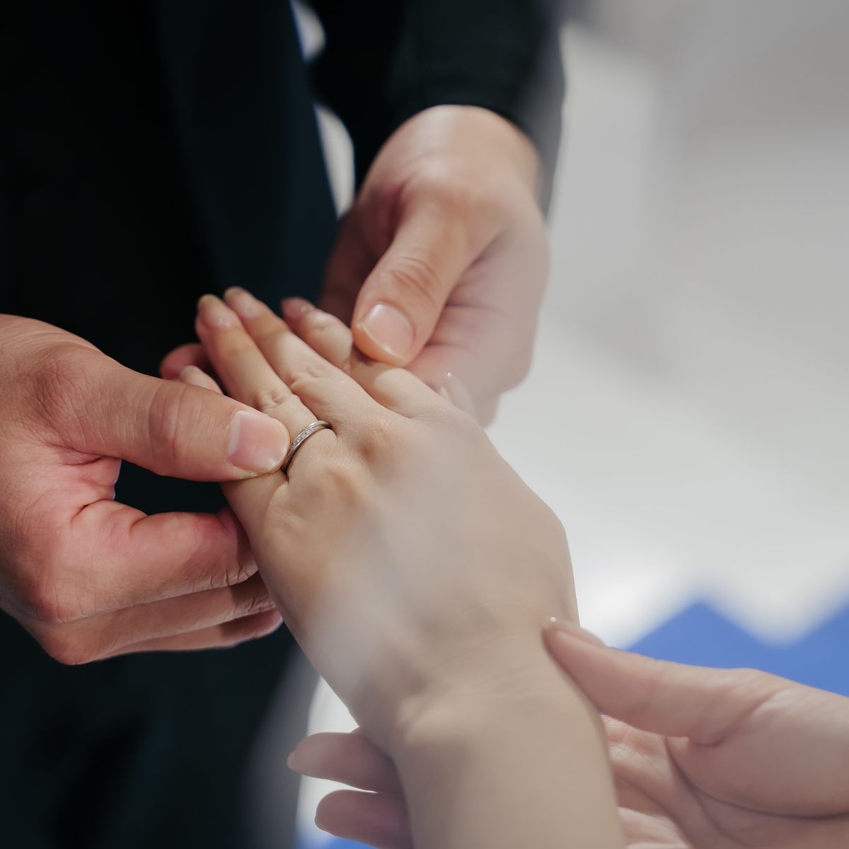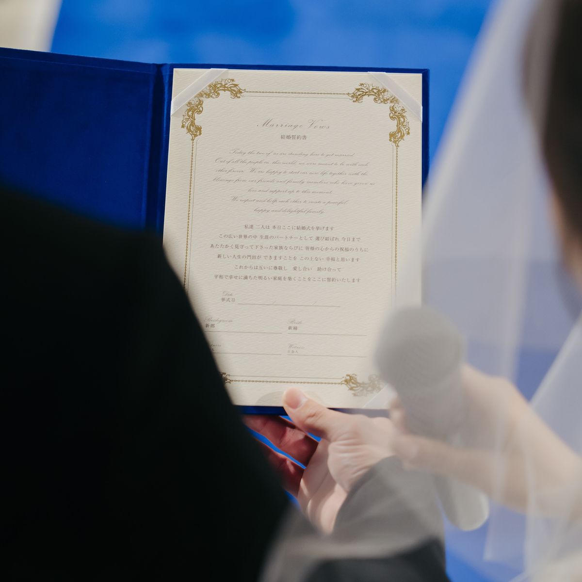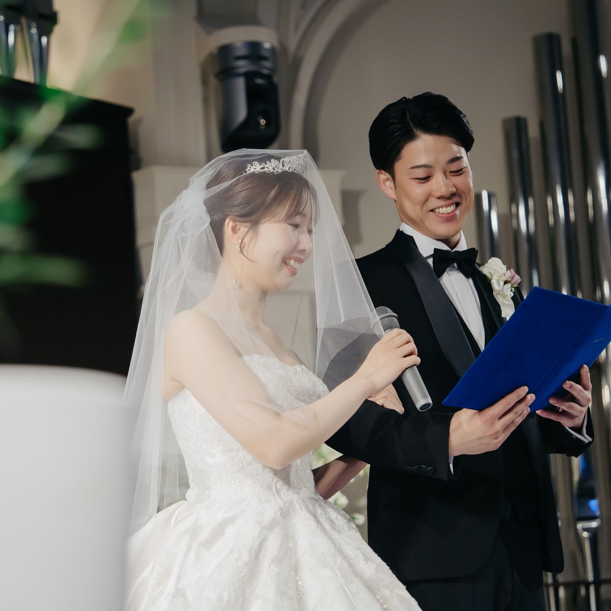 挙式の舞台は、ご新婦が一目惚れされて式場選びの決め手にもなったという青いバージンロードのチャペルです。後ろのレースの刺繍がお気に入りという純白のドレスが映え、幻想的な雰囲気の中で愛を誓われました。シンプルなシニヨンスタイルとティアラが花嫁姿をより一層引き立て、美しく感動的な時間に。ゲストの皆様も「綺麗だった!」と絶賛された、忘れられない瞬間です。