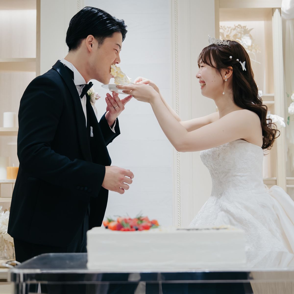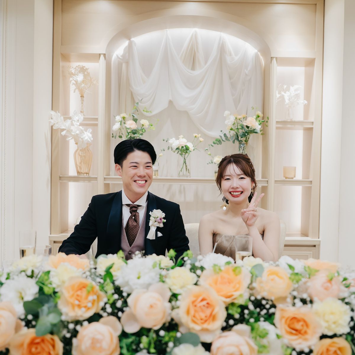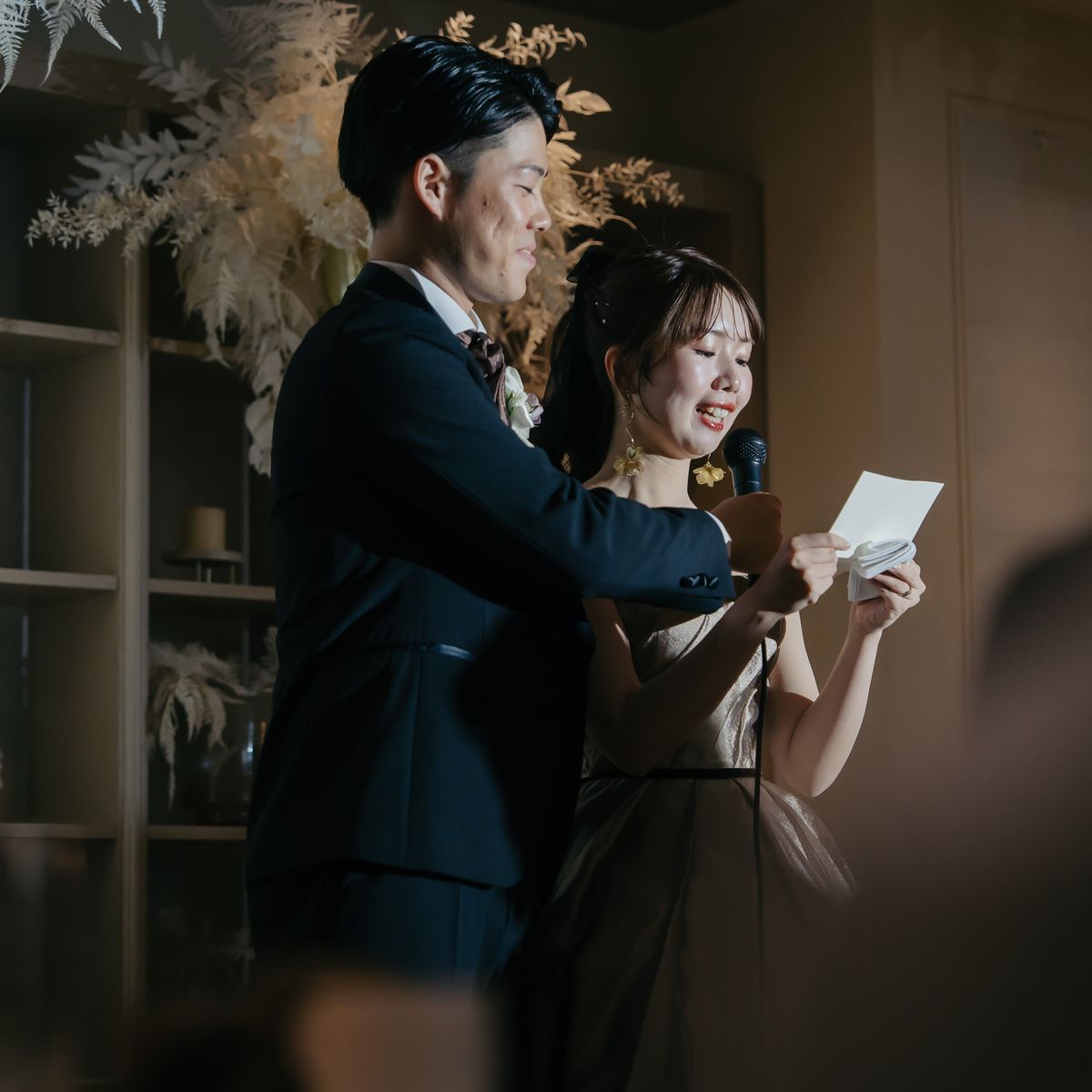 おもてなし面では「美味しい料理でゲストを喜ばせたい」という強い想いのもと、生ハムを切り分ける演出やチョコフォンデュを含むデザートビュッフェ、和の味付けを取り入れたメニューなど、幅広い年代に楽しんでいただける内容に。趣向を凝らしたおもてなしに、おふたりの感謝の気持ちが込められていました。両親へのお手紙のシーンでは会場全体が感動の渦に包まれ、多くのゲストが涙する温かな時間となりました。