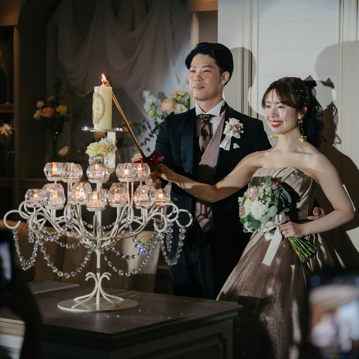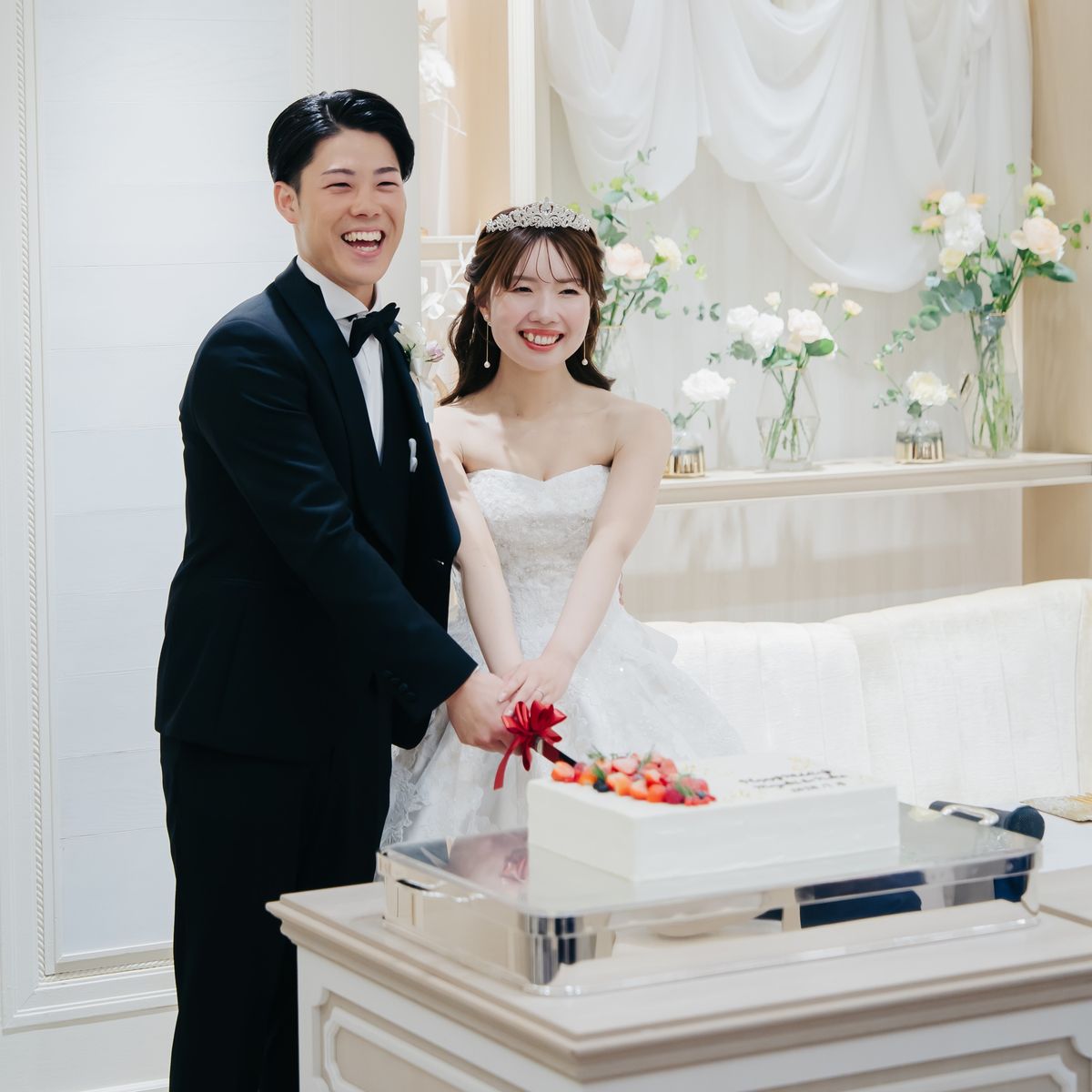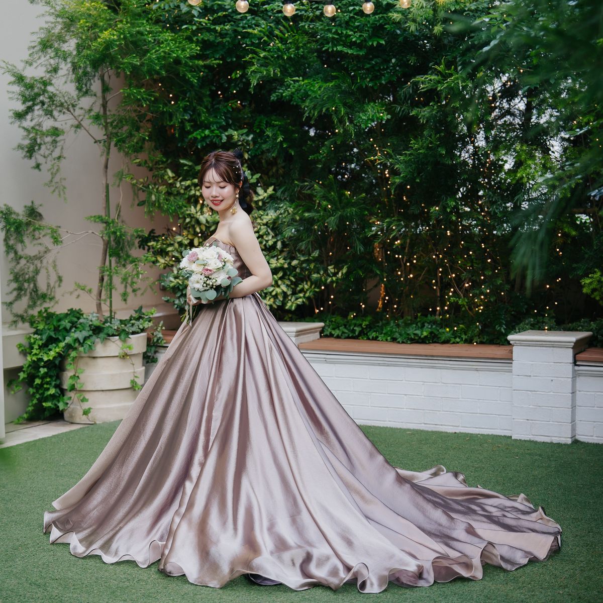 会場にはガーデンが併設されておりますので、屋内外で写真映えするシーンを多彩に楽しんでいただきました。白を基調とした会場は、緑と白をベースに薄いピンクをあしらったフラワーアレンジが映え、華やかな雰囲気のパーティとなりました。再入場のドレスチェンジに合わせたカラー当てクイズやキャンドルの演出なども取り入れ、ゲスト皆様の溢れる笑顔が印象に残っています。