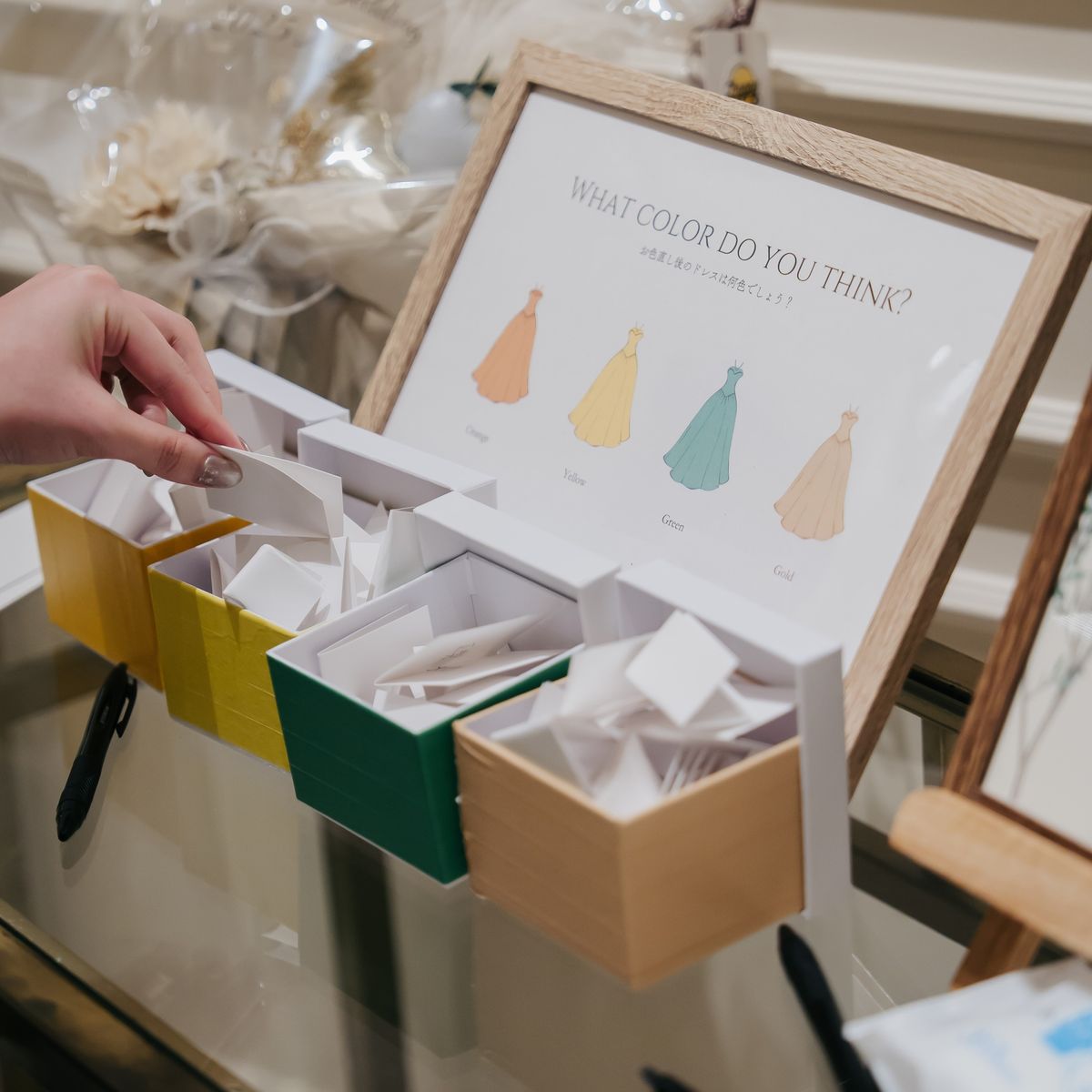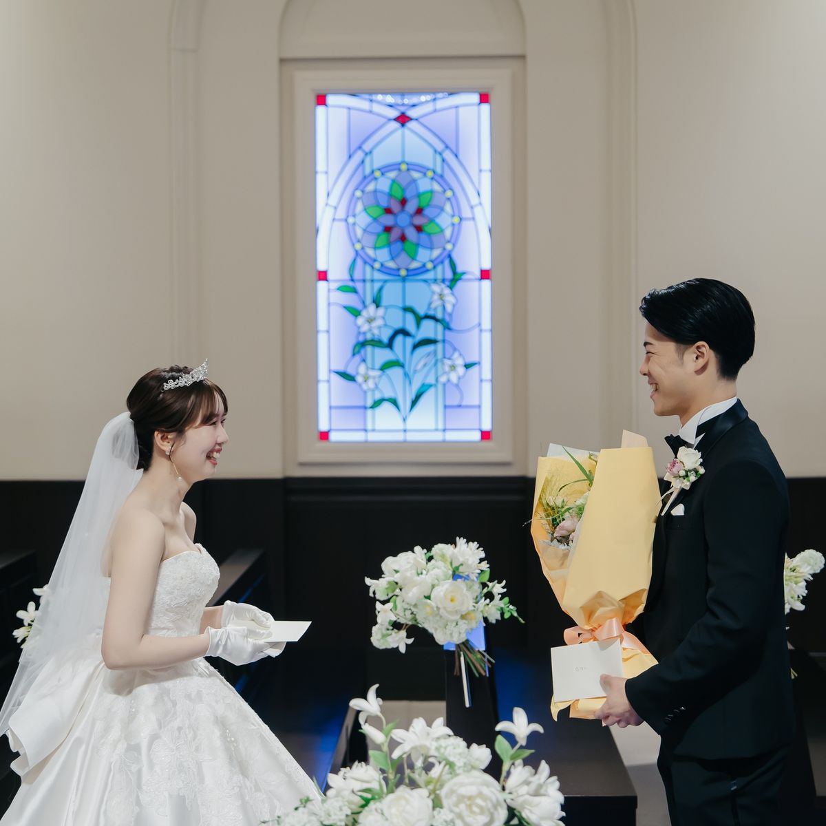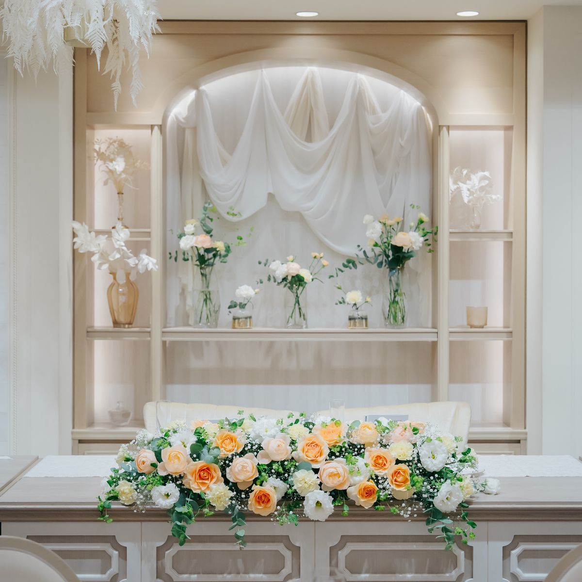 会場にはガーデンが併設されておりますので、屋内外で写真映えするシーンを多彩に楽しんでいただきました。白を基調とした会場は、緑と白をベースに薄いピンクをあしらったフラワーアレンジが映え、華やかな雰囲気のパーティとなりました。再入場のドレスチェンジに合わせたカラー当てクイズやキャンドルの演出なども取り入れ、ゲスト皆様の溢れる笑顔が印象に残っています。