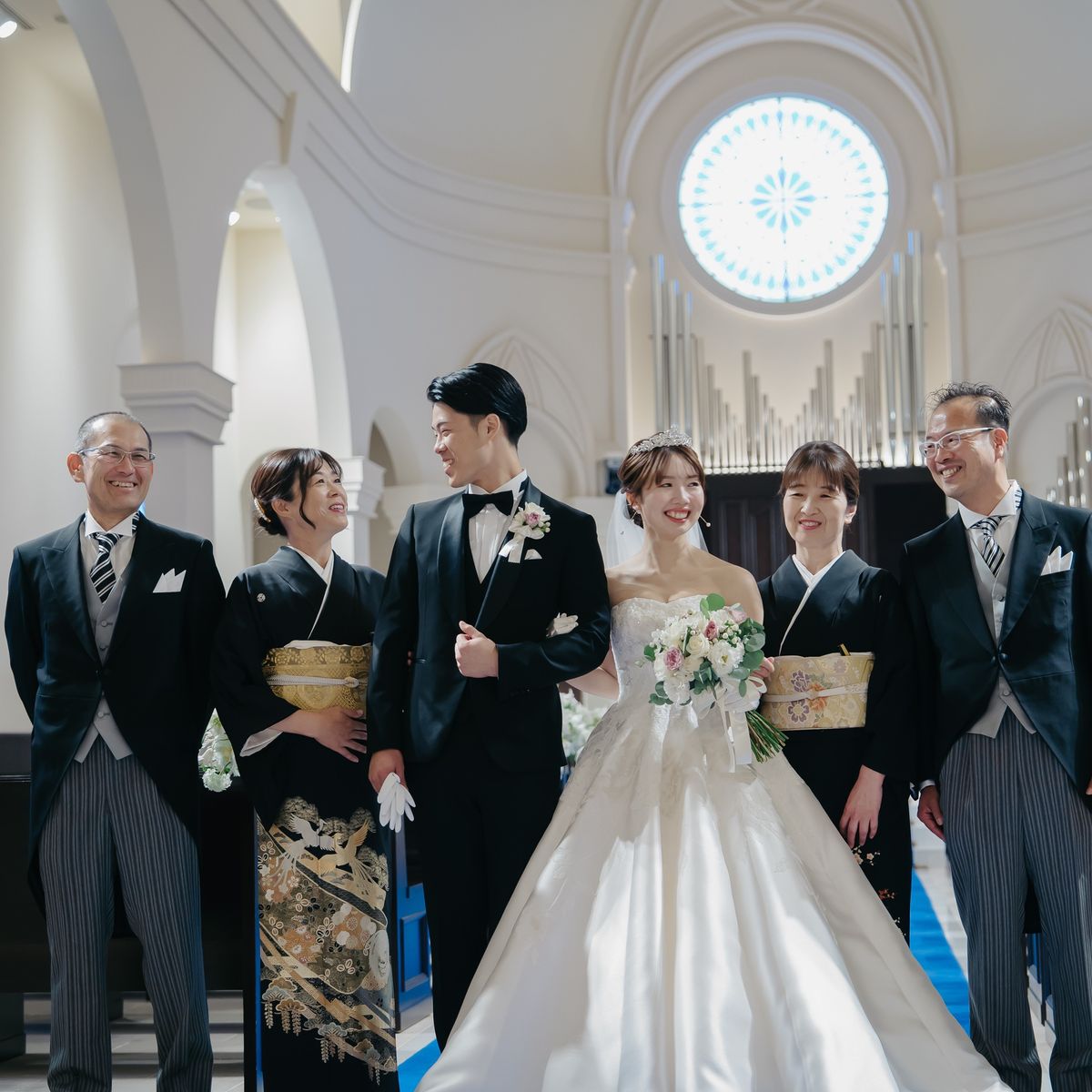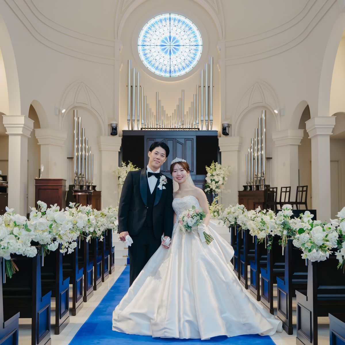 青いバージンロードのチャペルに惹かれたというふたり。ウェディングドレスが映える空間での挙式を叶えていただきました。また、こだわりのお料理でもてなし、ゲストの皆様と共に楽しむ笑顔と感動にあふれる結婚式となりました。