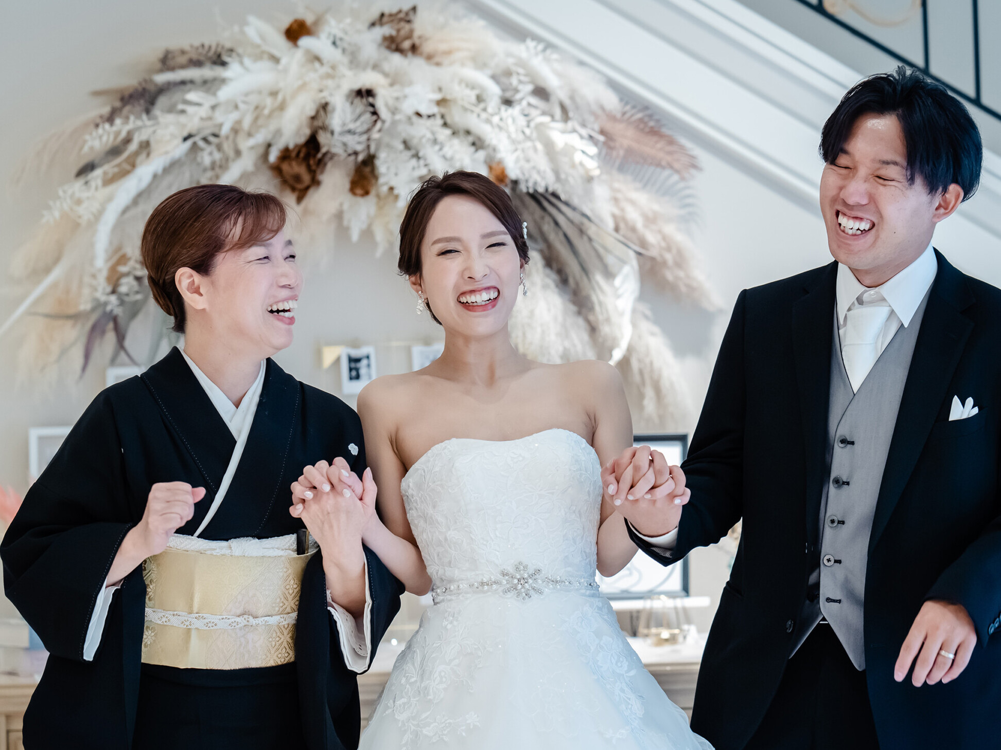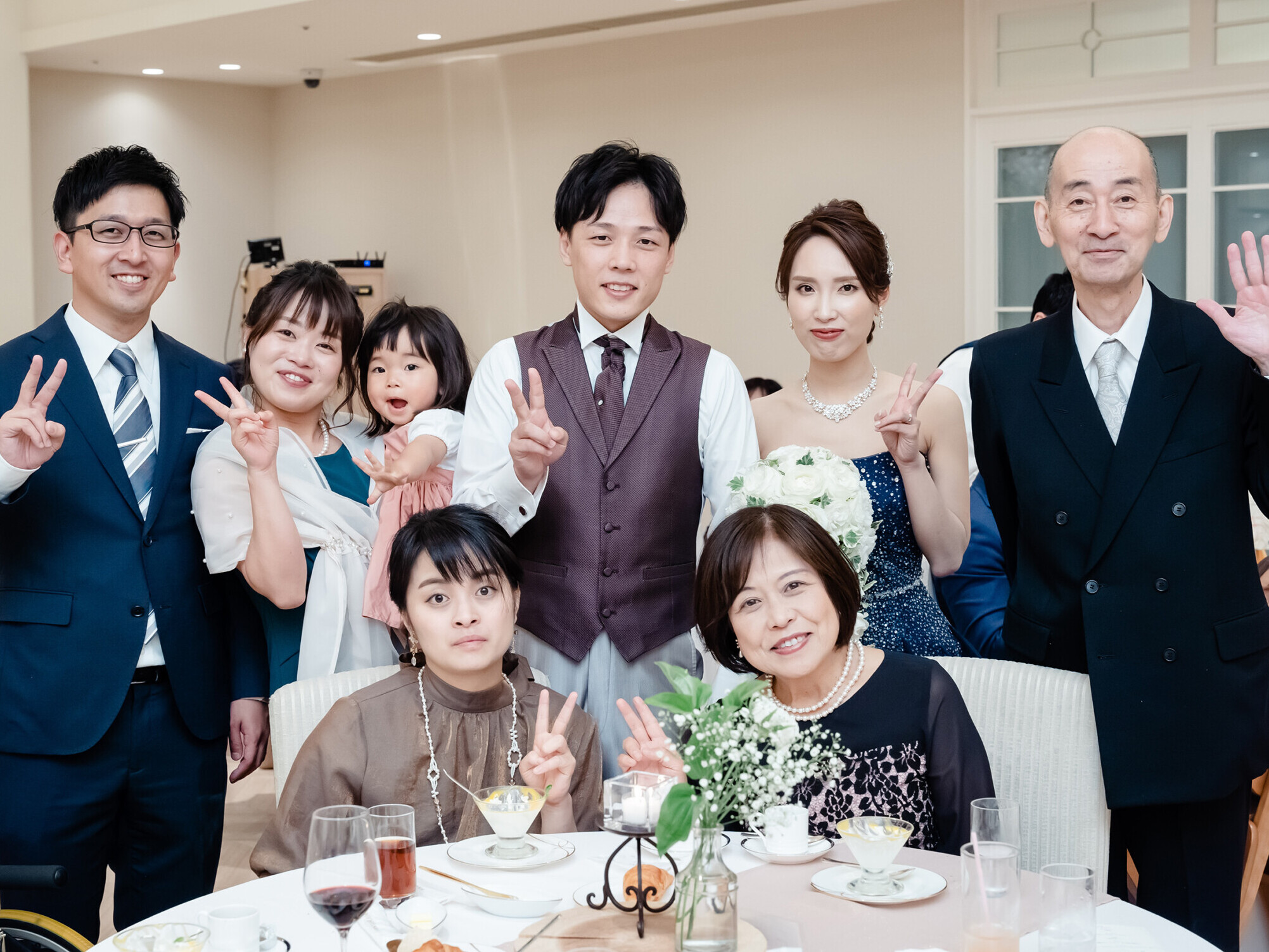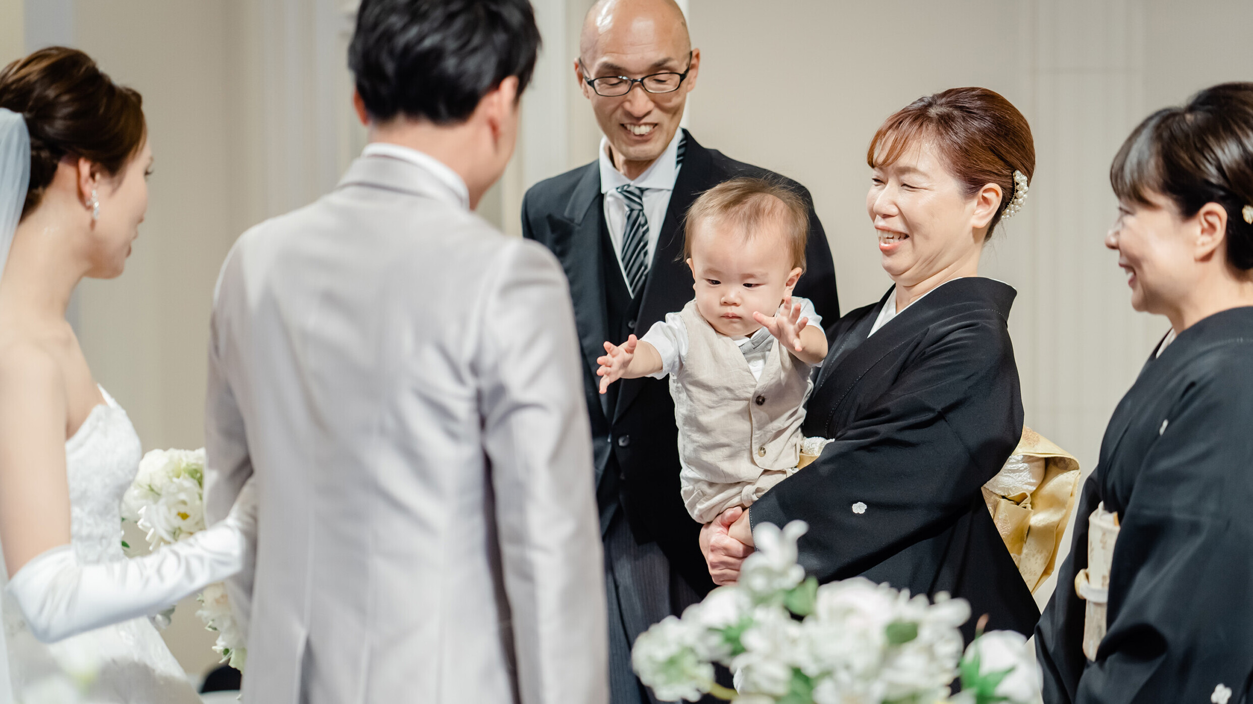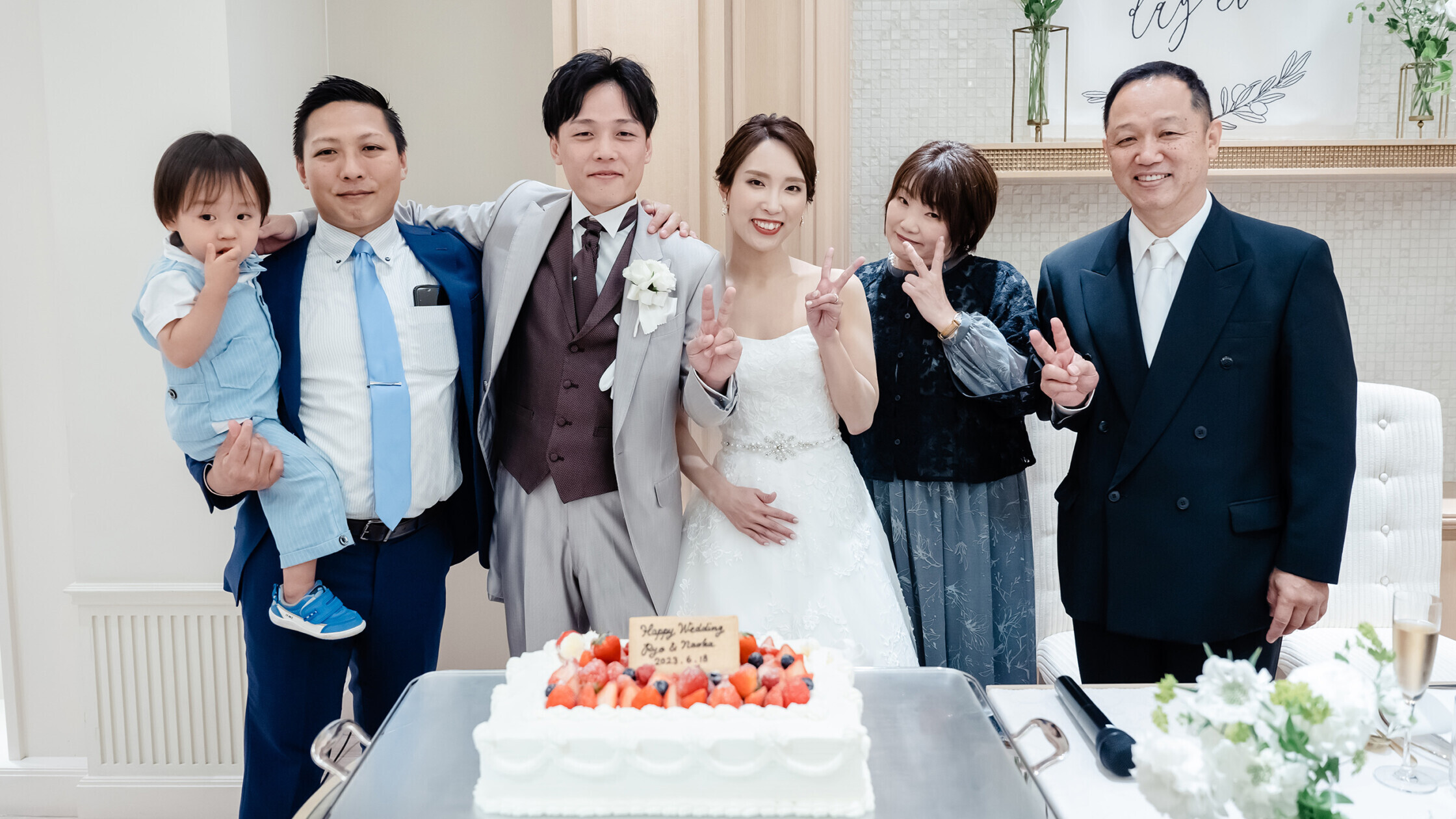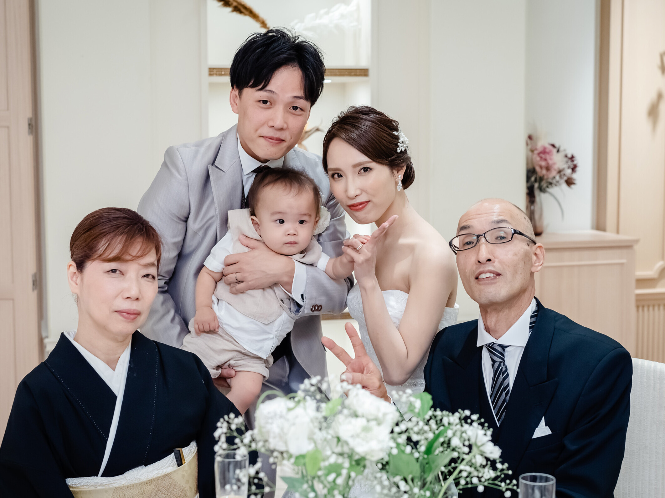 「親御様にドレス姿を直接みてもらいたい」 そんな想いから結婚式をすることを決めたおふたり 挙式の前にファミリーミートを行い、 誰よりも先にドレス姿を見てもらうことにしました 挙式や披露宴ではゲストとの距離が近づくような演出を入れて 写真タイムもしっかり取り、思い出が沢山残せる時間づくりを意識しました