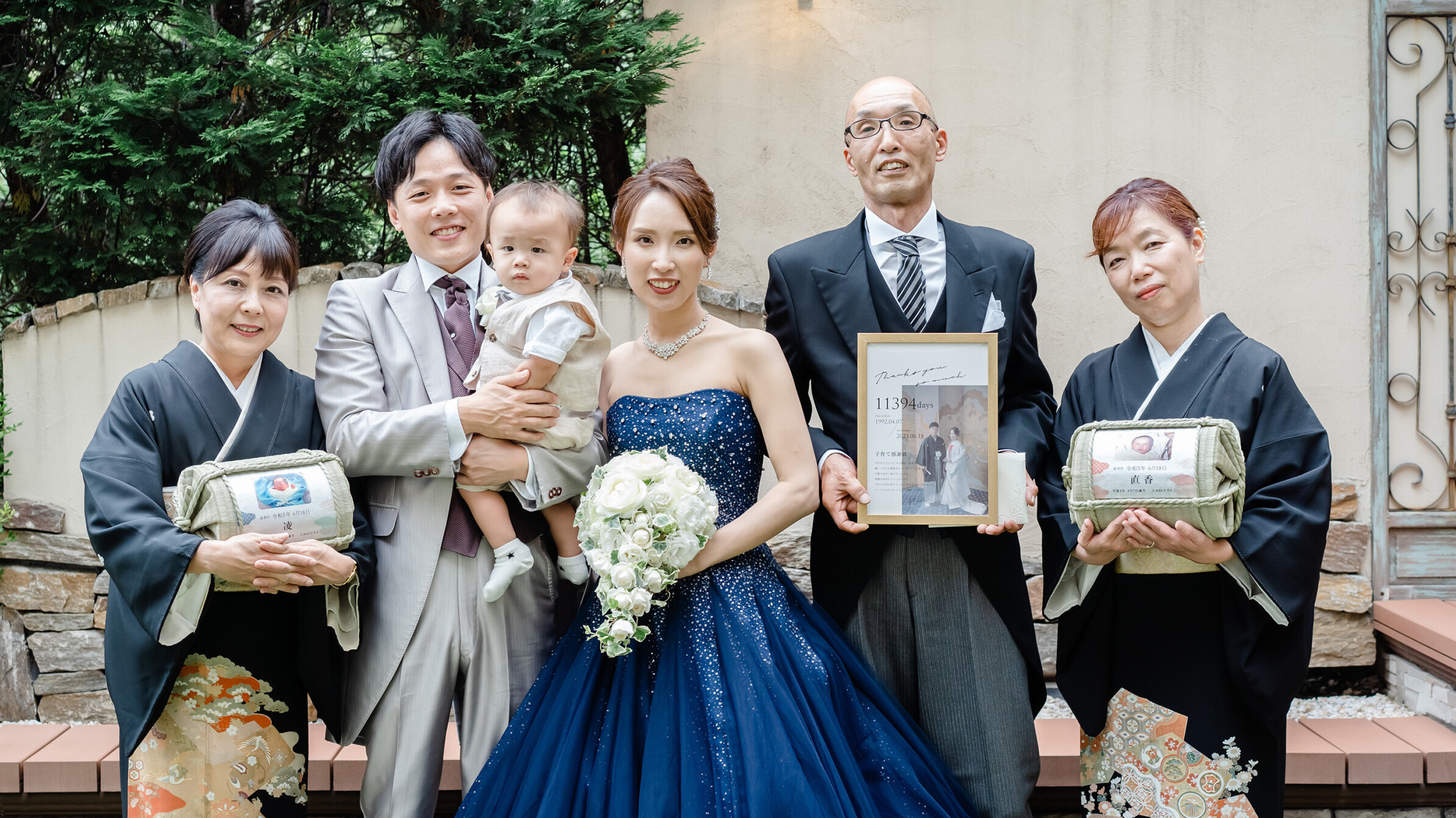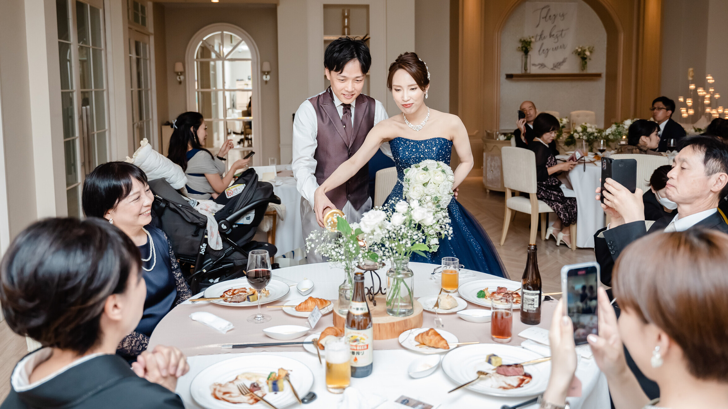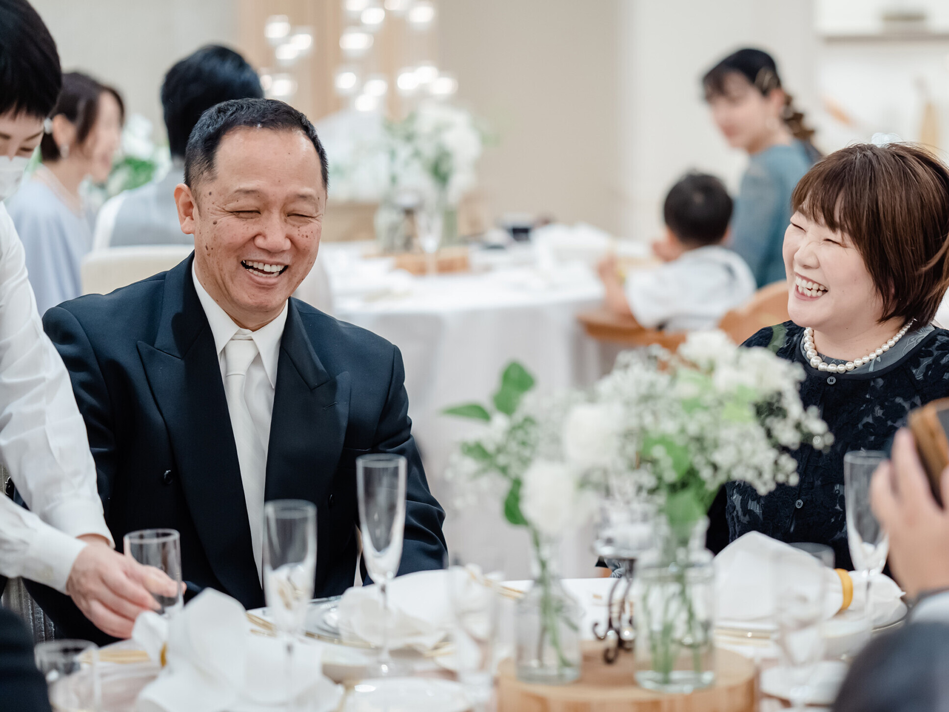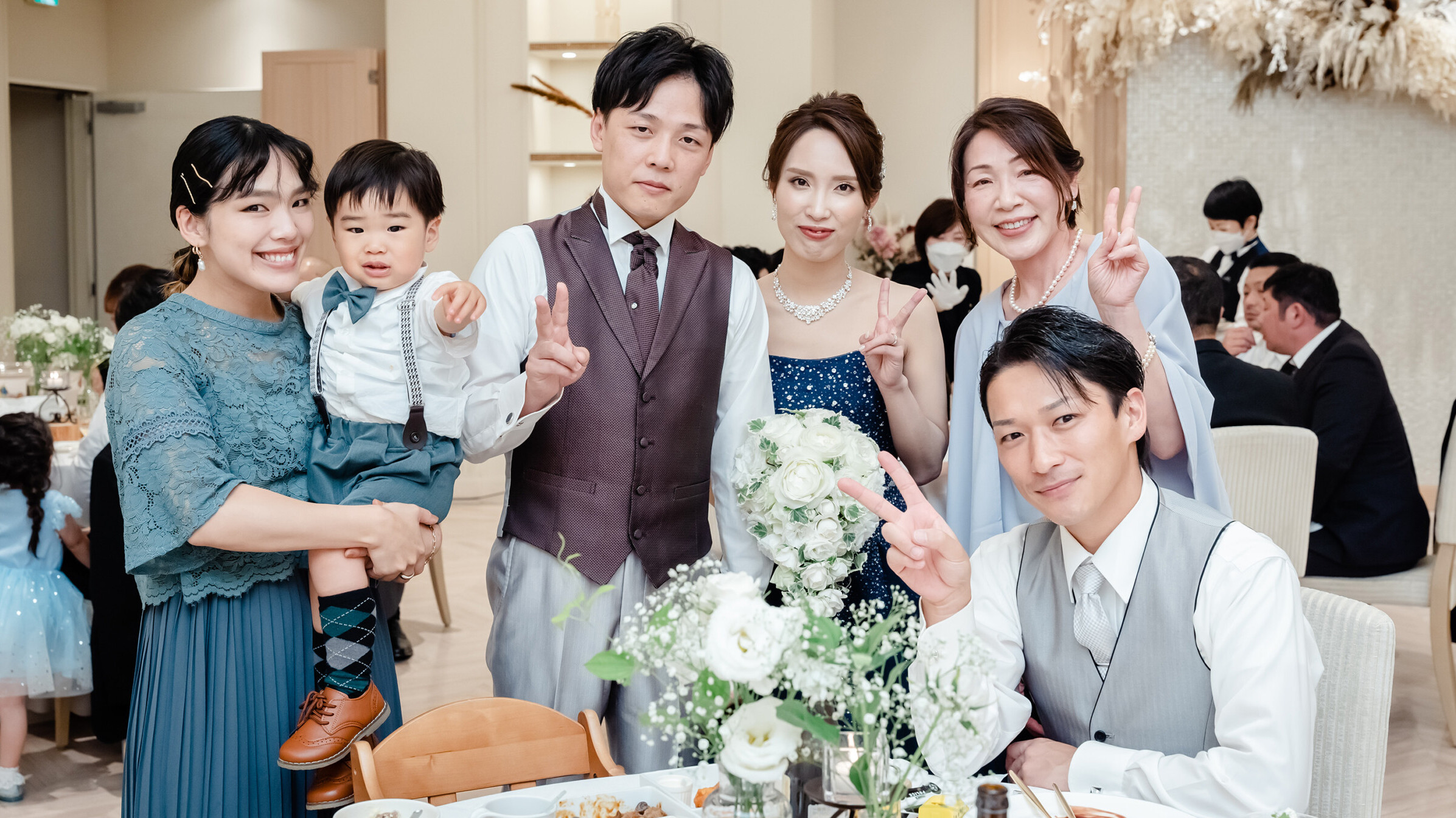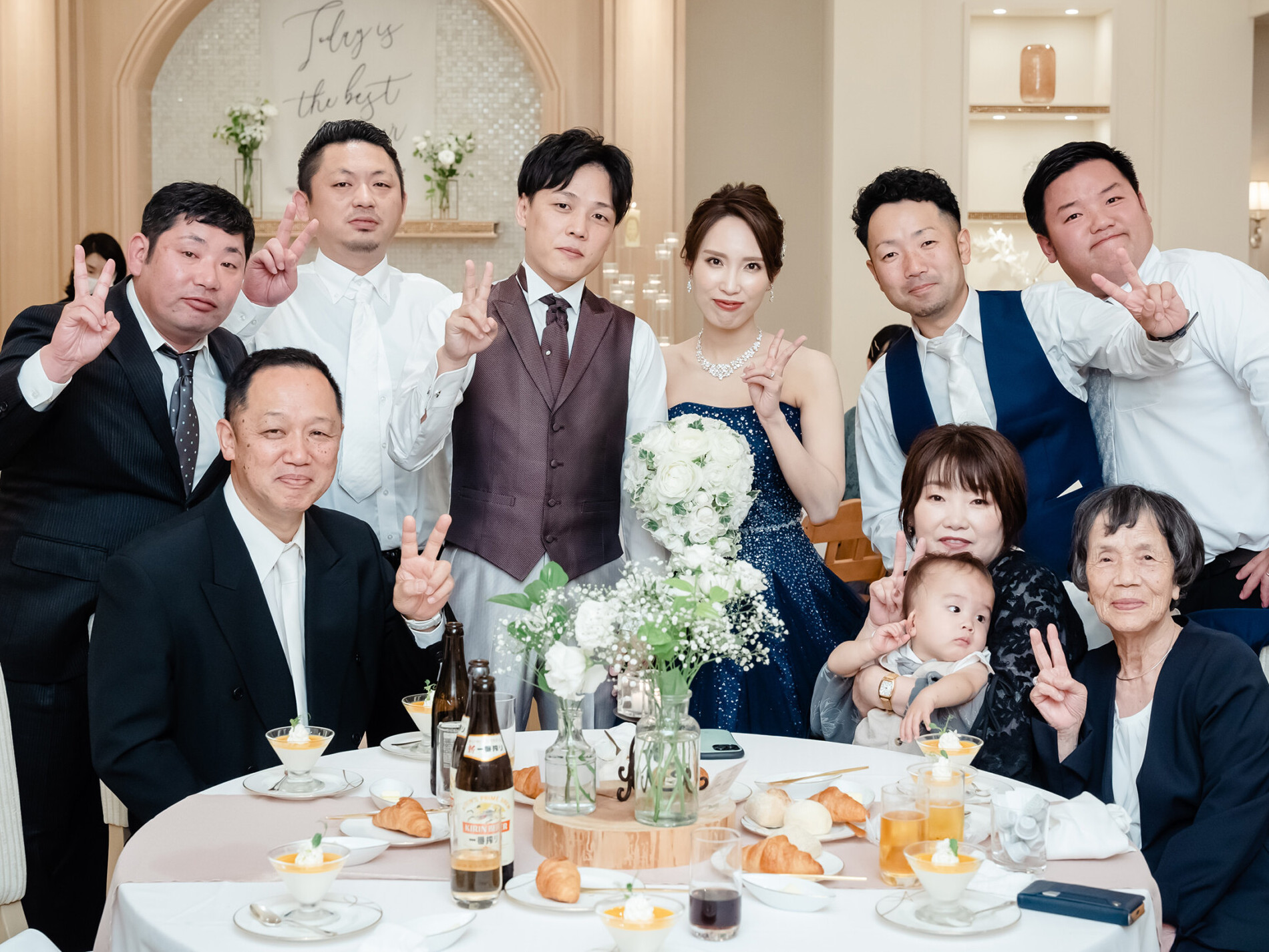 「親御様にドレス姿を直接みてもらいたい」 そんな想いから結婚式をすることを決めたおふたり 挙式の前にファミリーミートを行い、 誰よりも先にドレス姿を見てもらうことにしました 挙式や披露宴ではゲストとの距離が近づくような演出を入れて 写真タイムもしっかり取り、思い出が沢山残せる時間づくりを意識しました