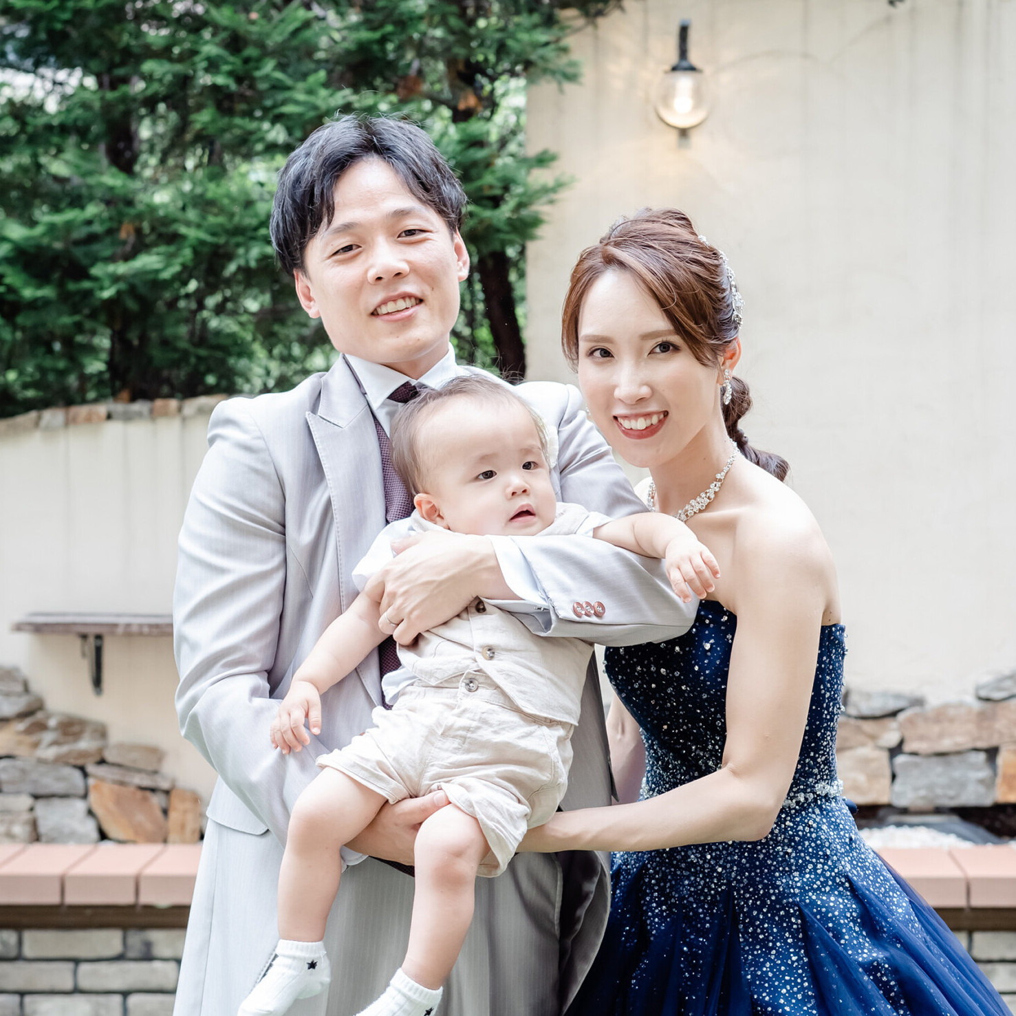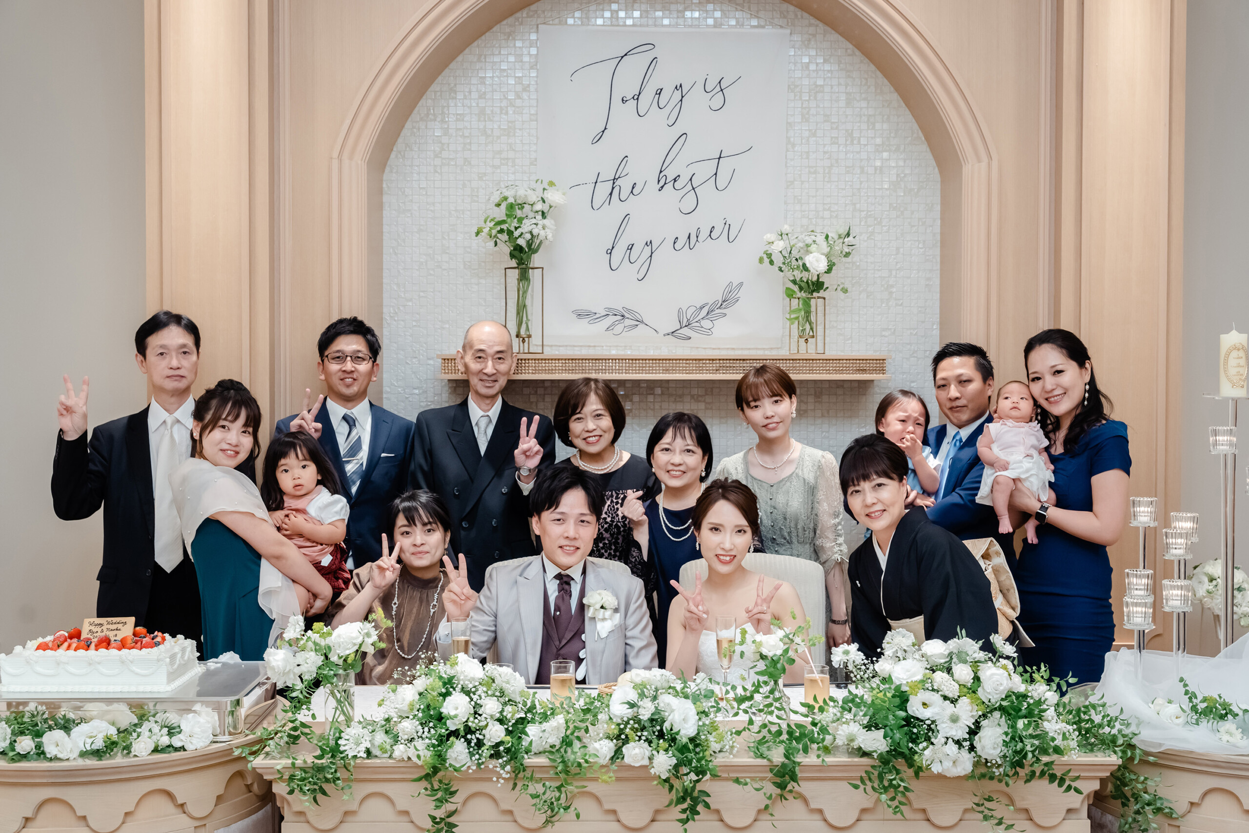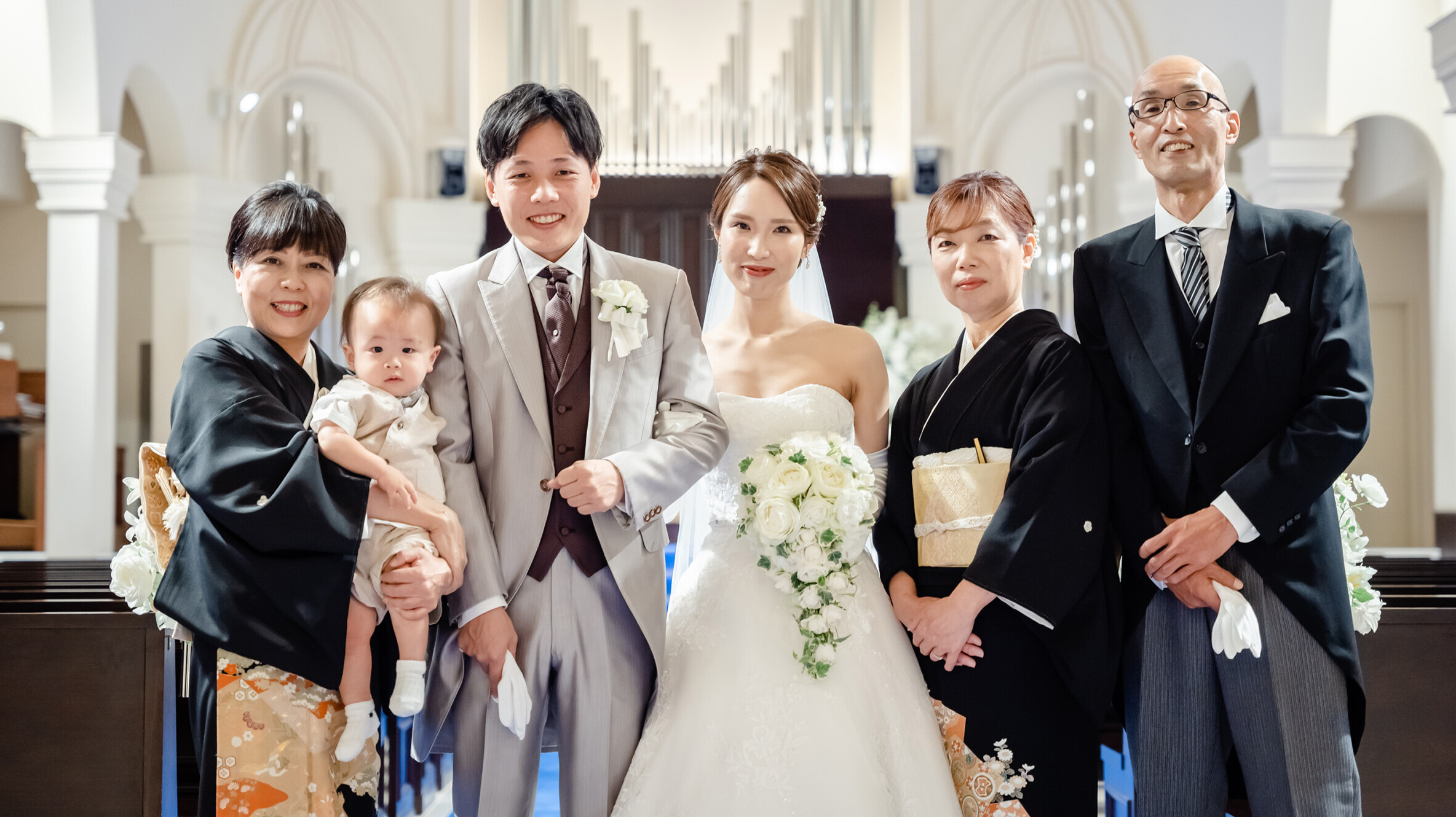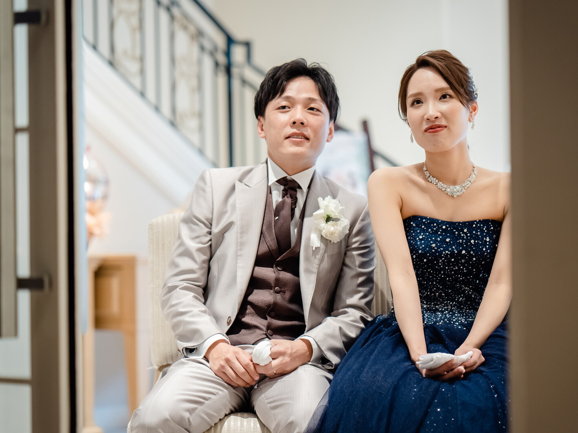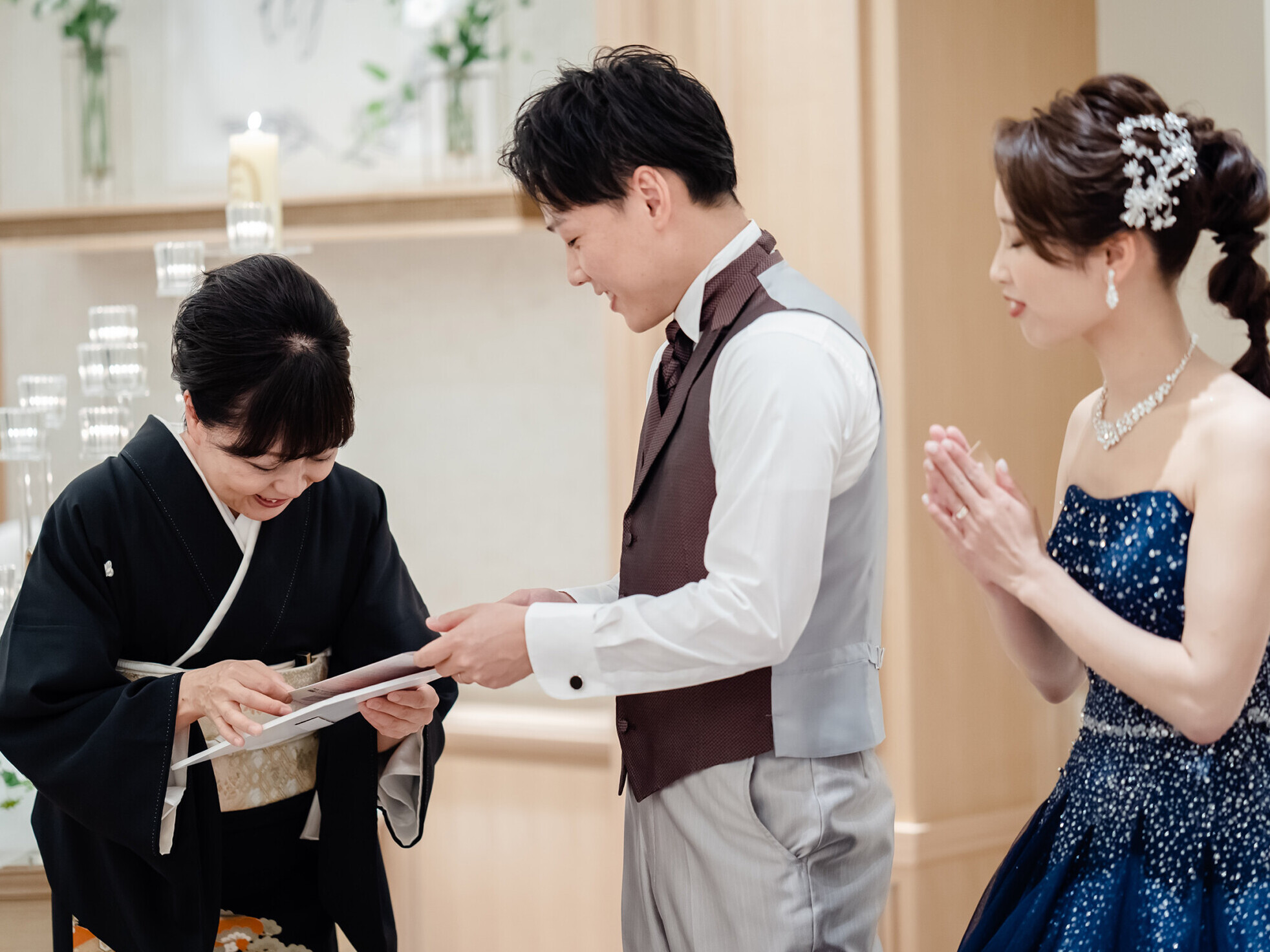 「親御様にドレス姿を直接みてもらいたい」 そんな想いから結婚式をすることを決めたおふたり 挙式の前にファミリーミートを行い、 誰よりも先にドレス姿を見てもらうことにしました 挙式や披露宴ではゲストとの距離が近づくような演出を入れて 写真タイムもしっかり取り、思い出が沢山残せる時間づくりを意識しました