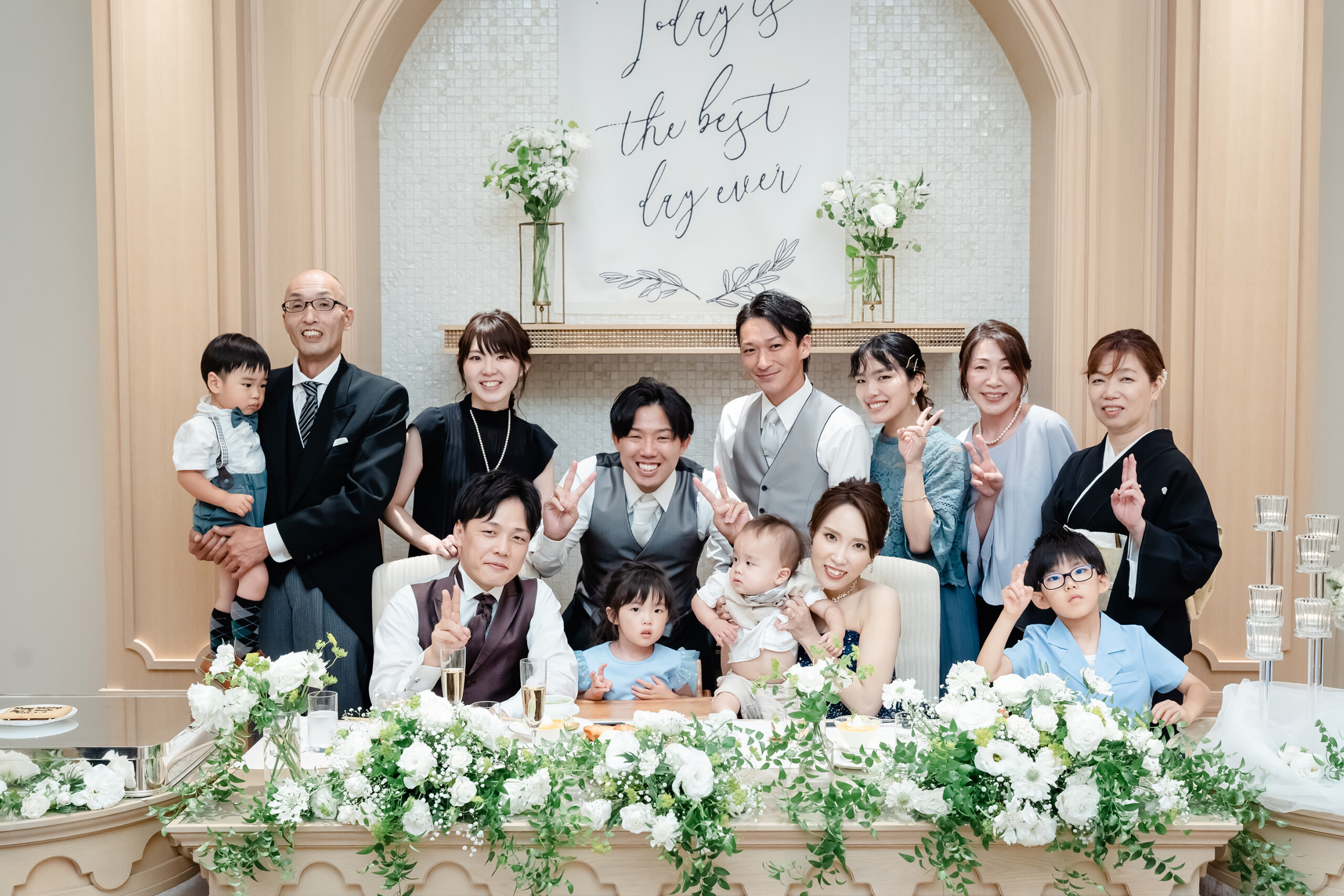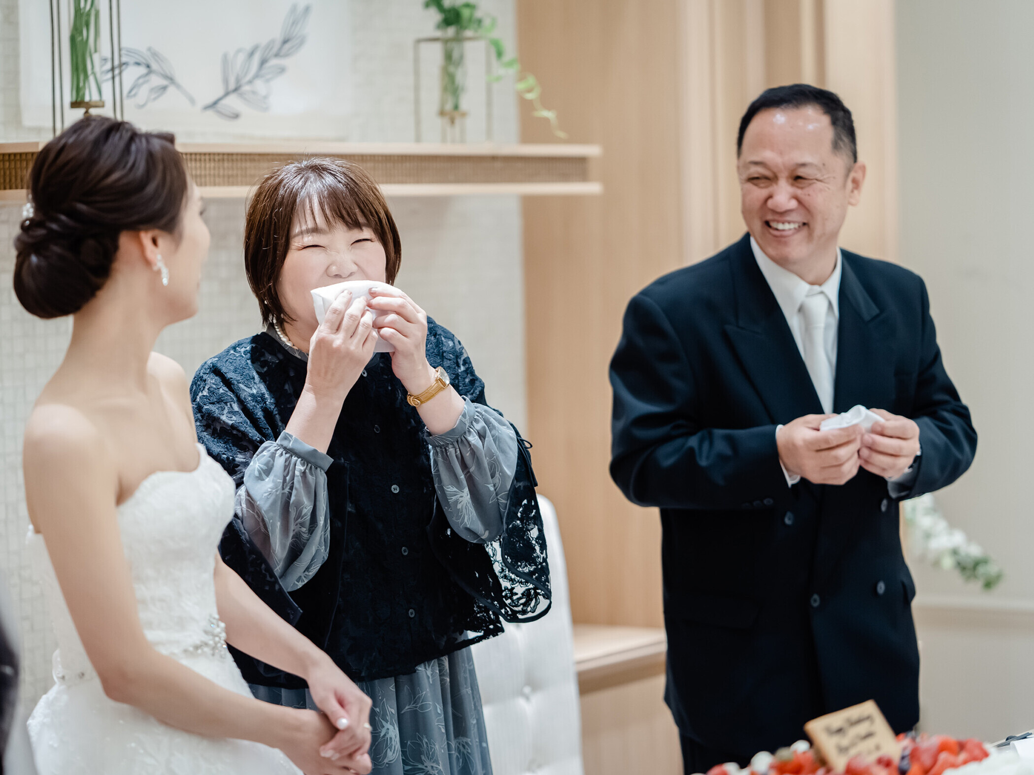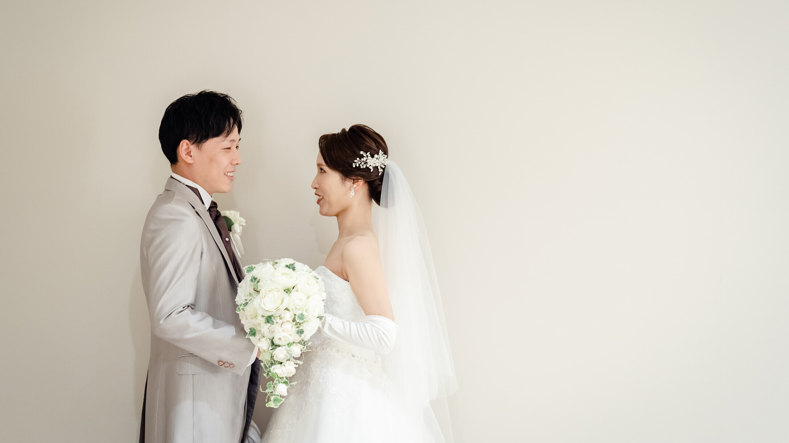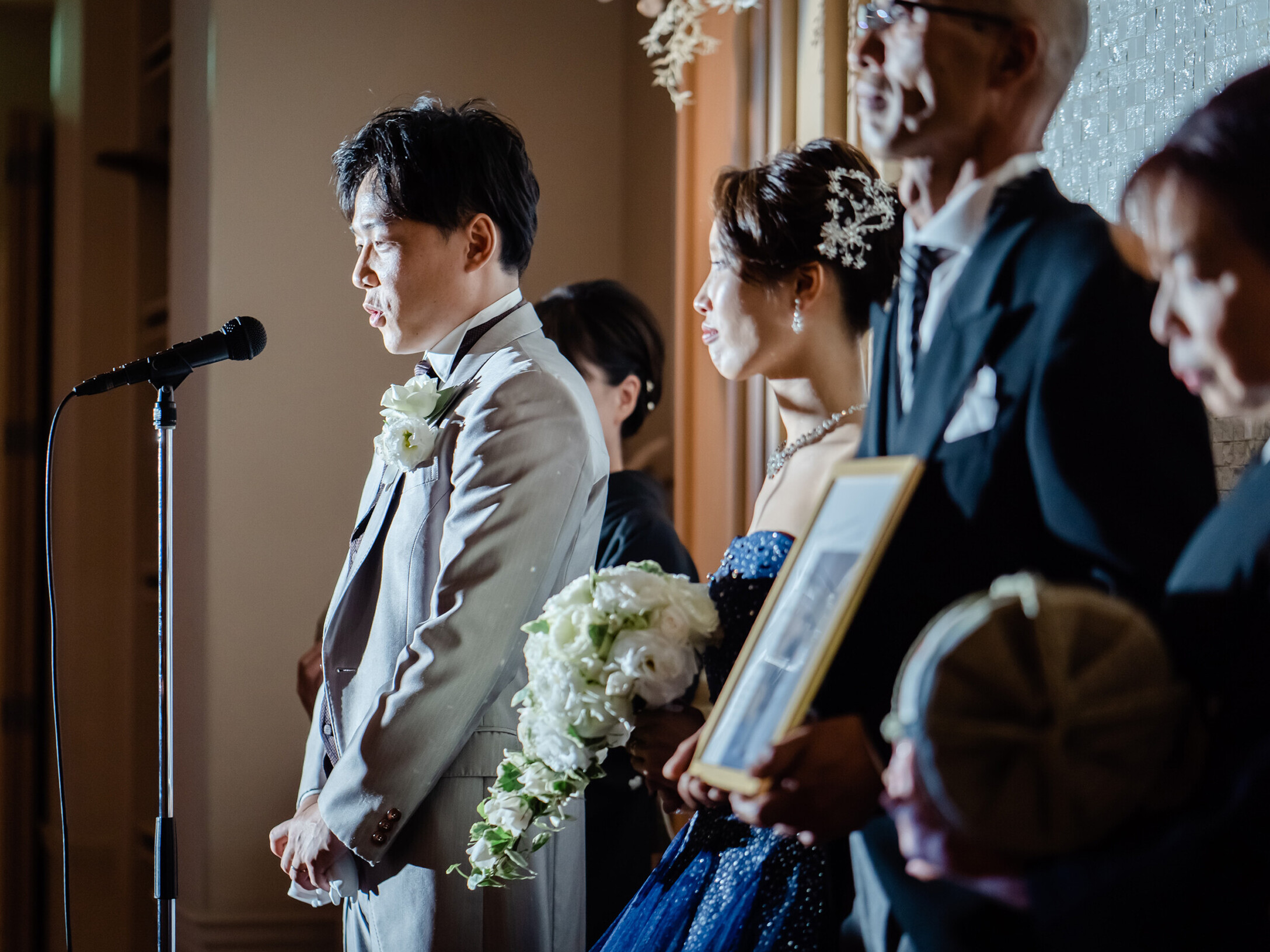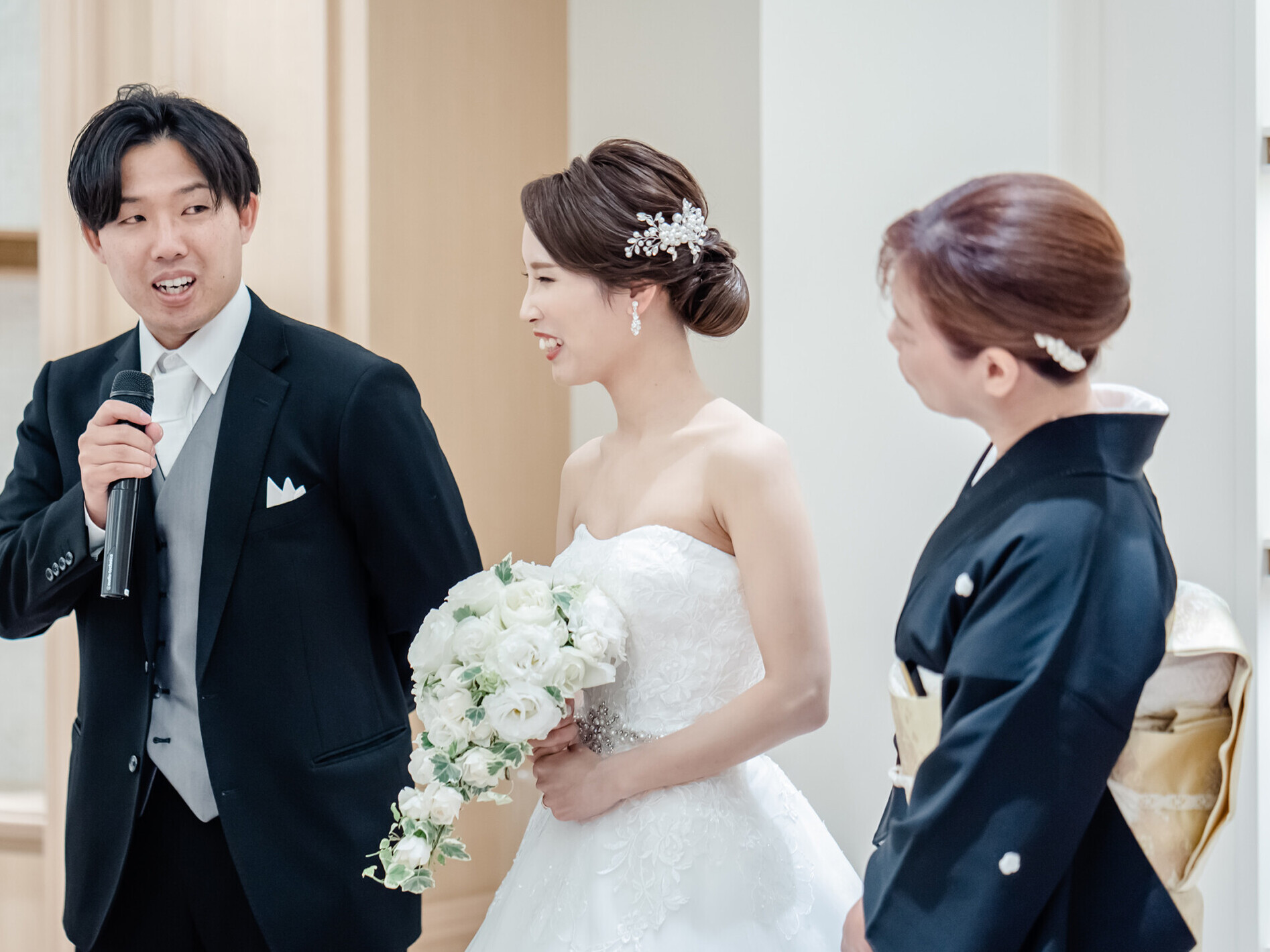 「親御様にドレス姿を直接みてもらいたい」 そんな想いから結婚式をすることを決めたおふたり 挙式の前にファミリーミートを行い、 誰よりも先にドレス姿を見てもらうことにしました 挙式や披露宴ではゲストとの距離が近づくような演出を入れて 写真タイムもしっかり取り、思い出が沢山残せる時間づくりを意識しました