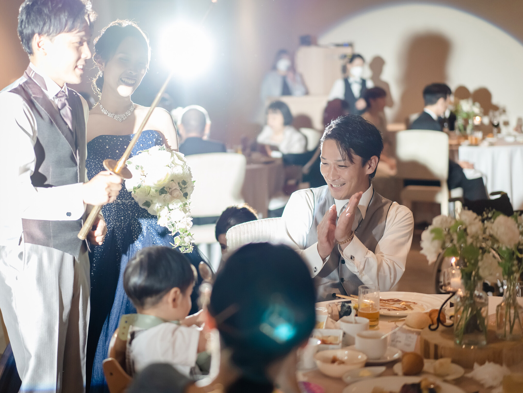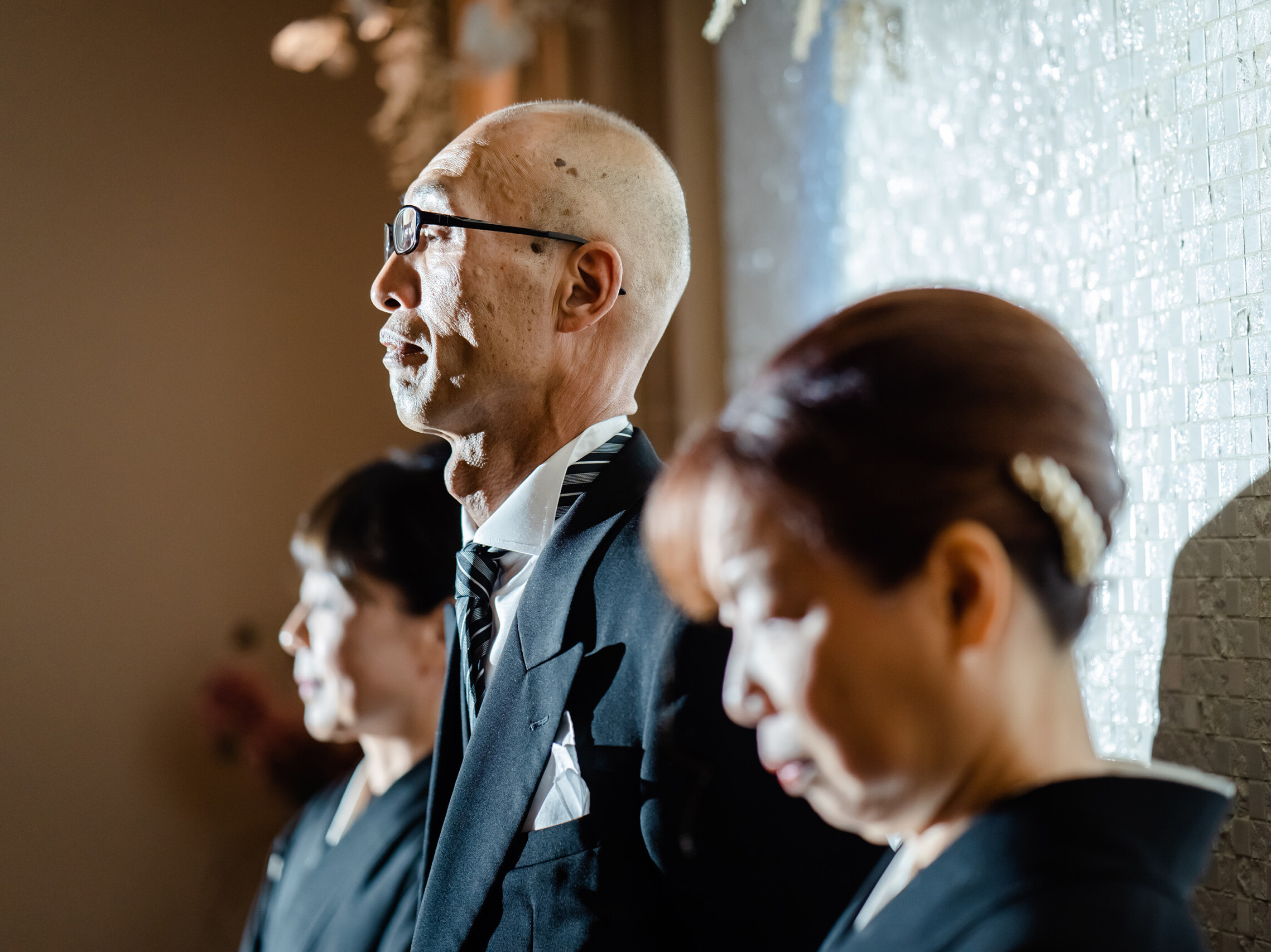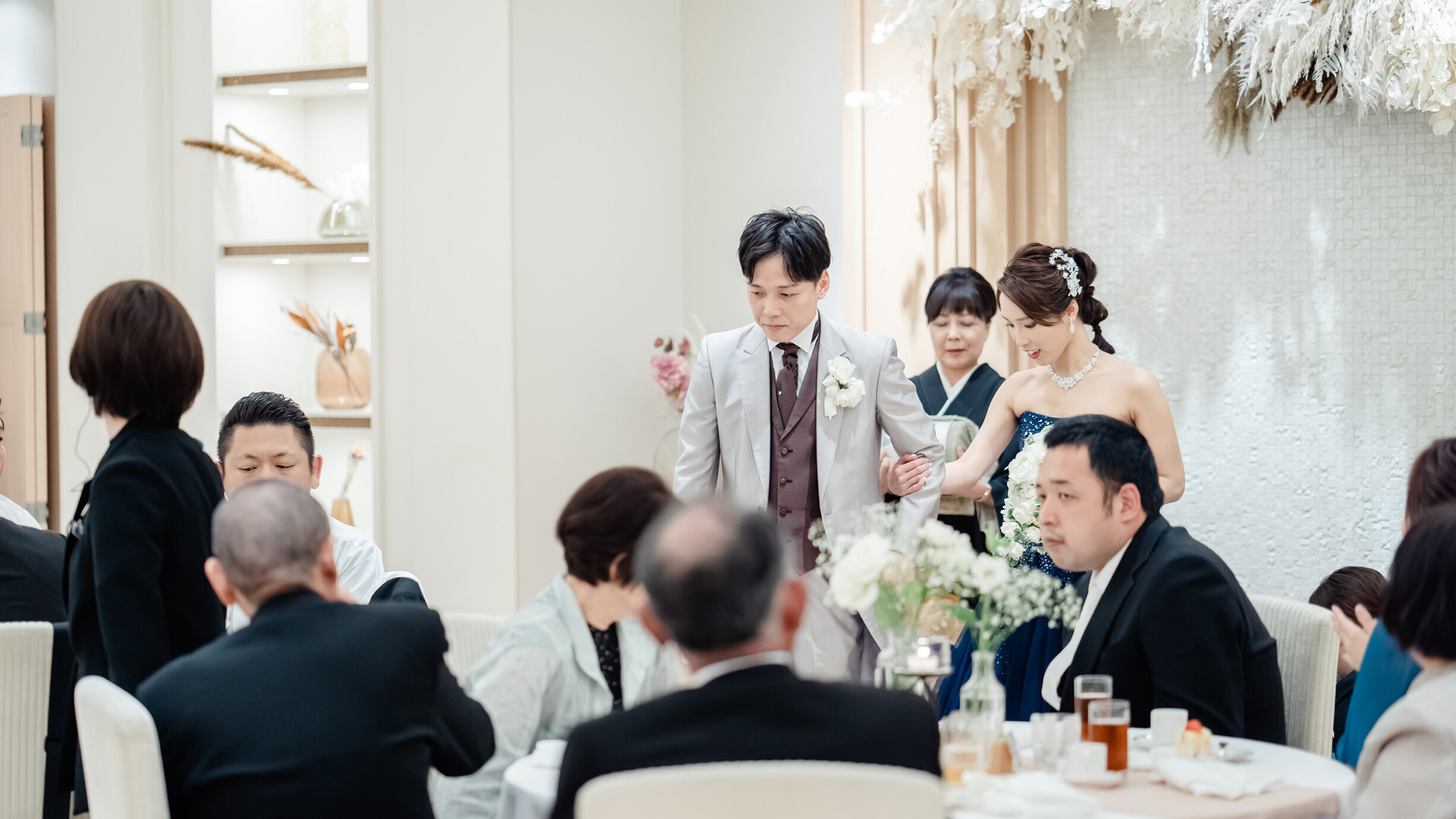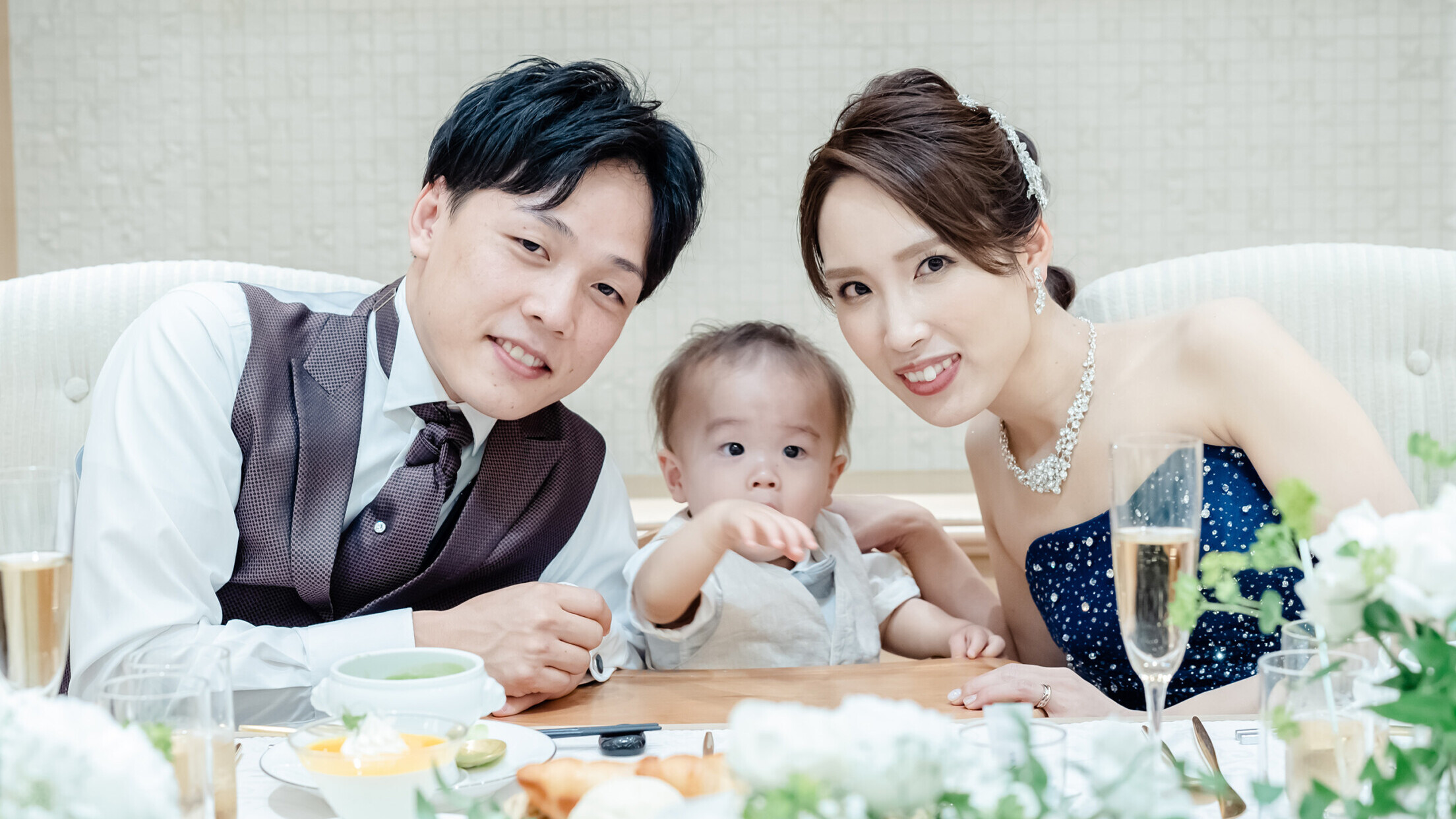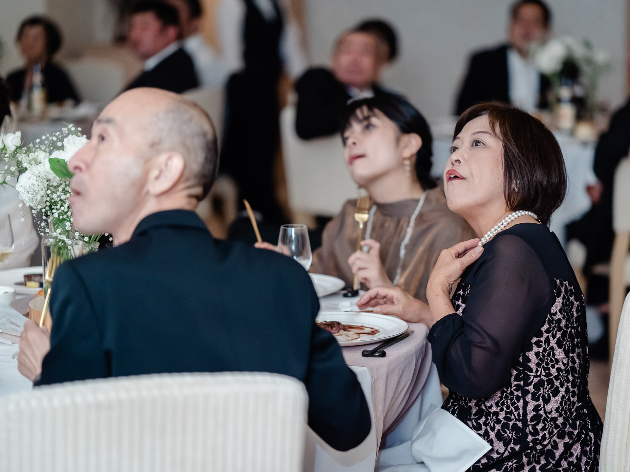 「親御様にドレス姿を直接みてもらいたい」 そんな想いから結婚式をすることを決めたおふたり 挙式の前にファミリーミートを行い、 誰よりも先にドレス姿を見てもらうことにしました 挙式や披露宴ではゲストとの距離が近づくような演出を入れて 写真タイムもしっかり取り、思い出が沢山残せる時間づくりを意識しました