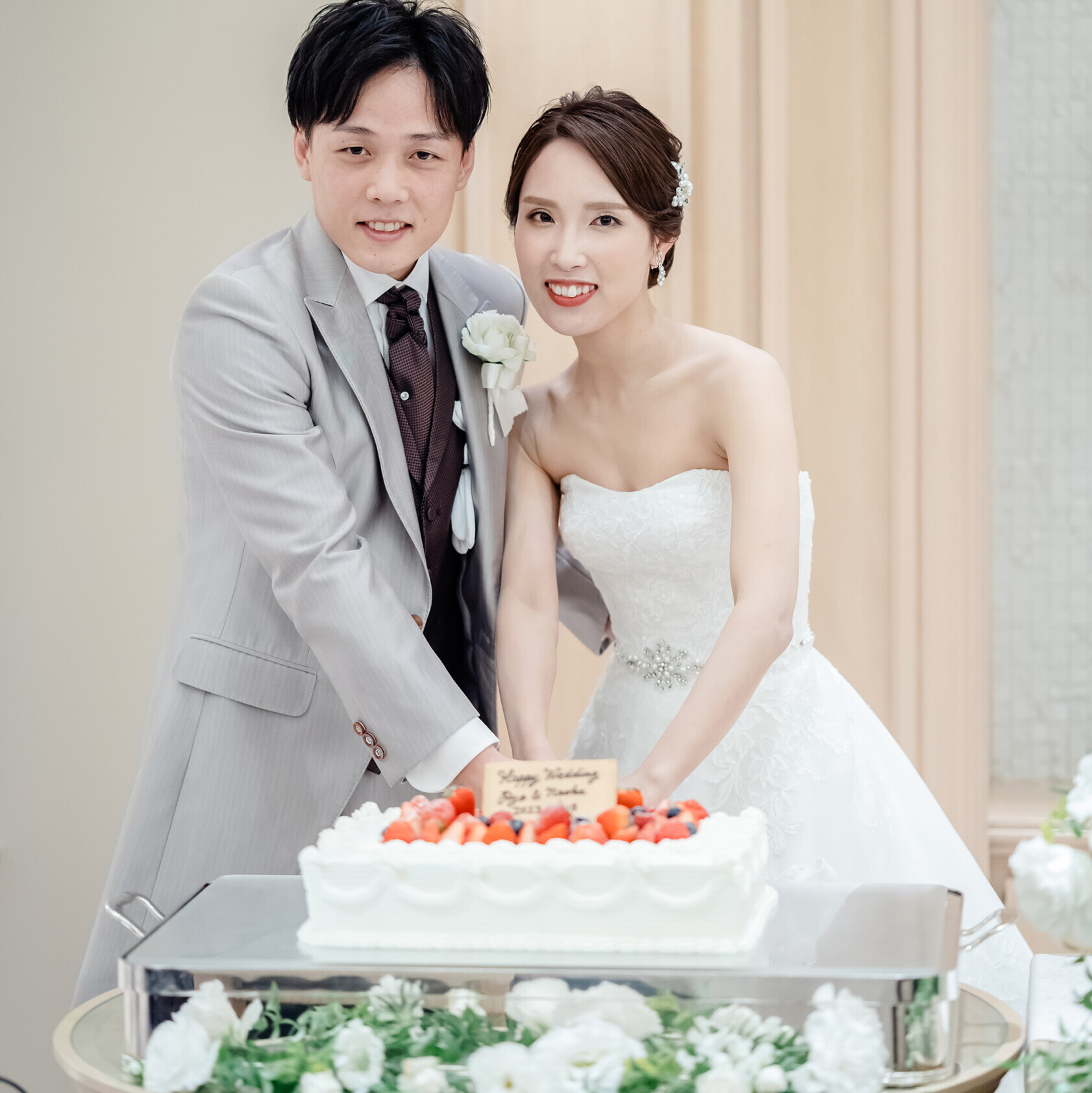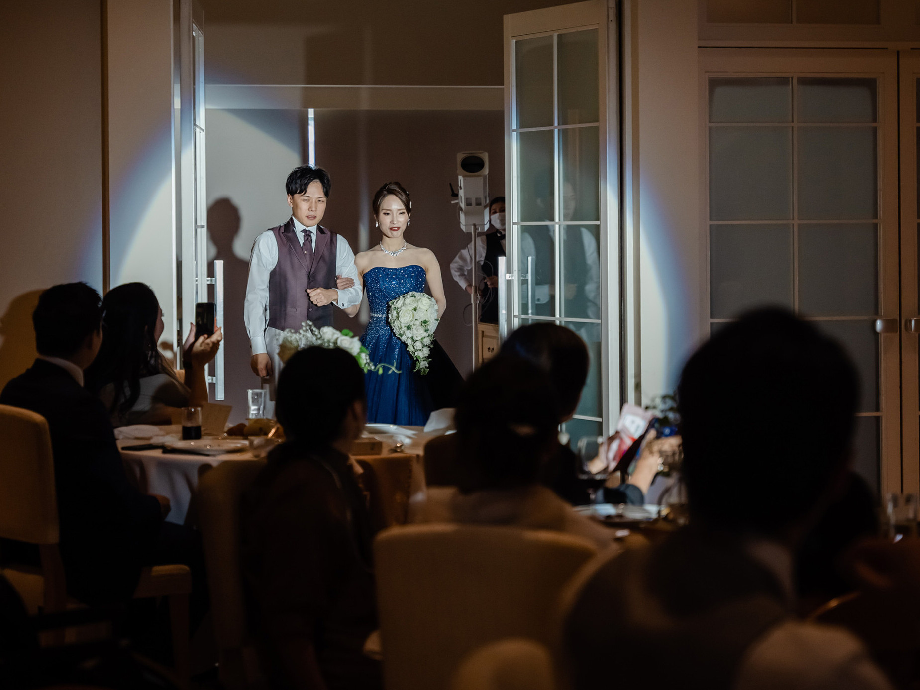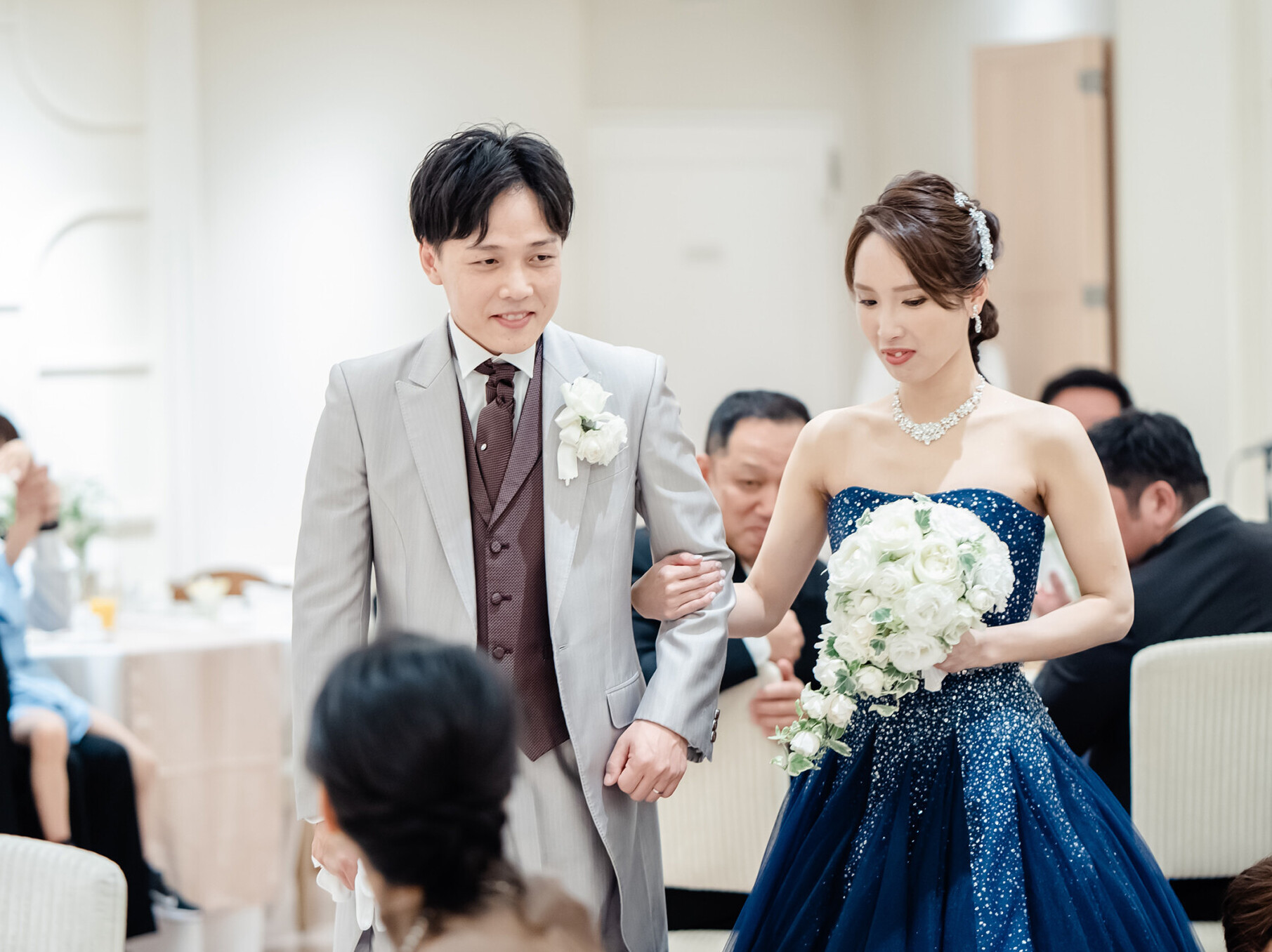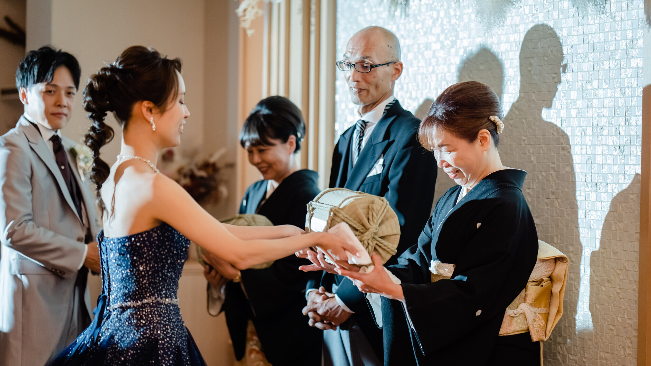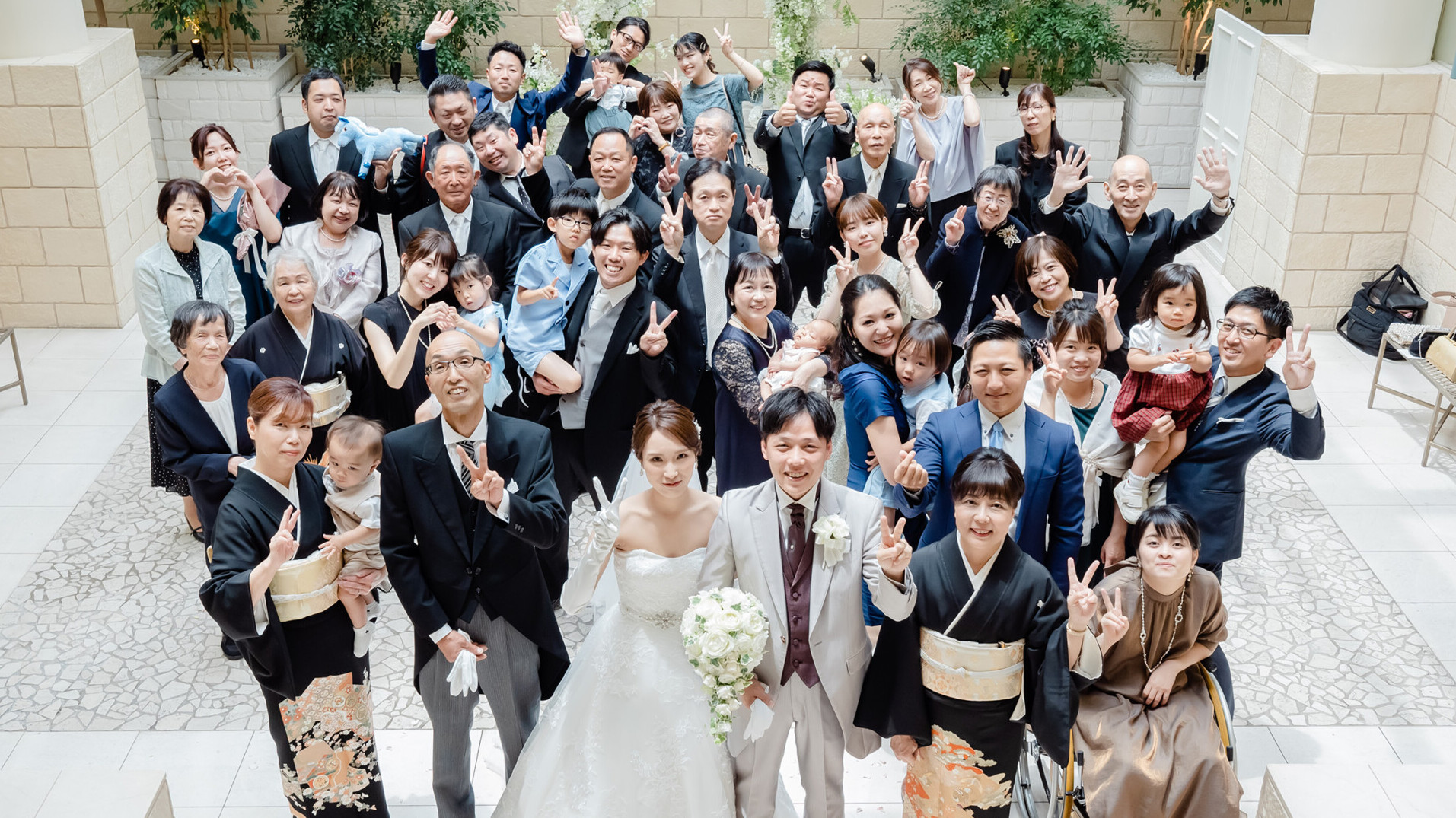 「親御様にドレス姿を直接みてもらいたい」 そんな想いから結婚式をすることを決めたおふたり 挙式の前にファミリーミートを行い、 誰よりも先にドレス姿を見てもらうことにしました 挙式や披露宴ではゲストとの距離が近づくような演出を入れて 写真タイムもしっかり取り、思い出が沢山残せる時間づくりを意識しました