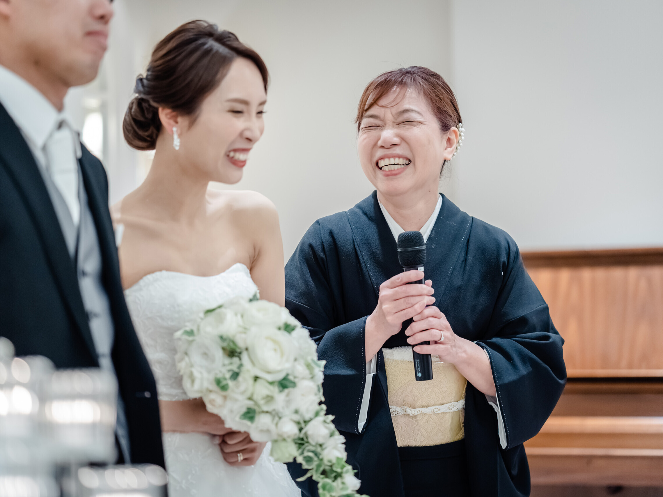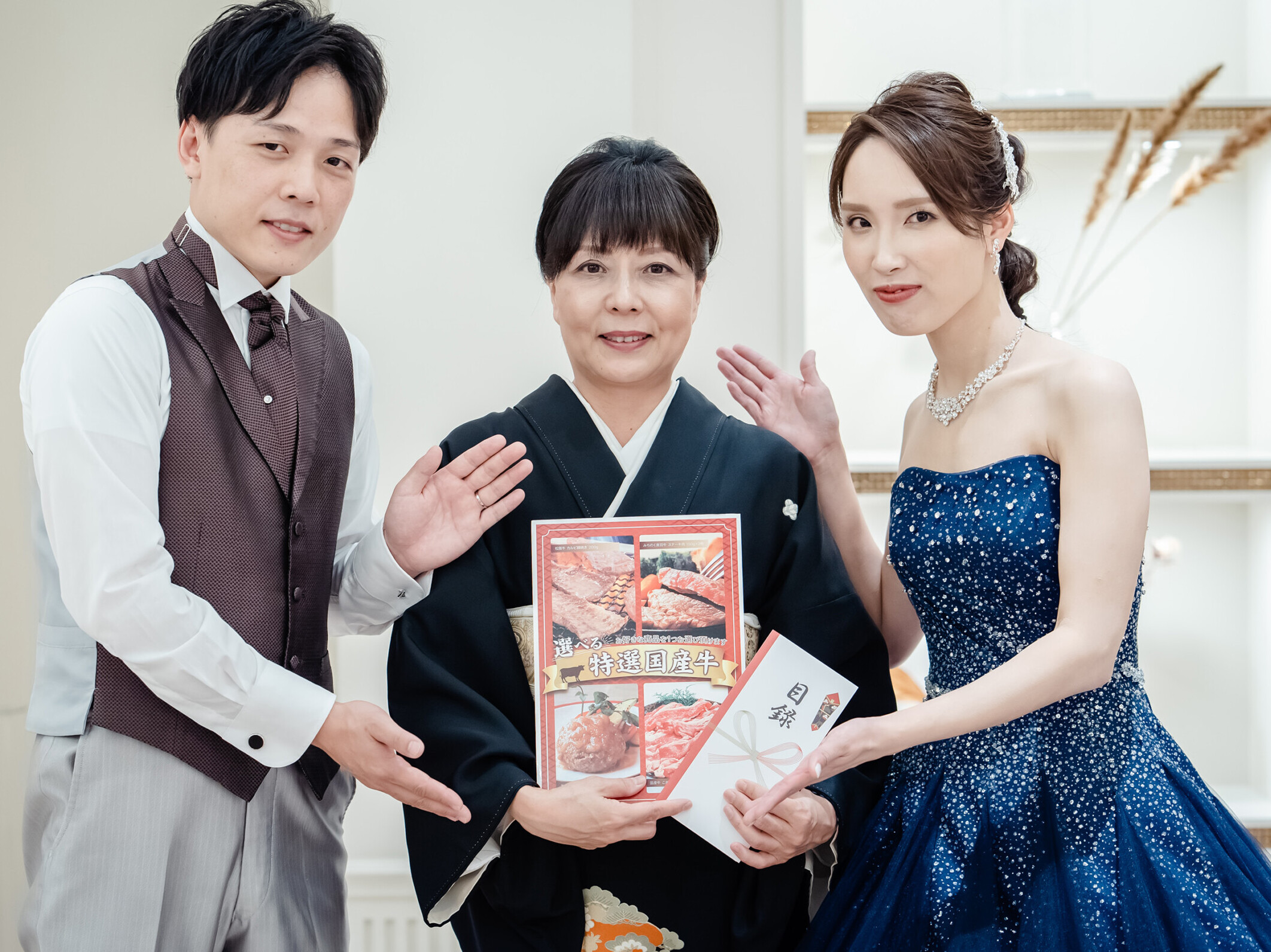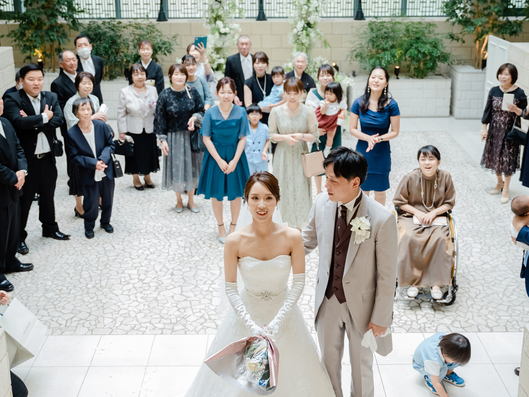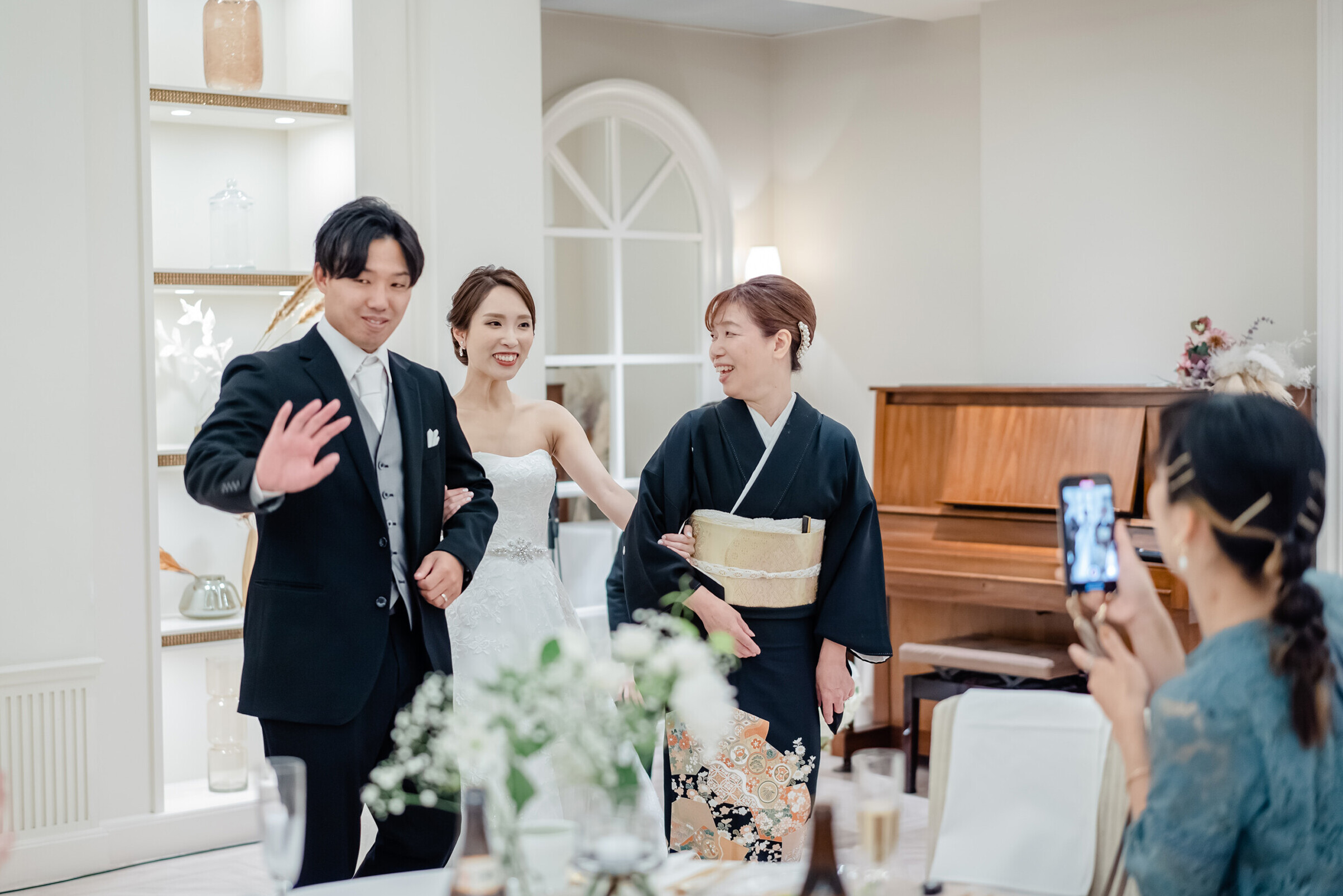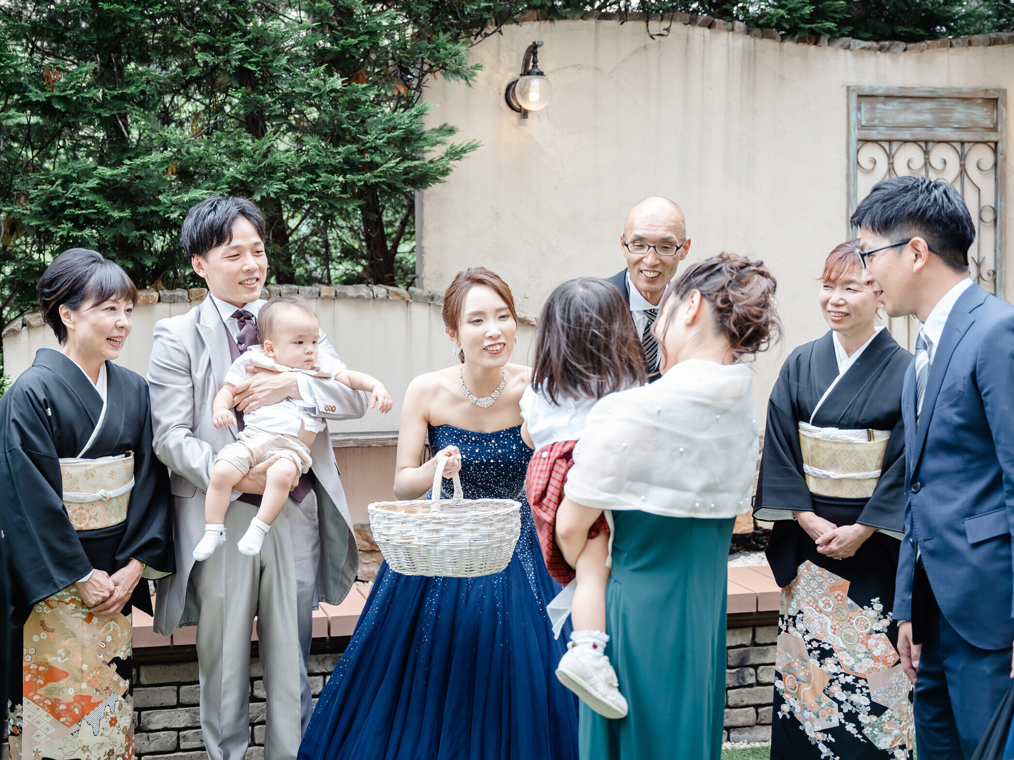 「親御様にドレス姿を直接みてもらいたい」 そんな想いから結婚式をすることを決めたおふたり 挙式の前にファミリーミートを行い、 誰よりも先にドレス姿を見てもらうことにしました 挙式や披露宴ではゲストとの距離が近づくような演出を入れて 写真タイムもしっかり取り、思い出が沢山残せる時間づくりを意識しました