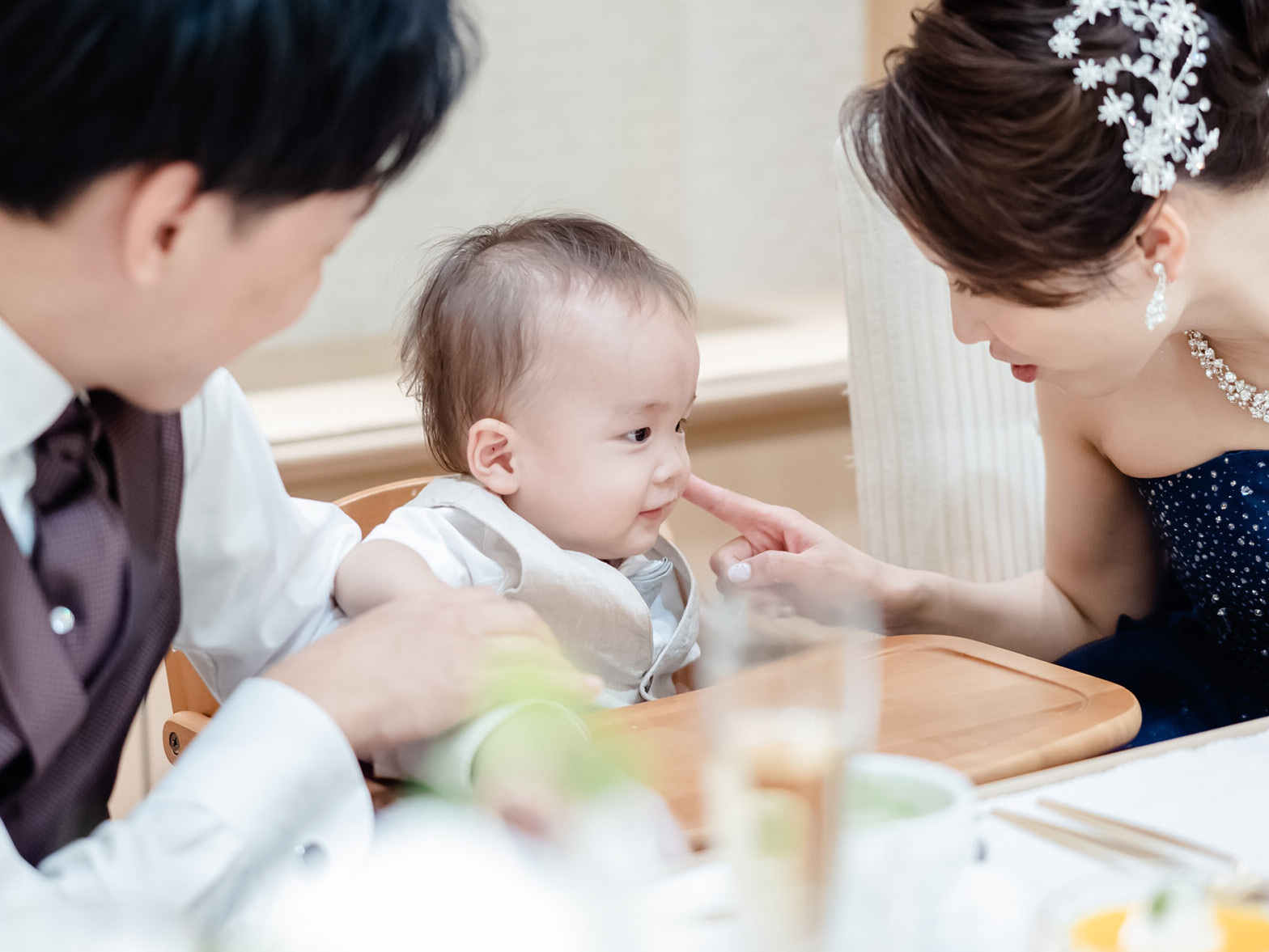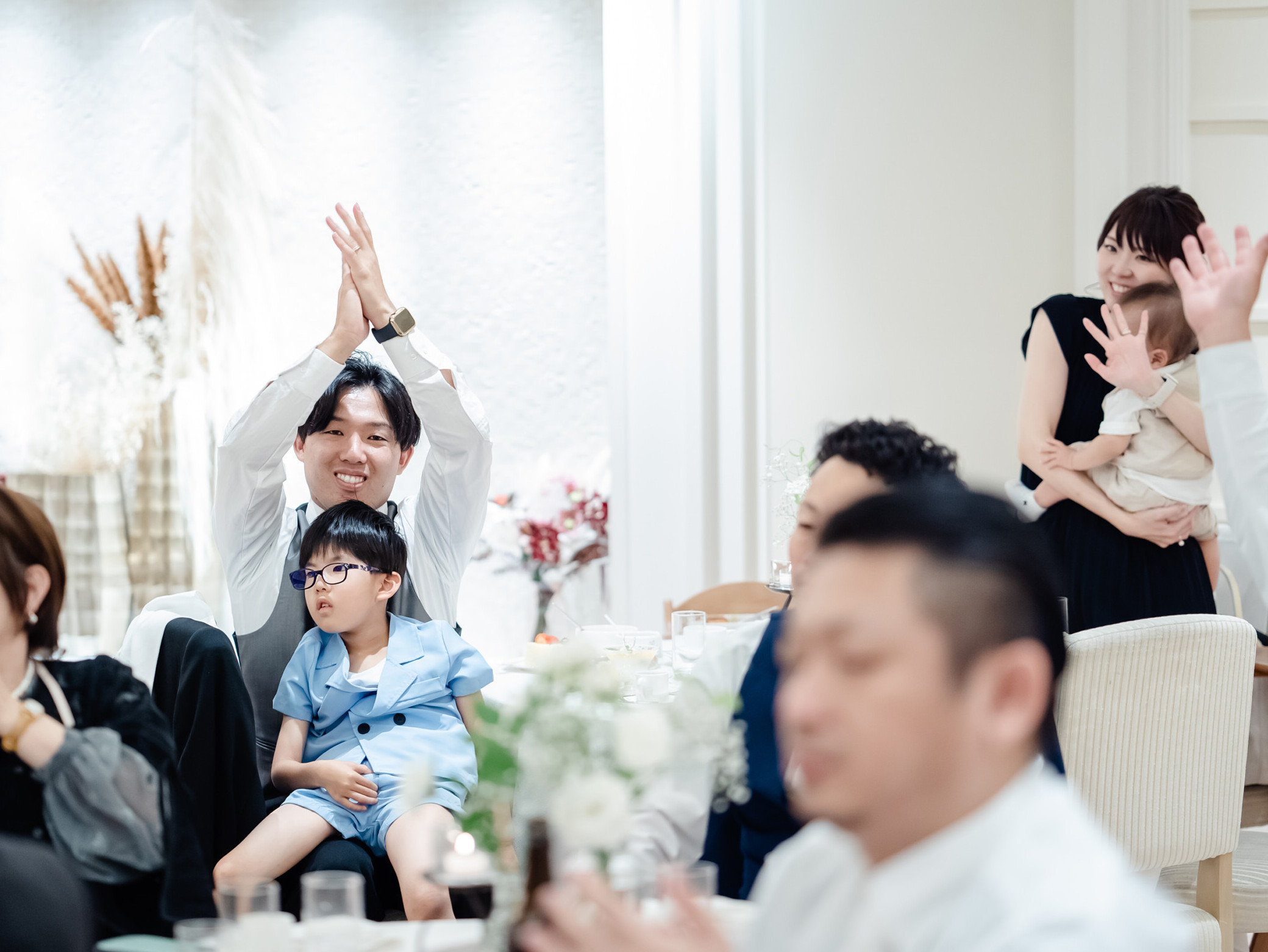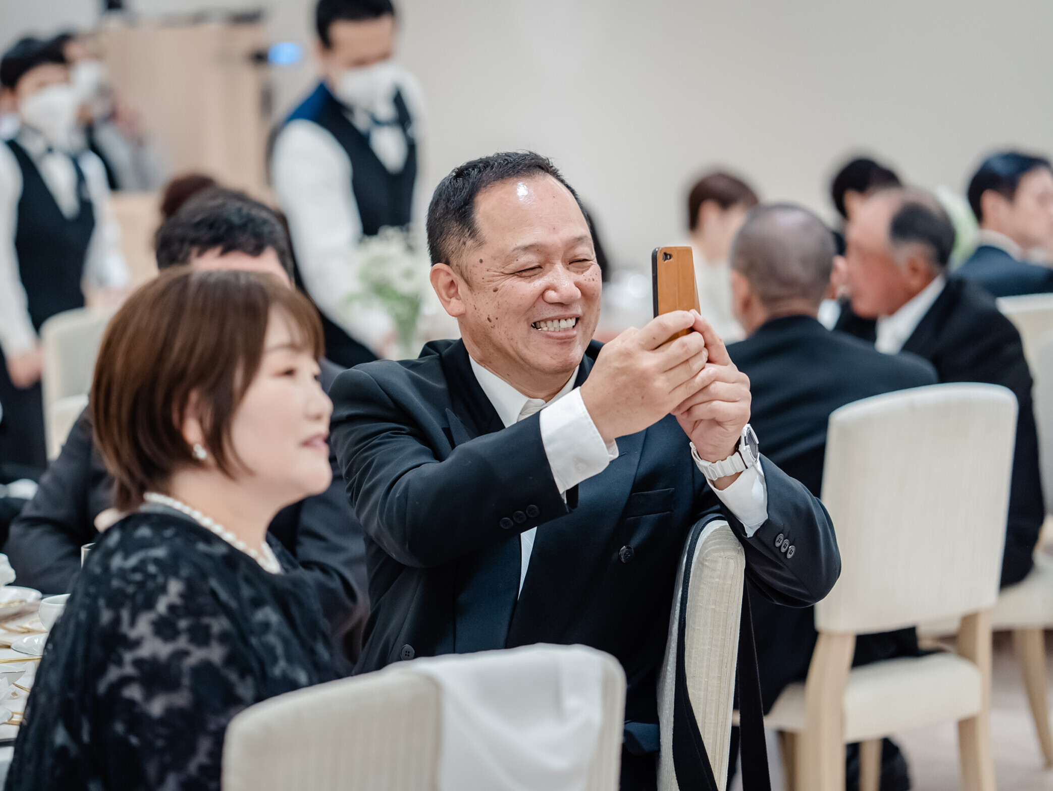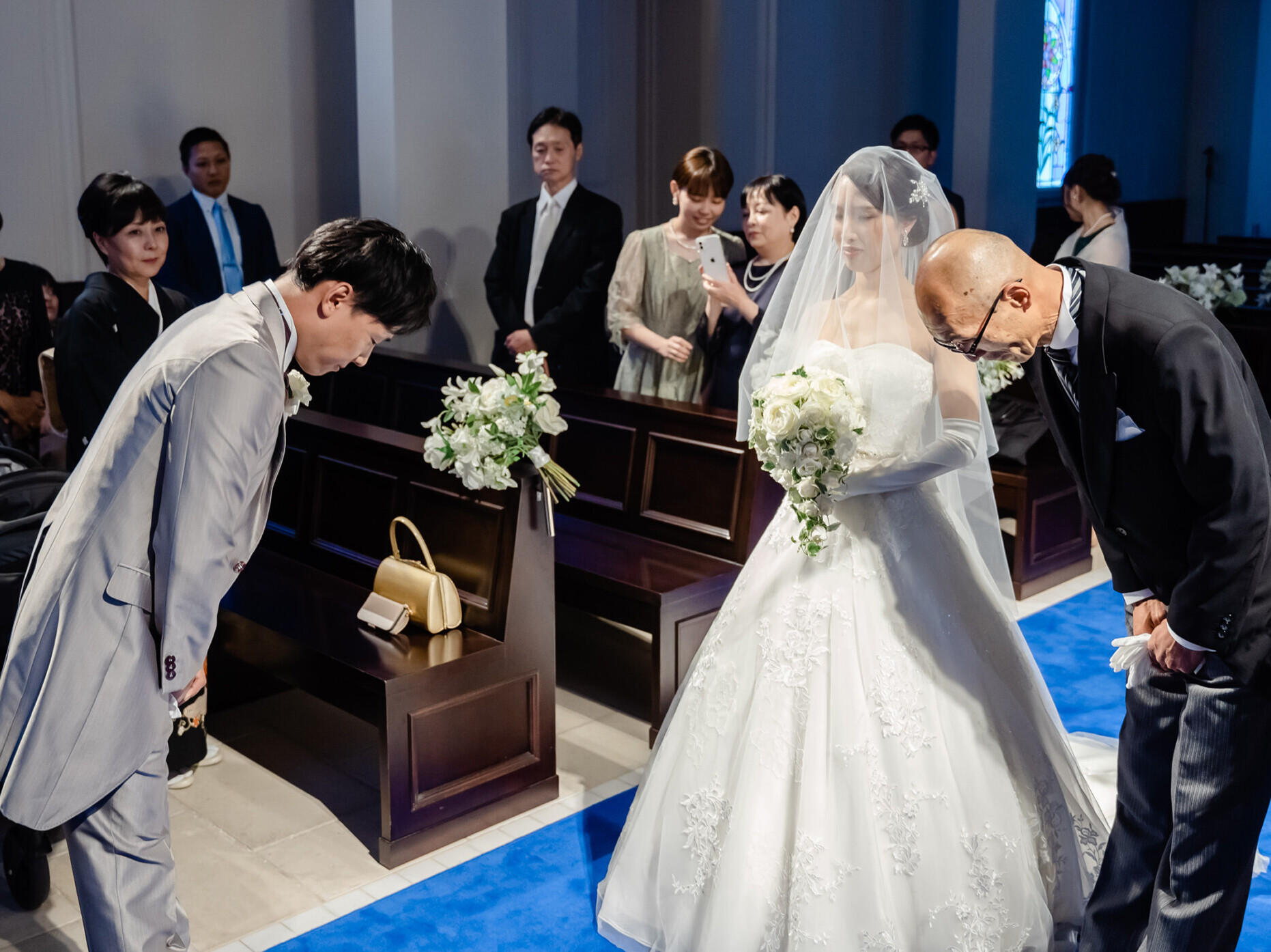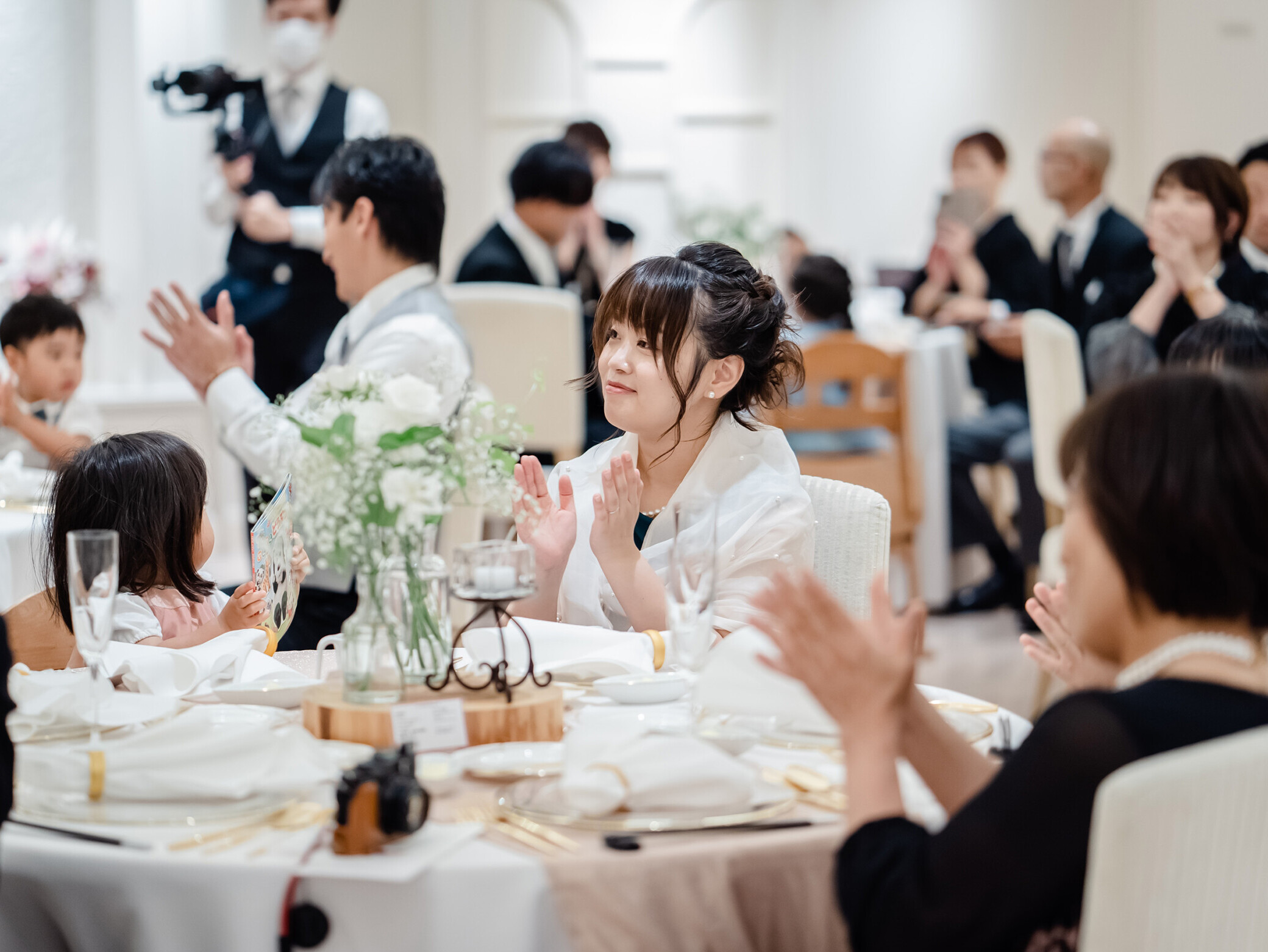 「親御様にドレス姿を直接みてもらいたい」 そんな想いから結婚式をすることを決めたおふたり 挙式の前にファミリーミートを行い、 誰よりも先にドレス姿を見てもらうことにしました 挙式や披露宴ではゲストとの距離が近づくような演出を入れて 写真タイムもしっかり取り、思い出が沢山残せる時間づくりを意識しました