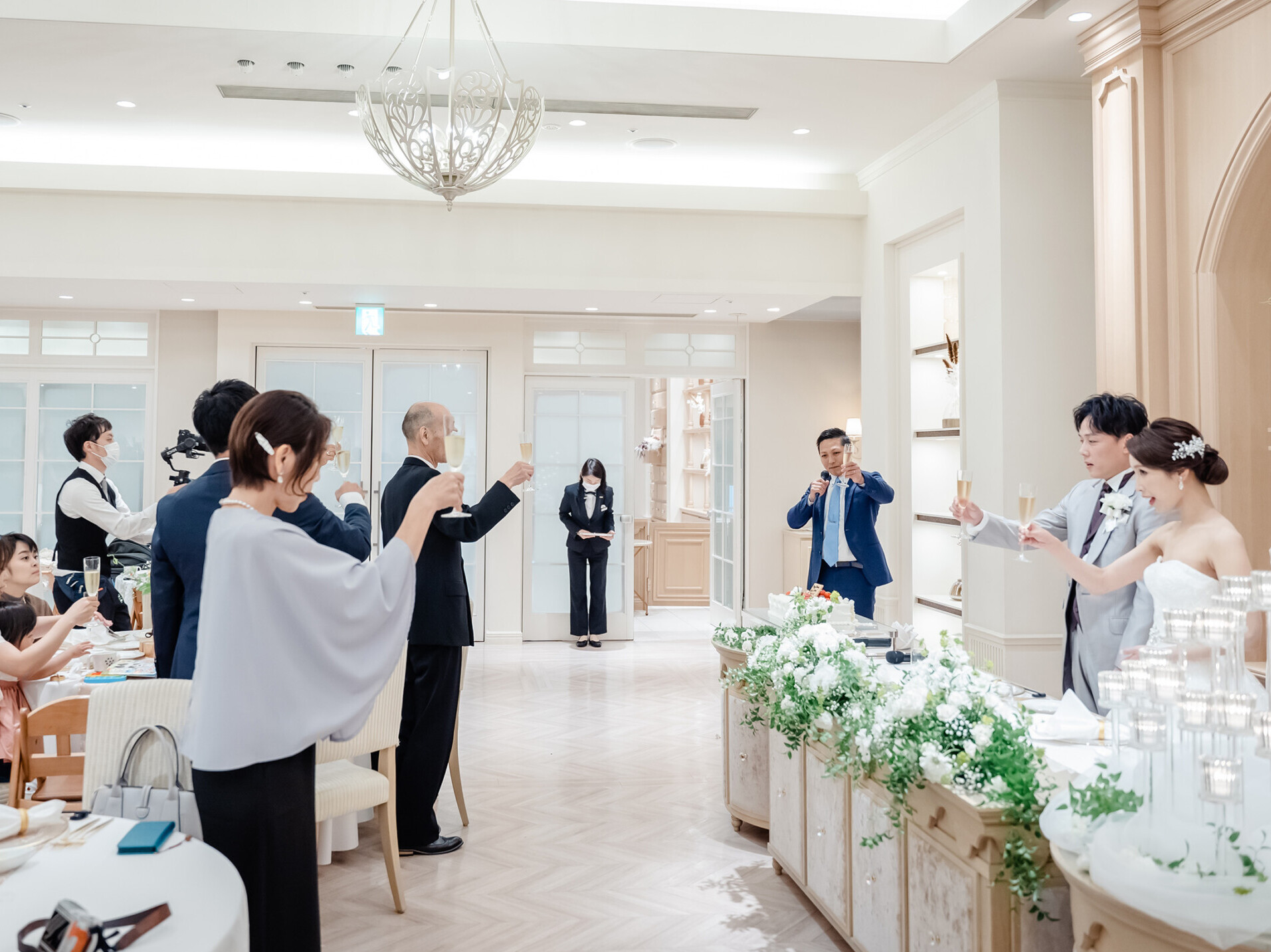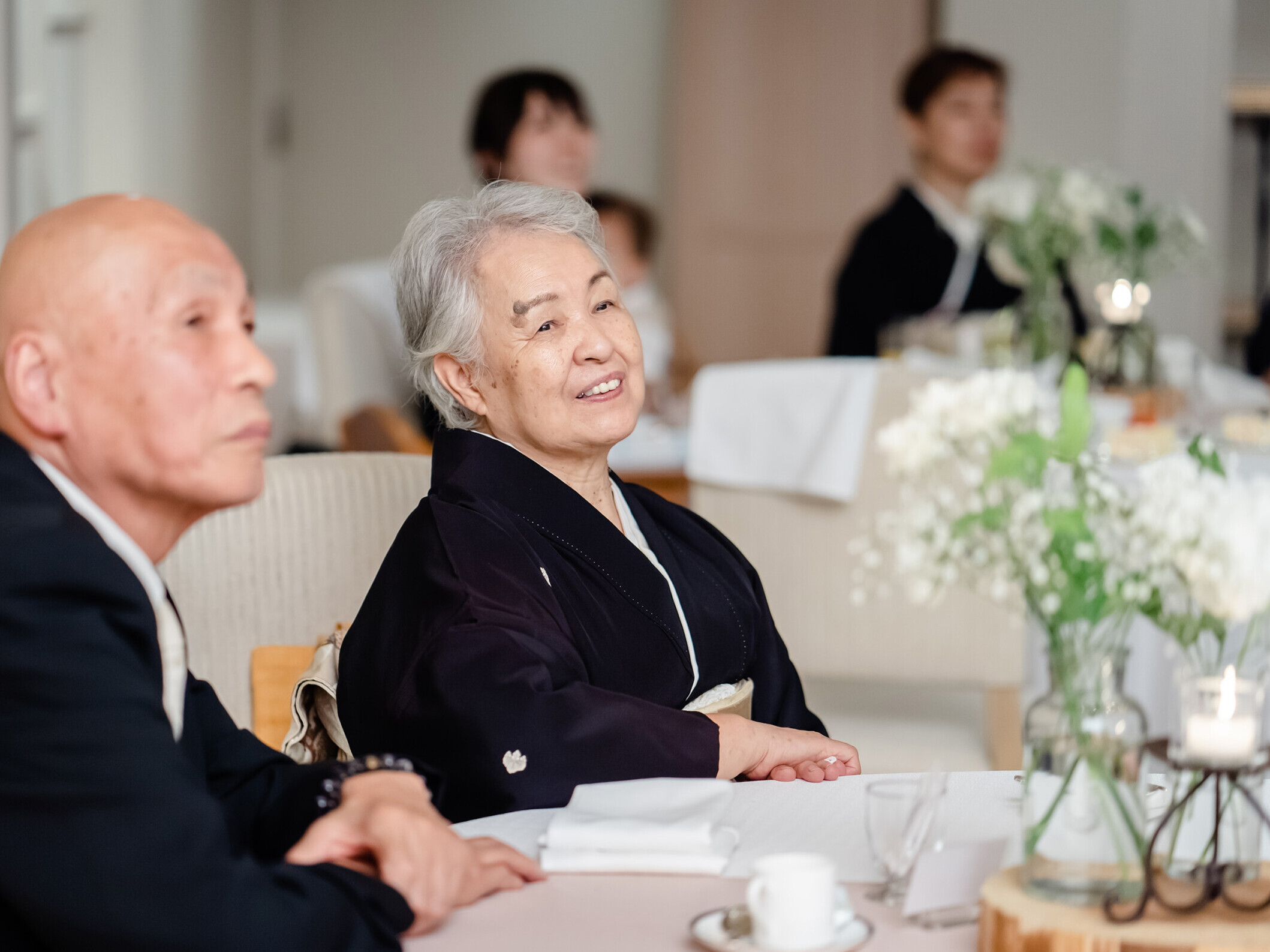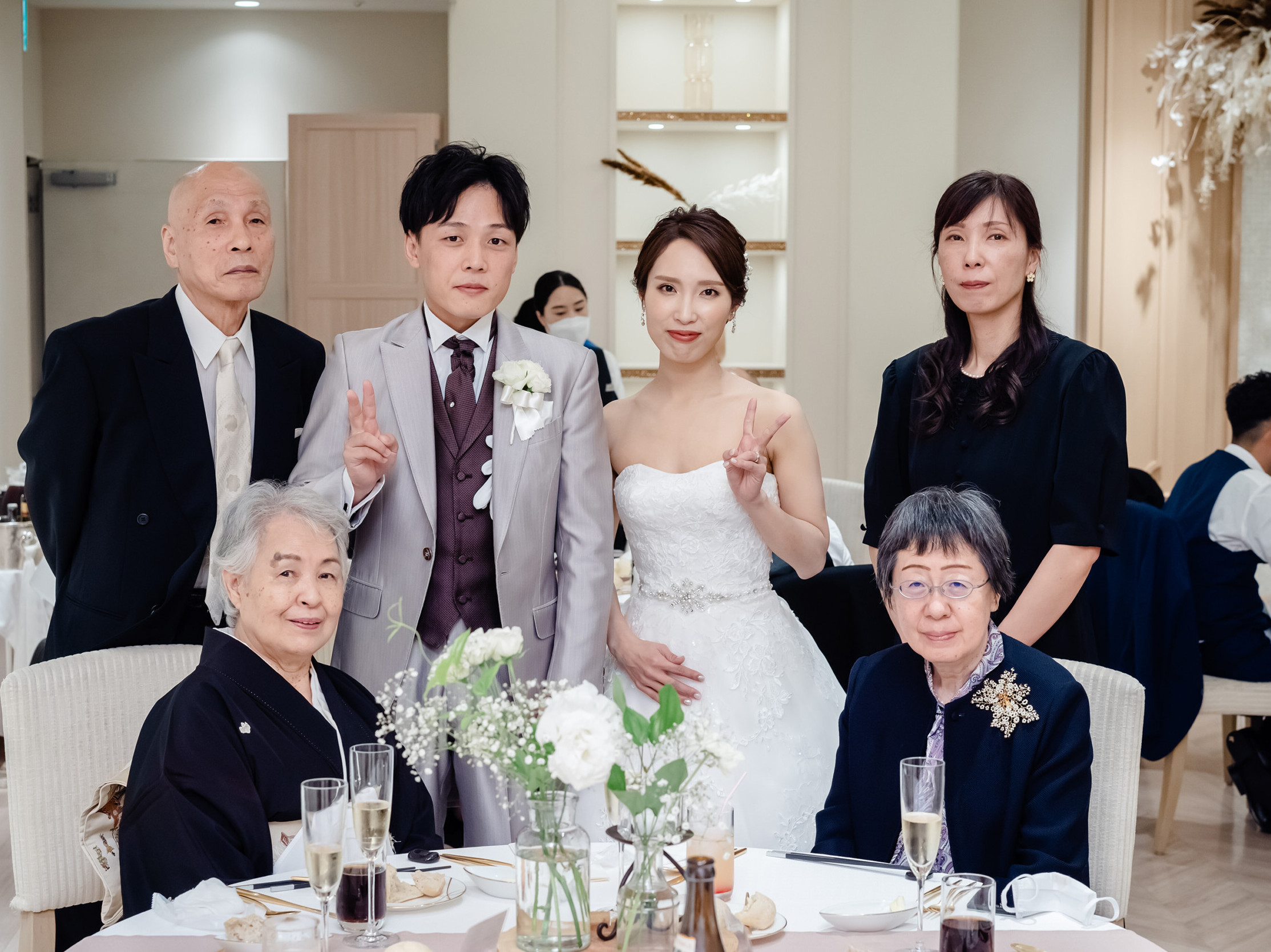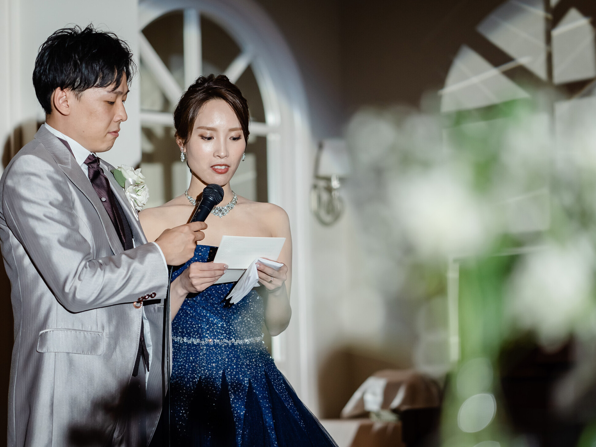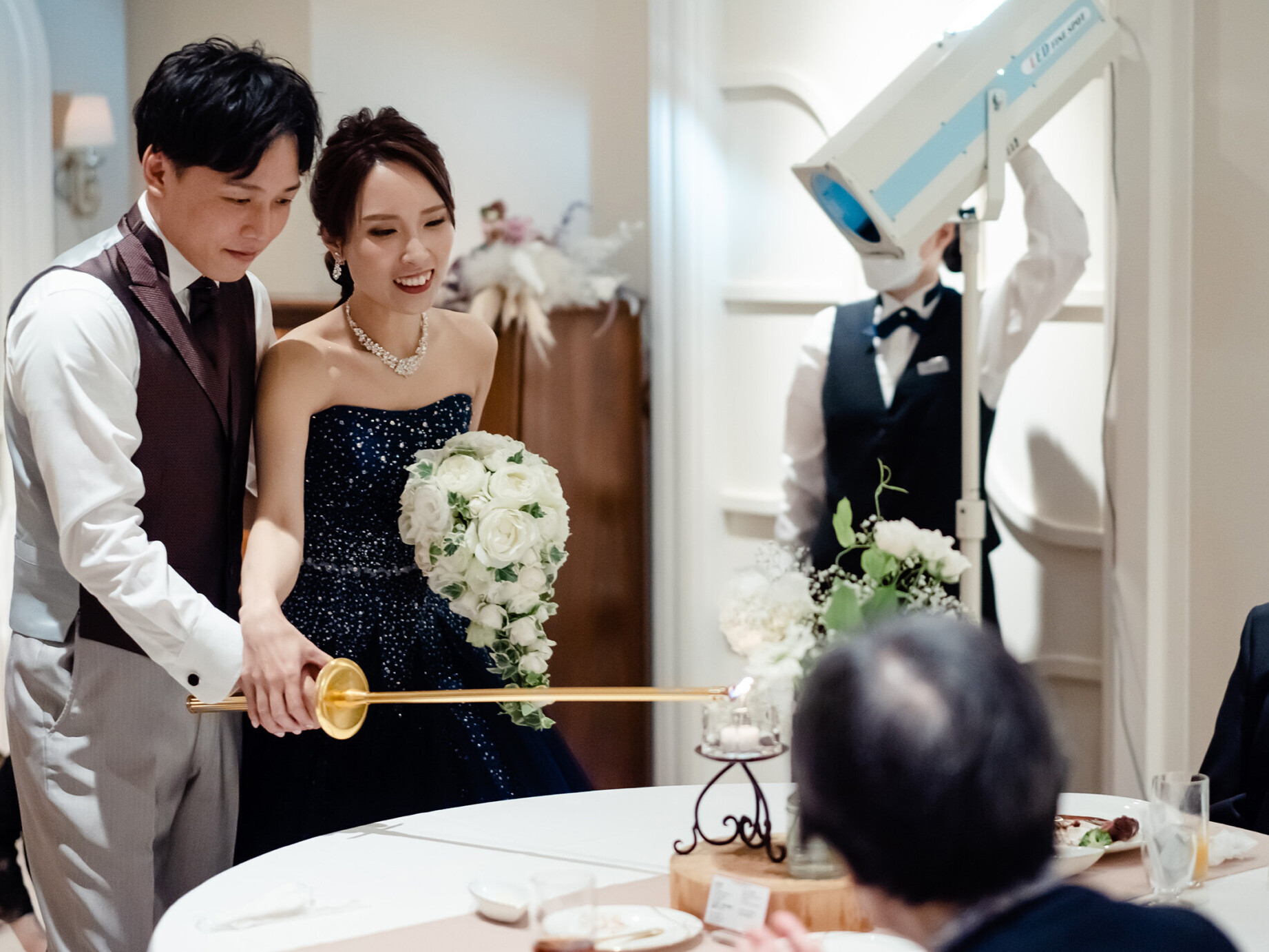 「親御様にドレス姿を直接みてもらいたい」 そんな想いから結婚式をすることを決めたおふたり 挙式の前にファミリーミートを行い、 誰よりも先にドレス姿を見てもらうことにしました 挙式や披露宴ではゲストとの距離が近づくような演出を入れて 写真タイムもしっかり取り、思い出が沢山残せる時間づくりを意識しました