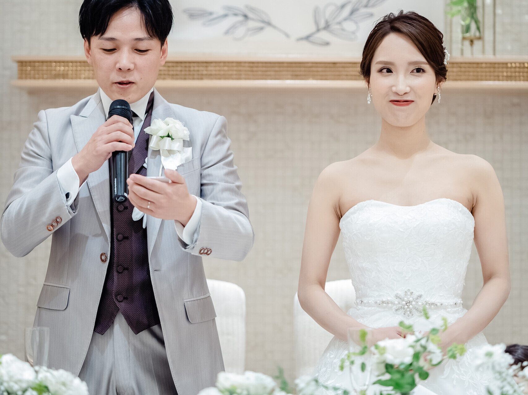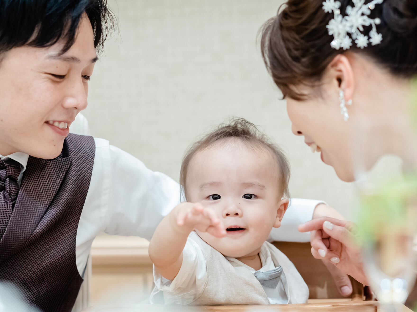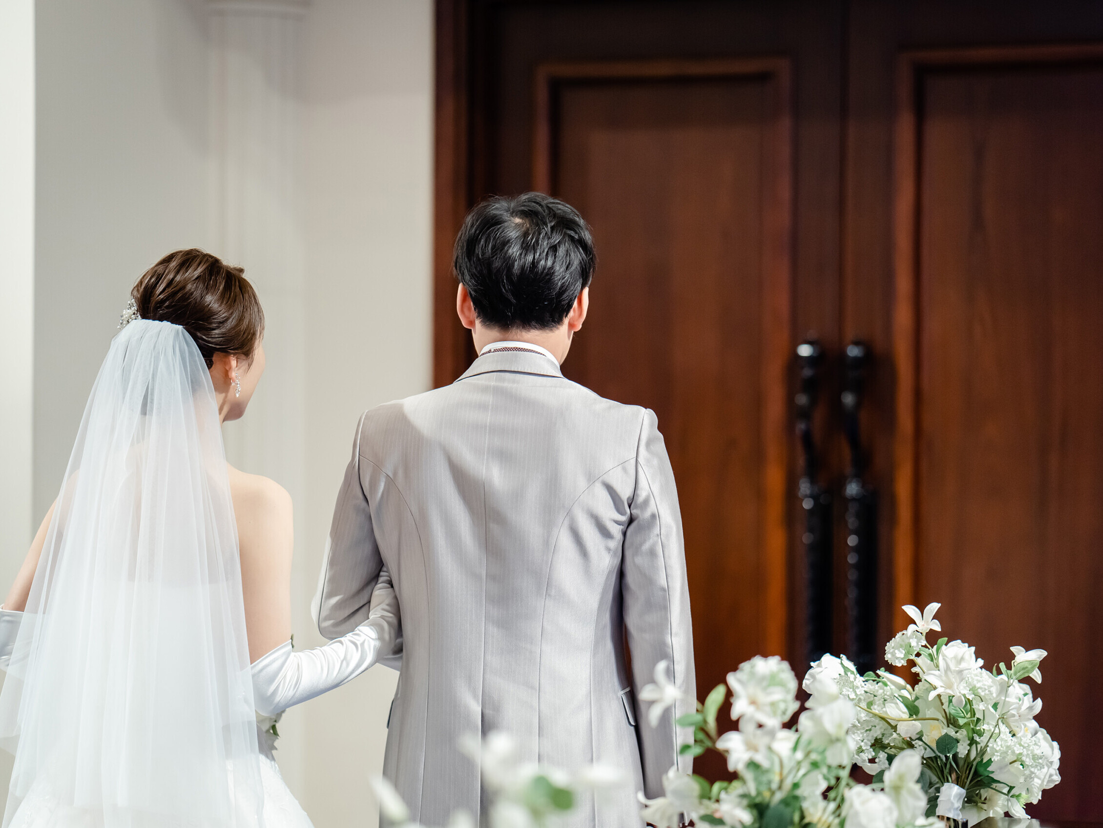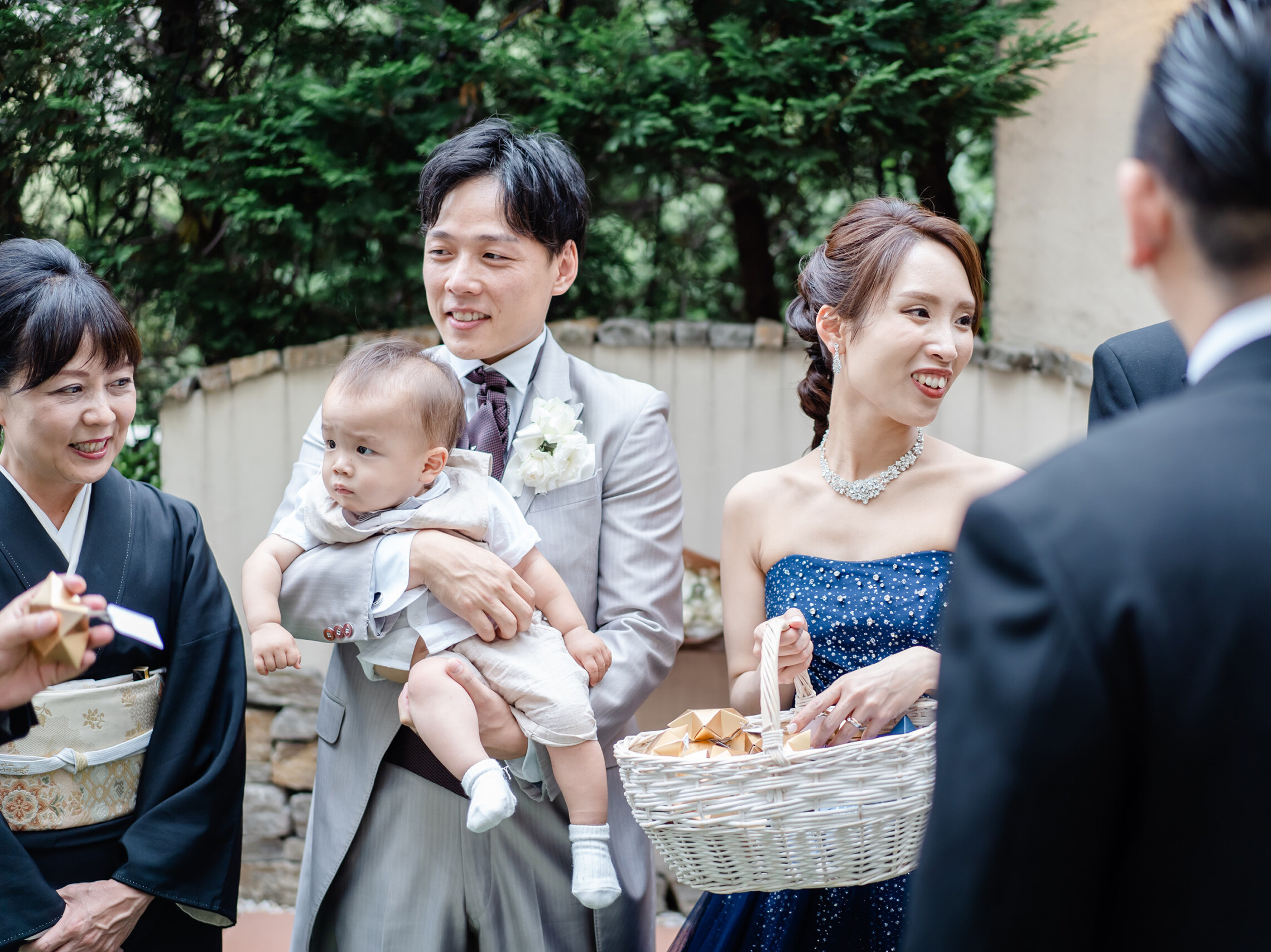 「親御様にドレス姿を直接みてもらいたい」 そんな想いから結婚式をすることを決めたおふたり 挙式の前にファミリーミートを行い、 誰よりも先にドレス姿を見てもらうことにしました 挙式や披露宴ではゲストとの距離が近づくような演出を入れて 写真タイムもしっかり取り、思い出が沢山残せる時間づくりを意識しました