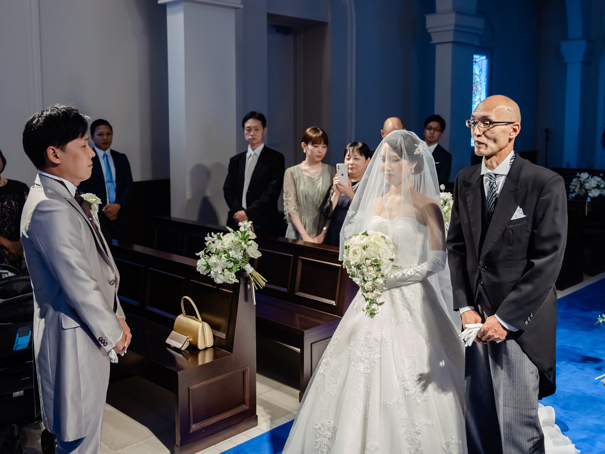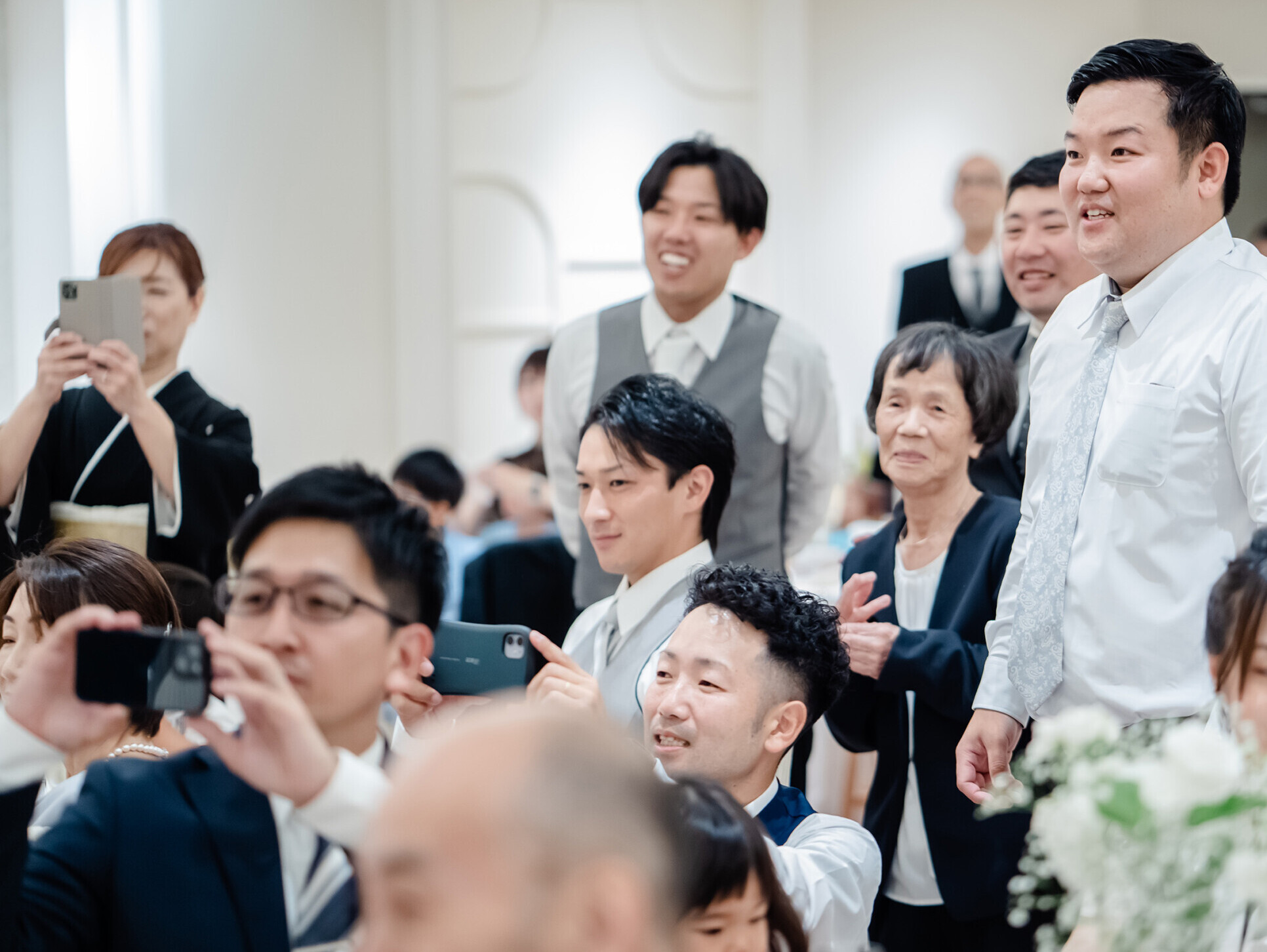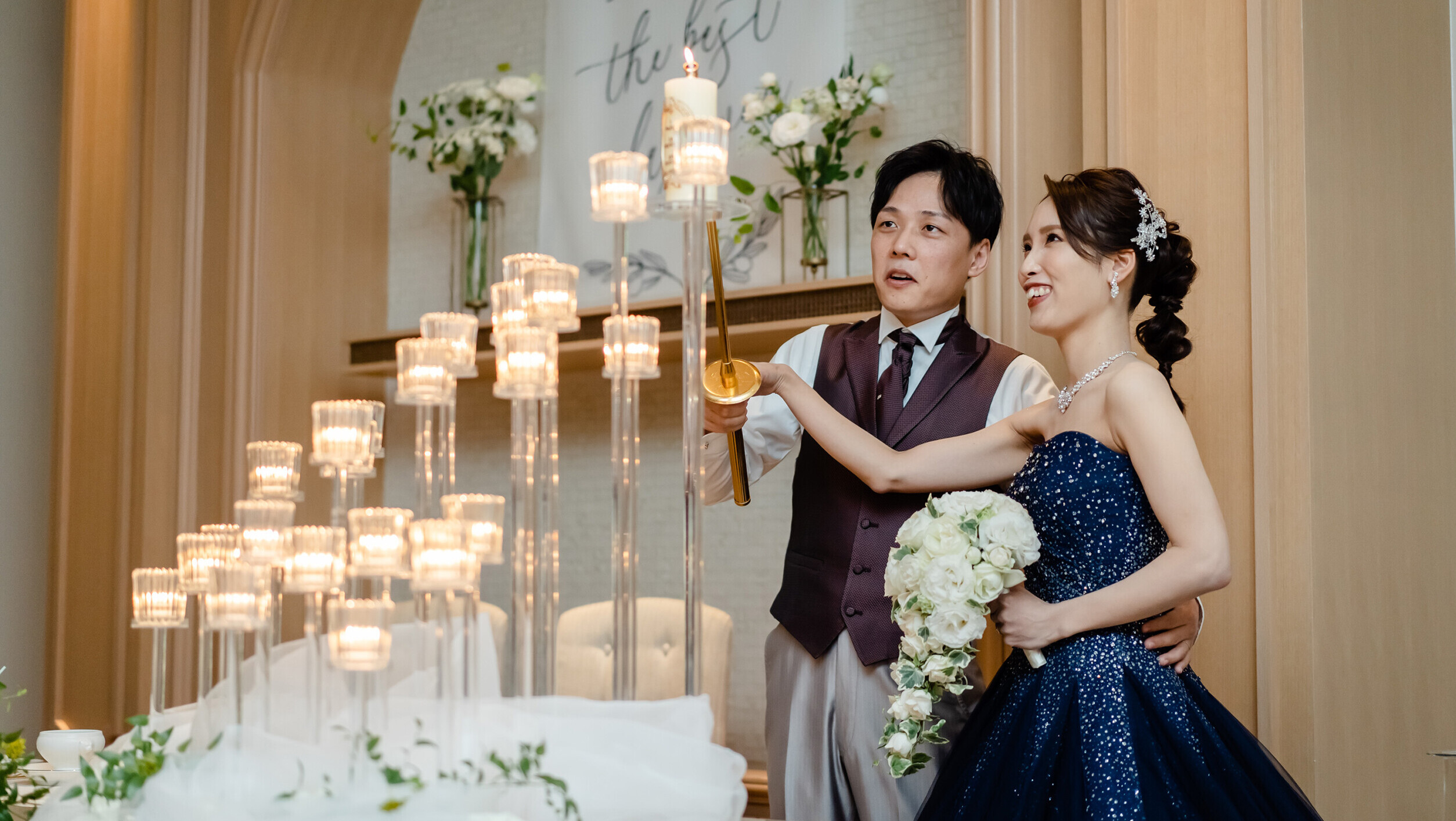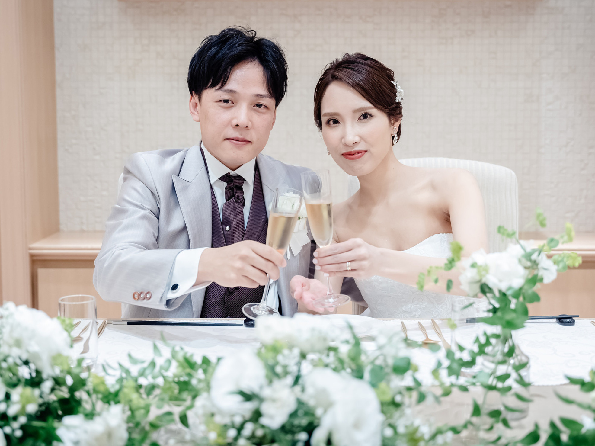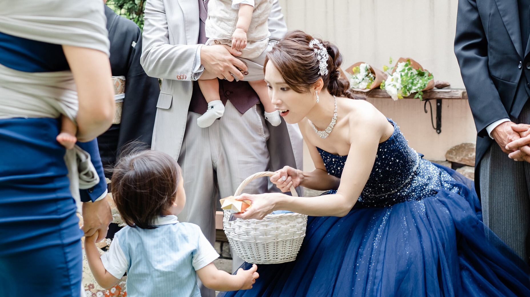 「親御様にドレス姿を直接みてもらいたい」 そんな想いから結婚式をすることを決めたおふたり 挙式の前にファミリーミートを行い、 誰よりも先にドレス姿を見てもらうことにしました 挙式や披露宴ではゲストとの距離が近づくような演出を入れて 写真タイムもしっかり取り、思い出が沢山残せる時間づくりを意識しました