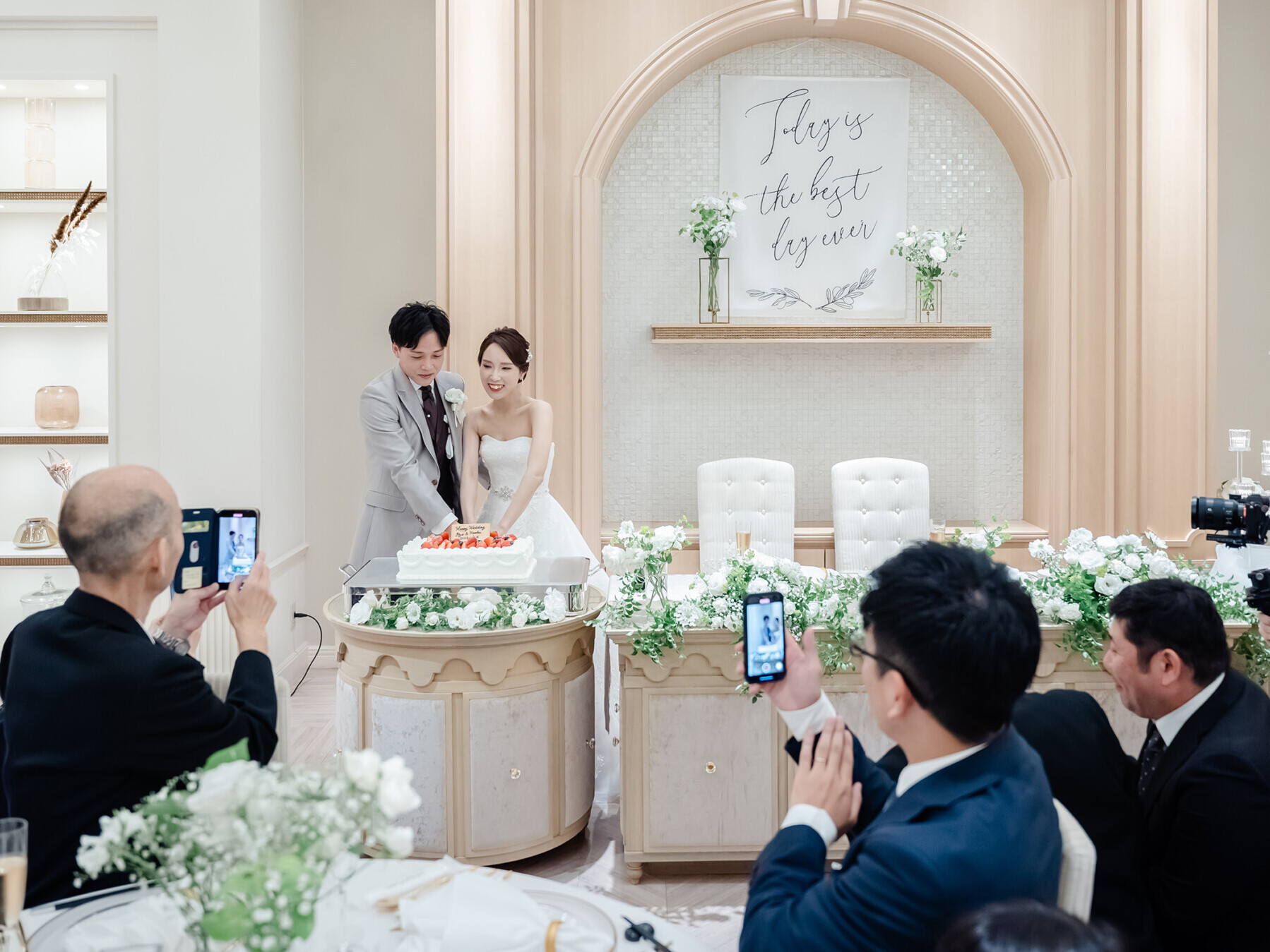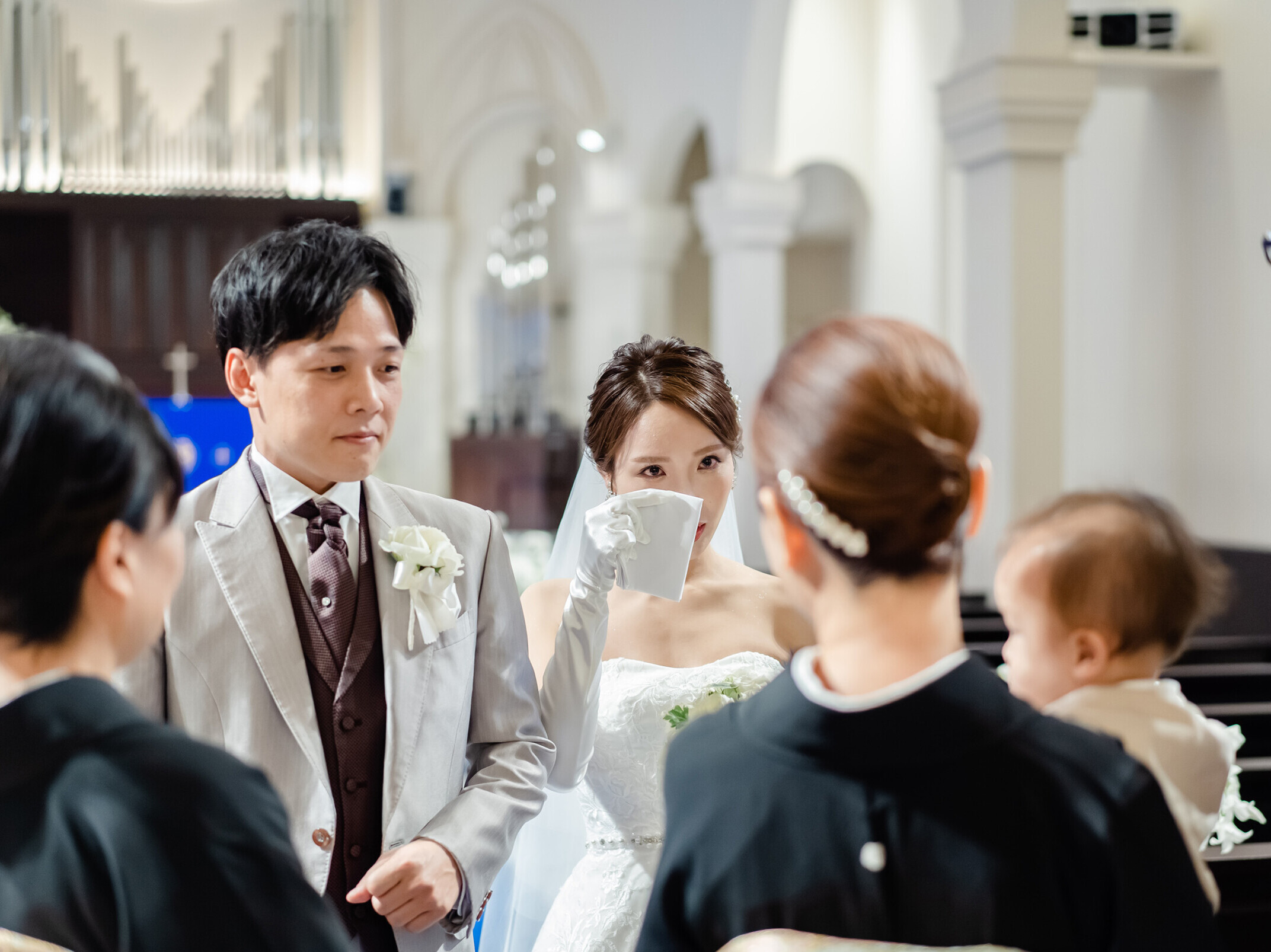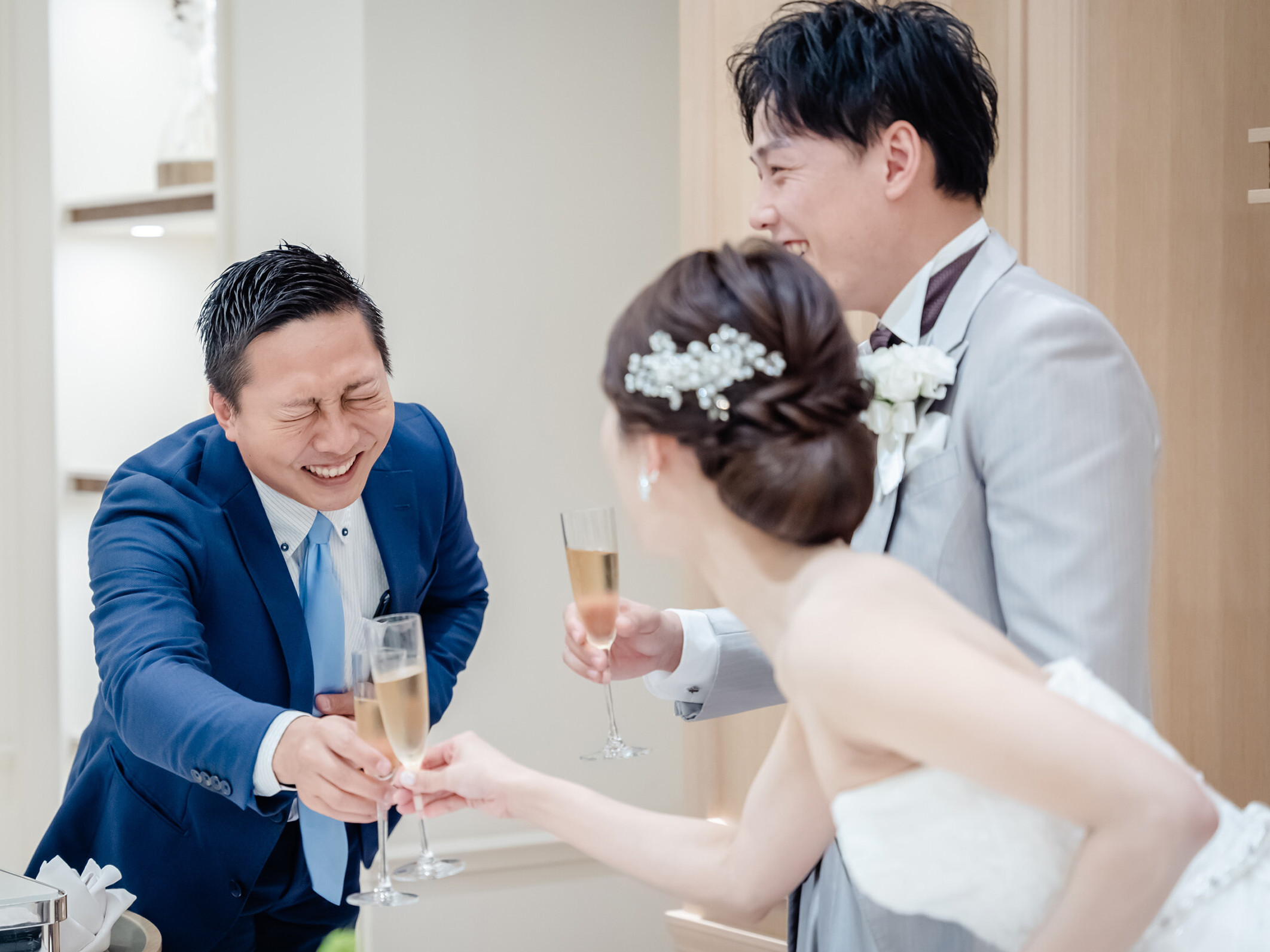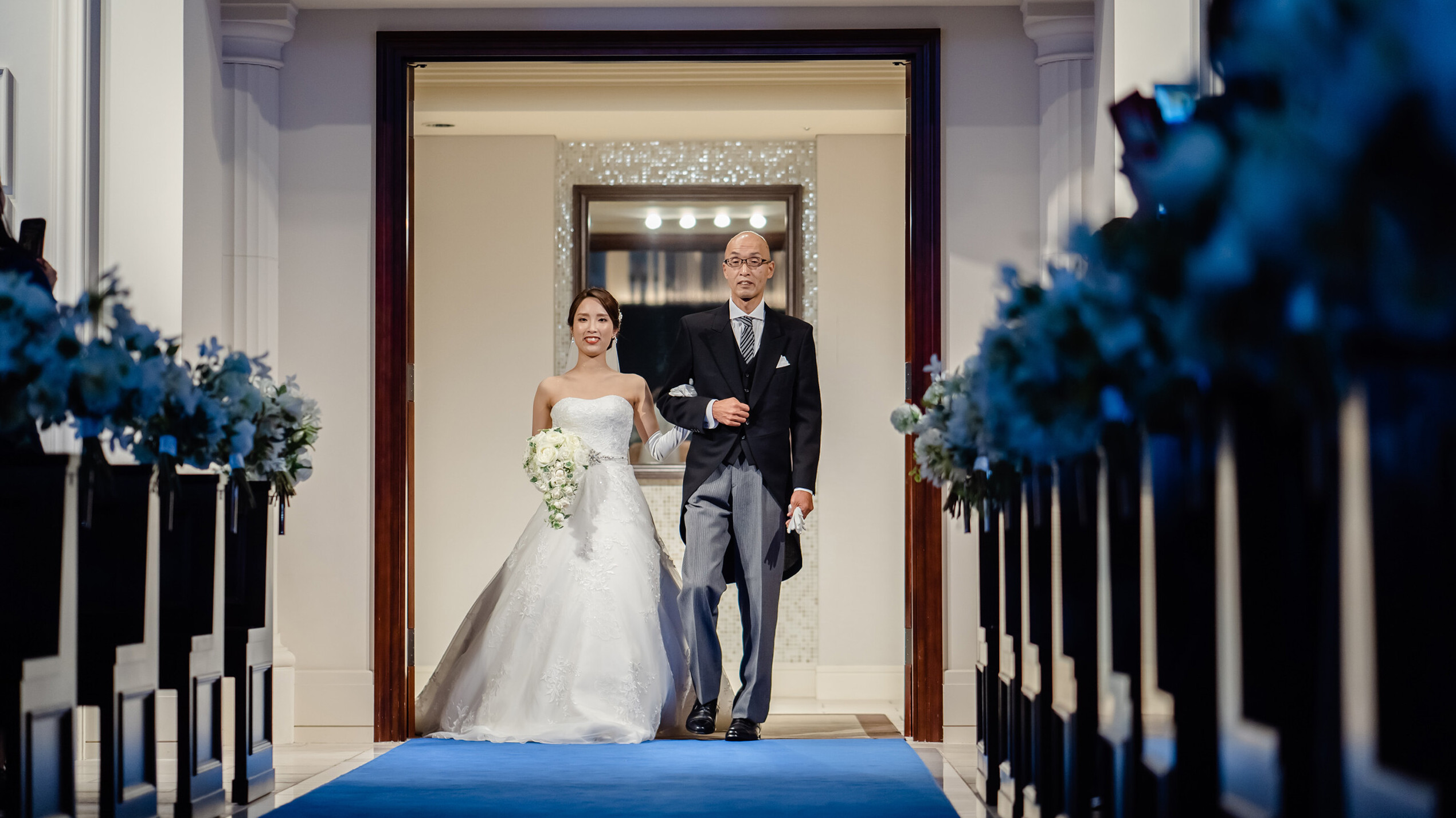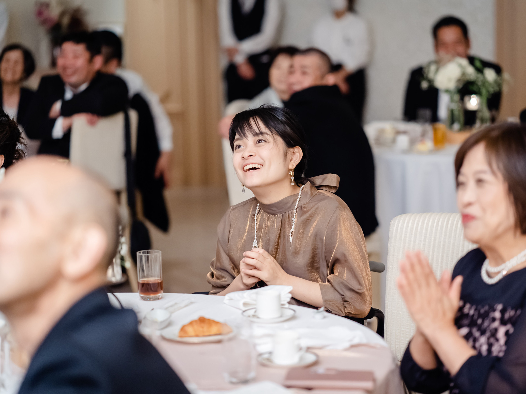 「親御様にドレス姿を直接みてもらいたい」 そんな想いから結婚式をすることを決めたおふたり 挙式の前にファミリーミートを行い、 誰よりも先にドレス姿を見てもらうことにしました 挙式や披露宴ではゲストとの距離が近づくような演出を入れて 写真タイムもしっかり取り、思い出が沢山残せる時間づくりを意識しました