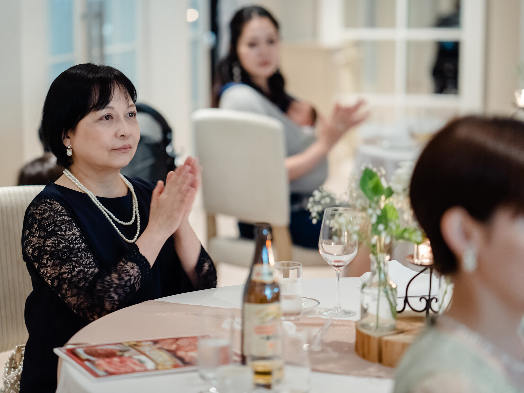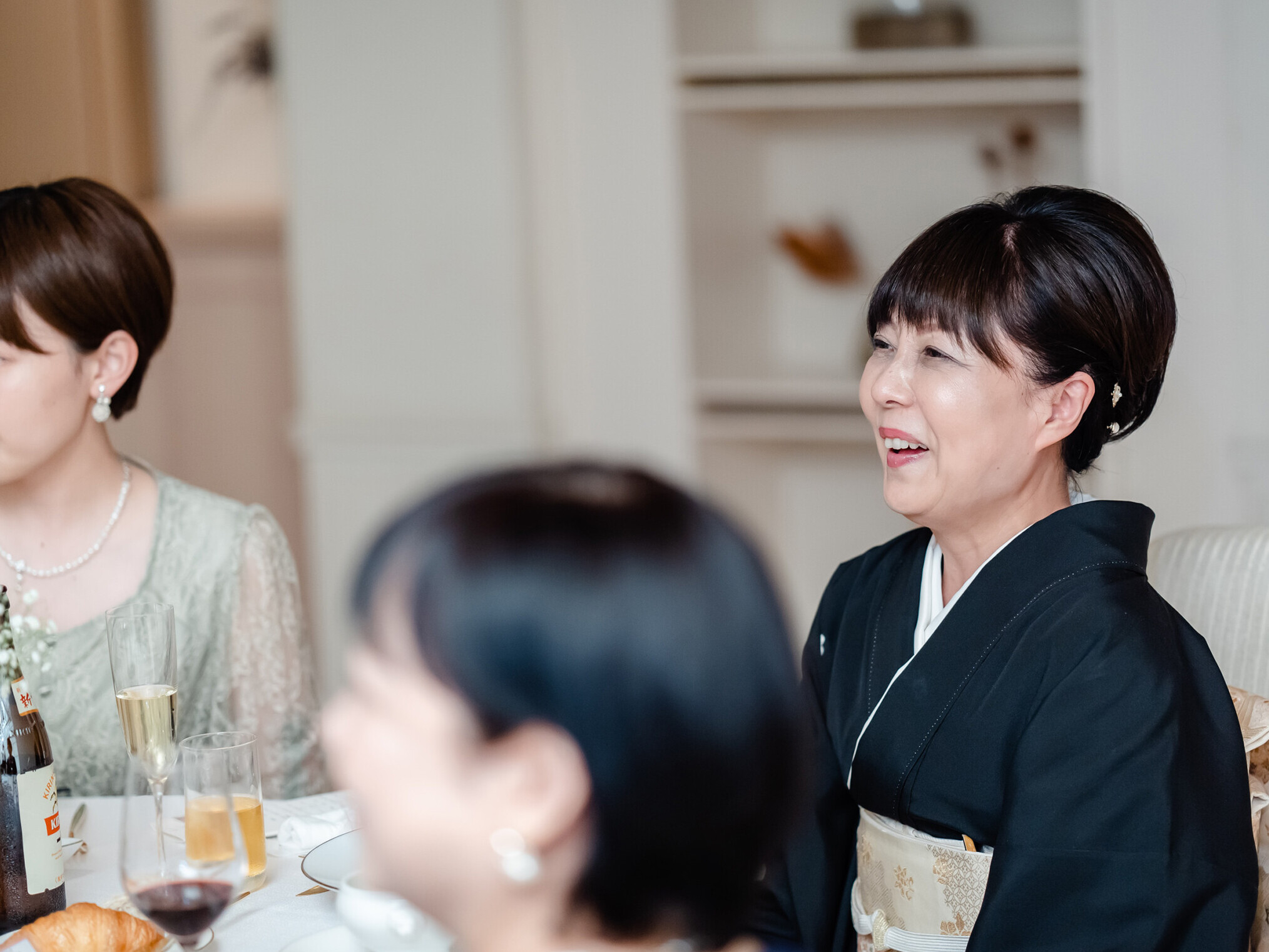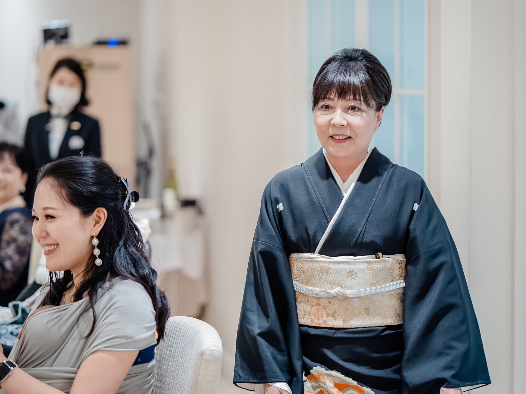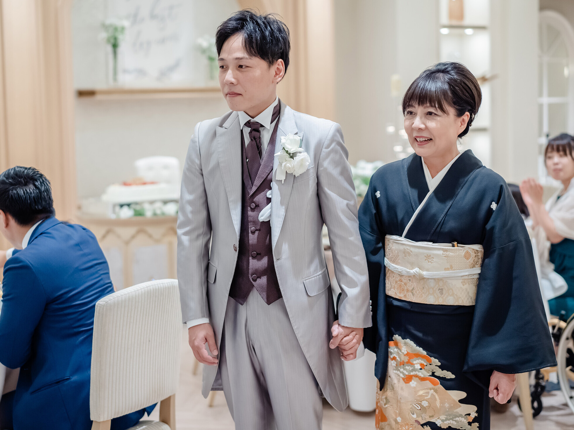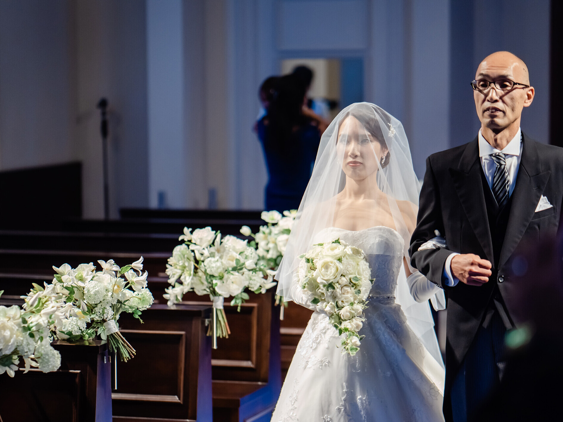 「親御様にドレス姿を直接みてもらいたい」 そんな想いから結婚式をすることを決めたおふたり 挙式の前にファミリーミートを行い、 誰よりも先にドレス姿を見てもらうことにしました 挙式や披露宴ではゲストとの距離が近づくような演出を入れて 写真タイムもしっかり取り、思い出が沢山残せる時間づくりを意識しました