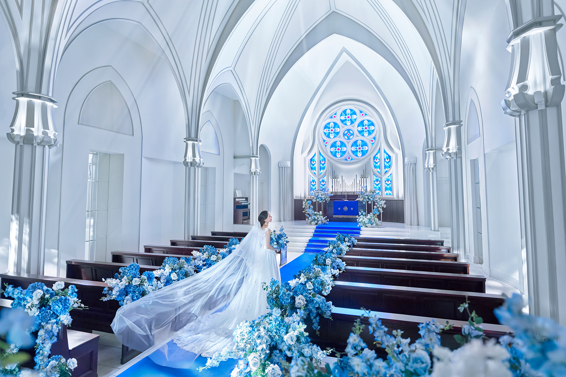 神秘的なブルーのステンドグラスとドレスが映えるバージンロード 青い世界が広がる美しいチャペルで荘厳な雰囲気