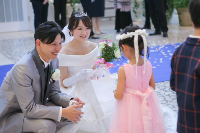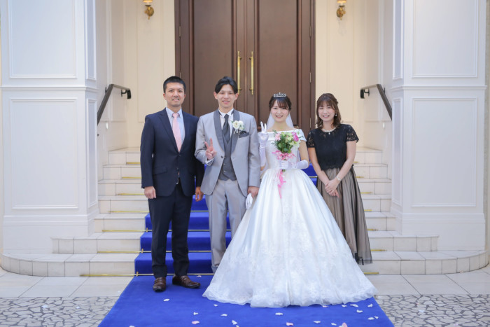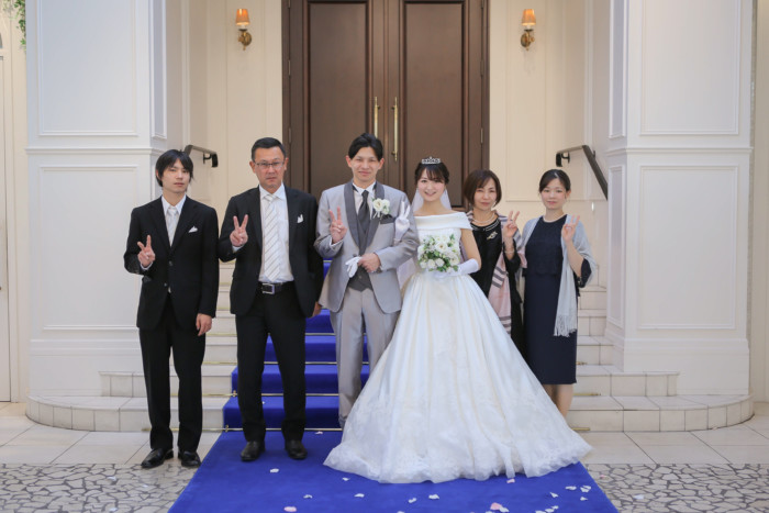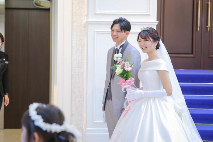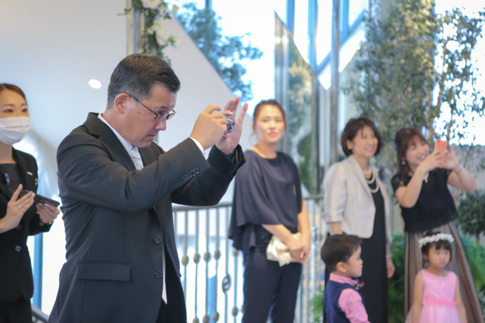 扉が開くと、サプライズでゲスト皆様が花道を作って下さいました! おふたりも笑顔いっぱいで登場してくださいました。