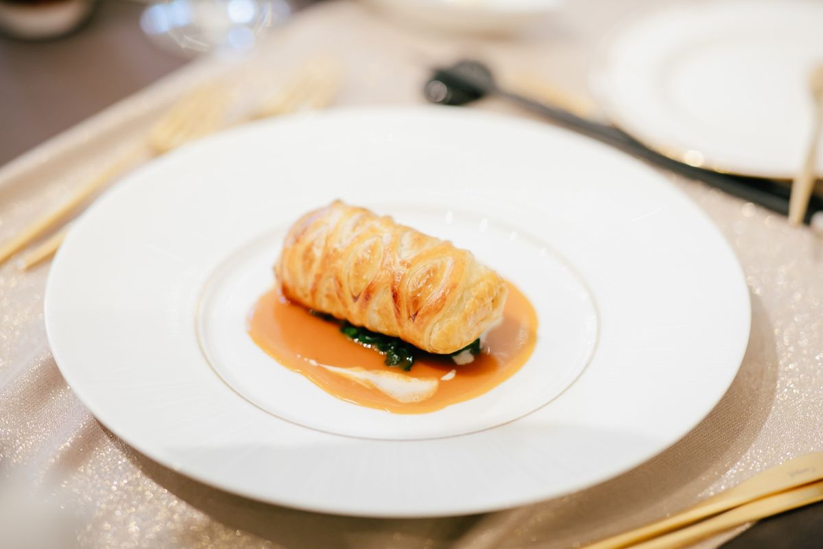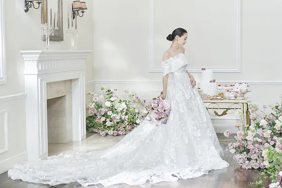 披露宴会場は、天井にシャンデリアが輝く、ラグジュアリーな雰囲気の『デビュタント ボール』です。空間を彩る装花は、グリーンとホワイトを基調に、小さめの花を中心にあしらったナチュラルなアレンジでした。全体的に控えめなデザインにされたのは、よりおふたりの姿が引き立つための工夫だそう。 お料理は、見学の際に気に入ってくださった『”手毬”平目のアンクルート』を取り入れたメニューで、皆様からも大変好評でした。