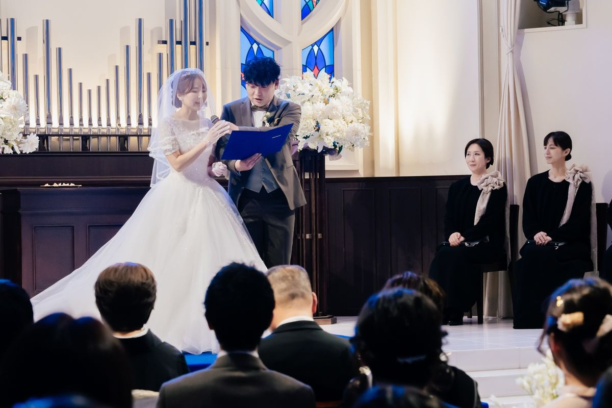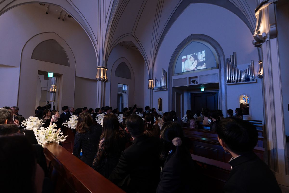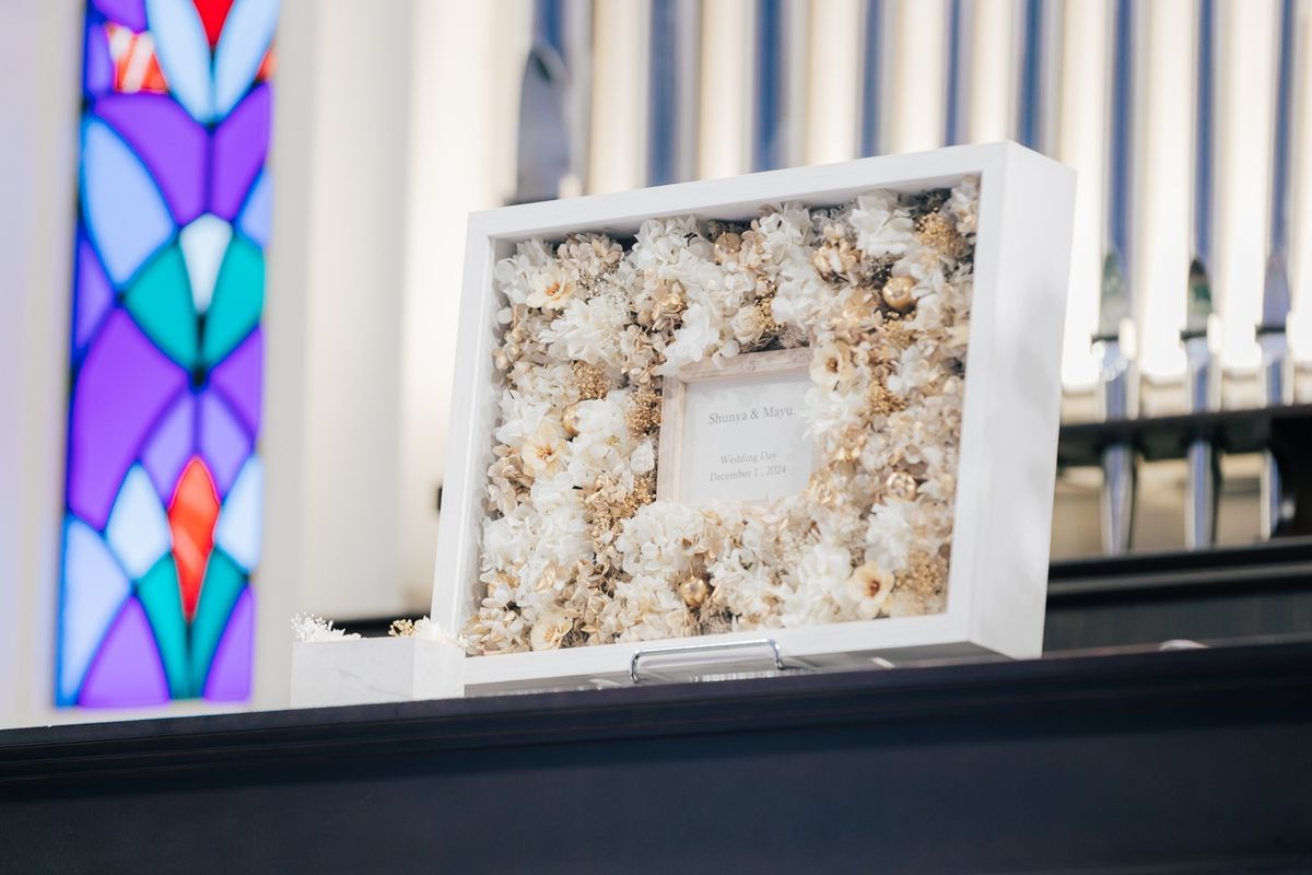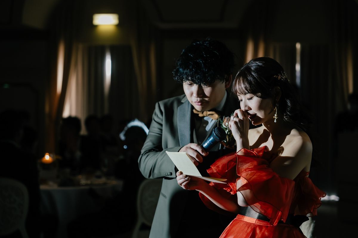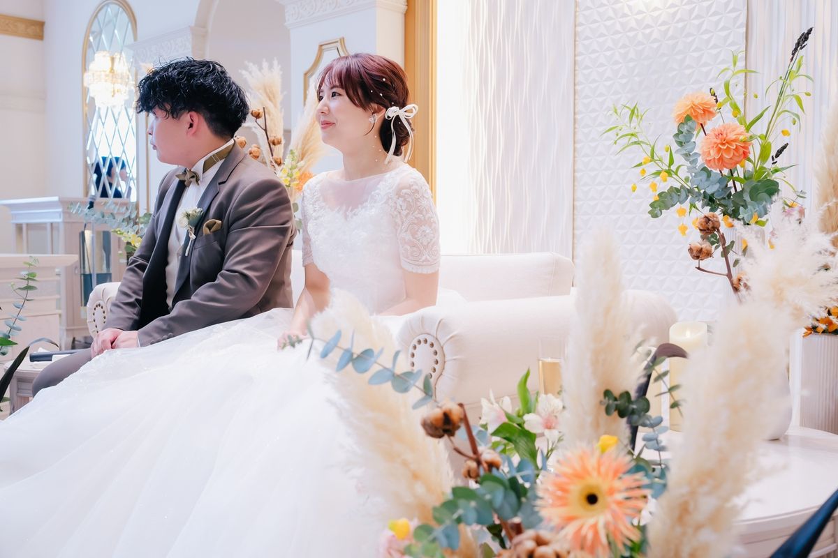 初回見学から「人」を重視されていたおふたり。ご準備期間中も丁寧に確認を重ね、不安な点はこまめに相談されていました。ゲストに喜んでいただくため、動画や演出も手作りされ、司会とも綿密に打ち合わせを。受付ではスイッチングレターを用意し、待ち時間も心温まる時間に。感謝の気持ちをカタチにすることを軸に、丁寧にご準備を進めていた印象です。また、12月の結婚式のため、「冬」の雰囲気も意識されていました。