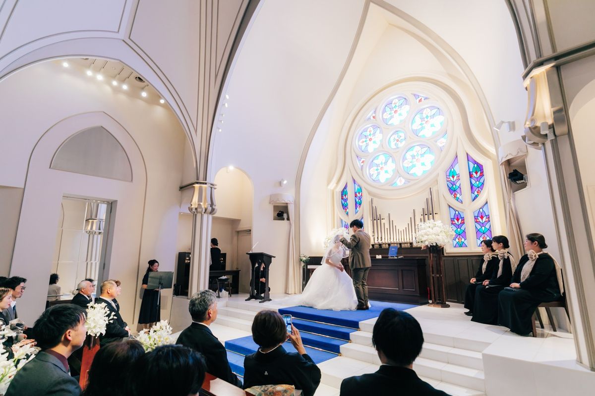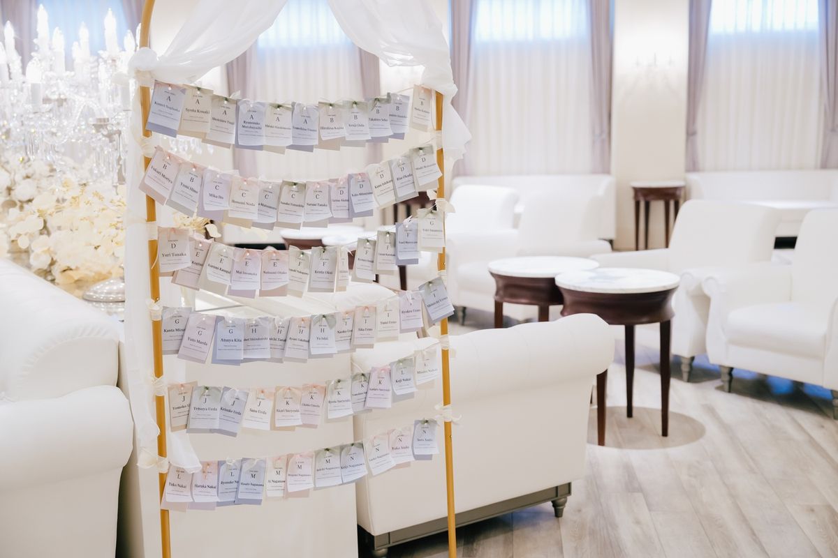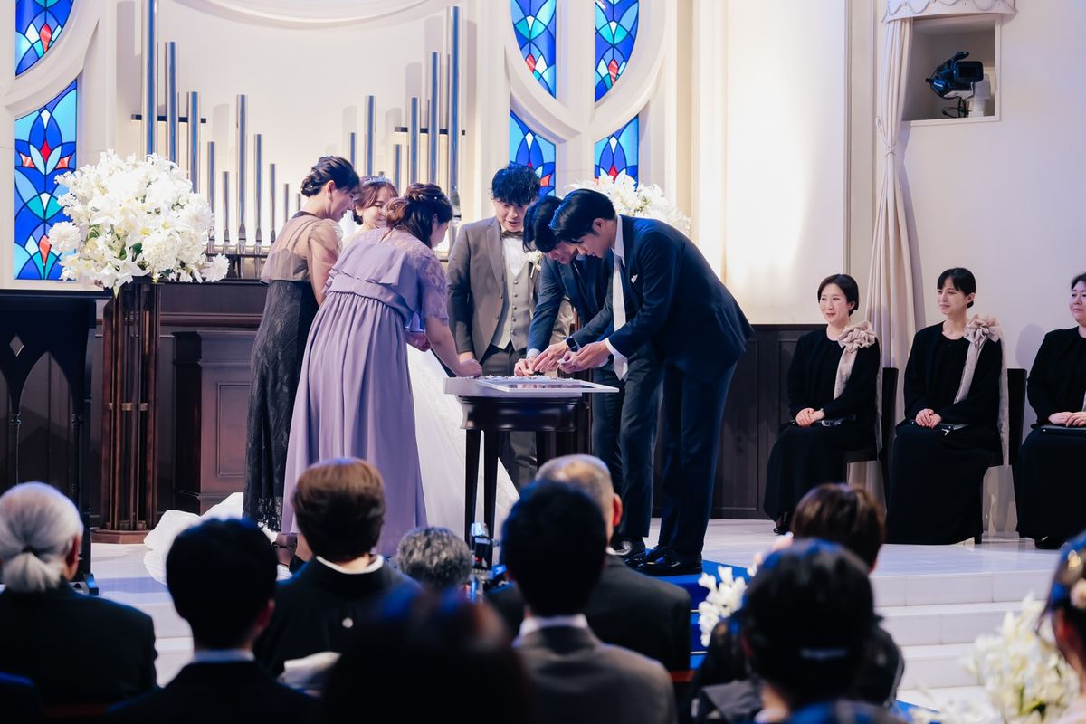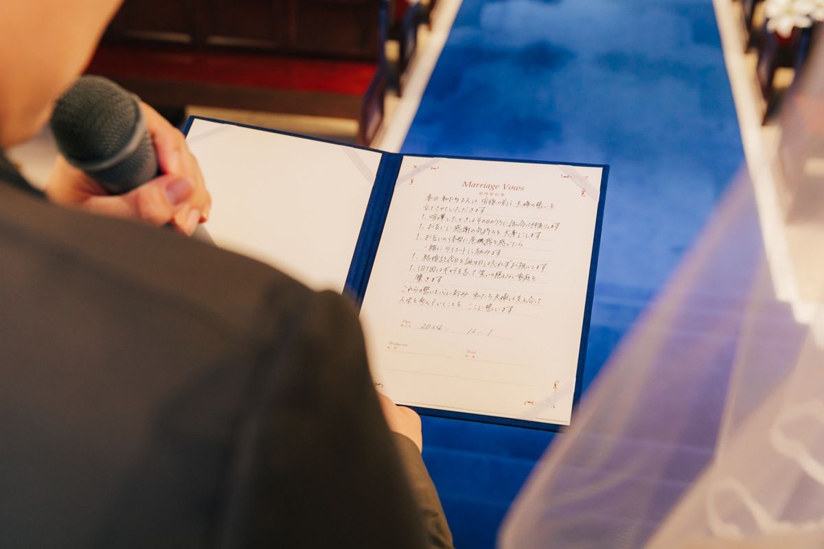 初回見学から「人」を重視されていたおふたり。ご準備期間中も丁寧に確認を重ね、不安な点はこまめに相談されていました。ゲストに喜んでいただくため、動画や演出も手作りされ、司会とも綿密に打ち合わせを。受付ではスイッチングレターを用意し、待ち時間も心温まる時間に。感謝の気持ちをカタチにすることを軸に、丁寧にご準備を進めていた印象です。また、12月の結婚式のため、「冬」の雰囲気も意識されていました。
