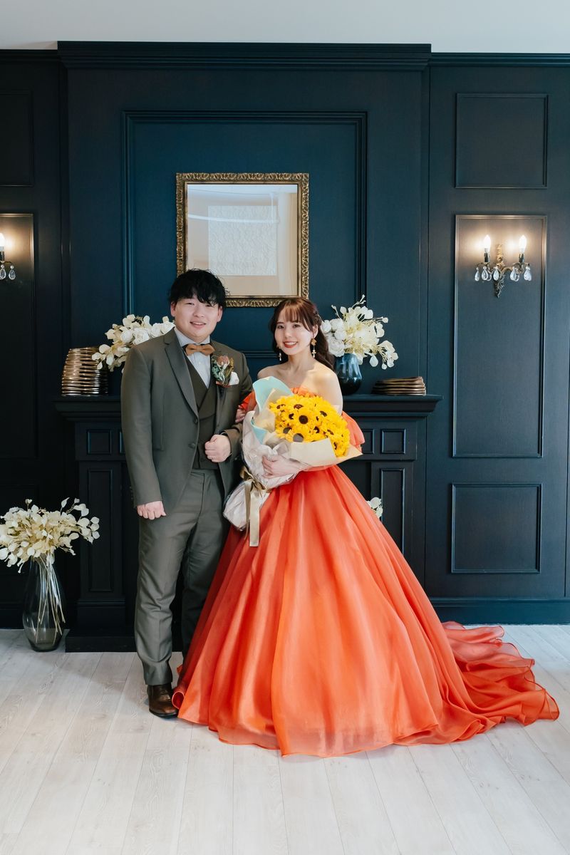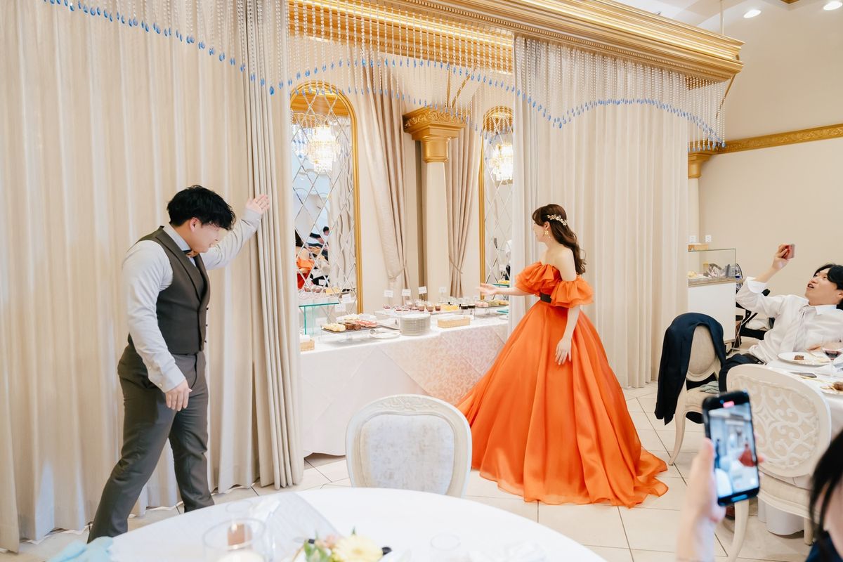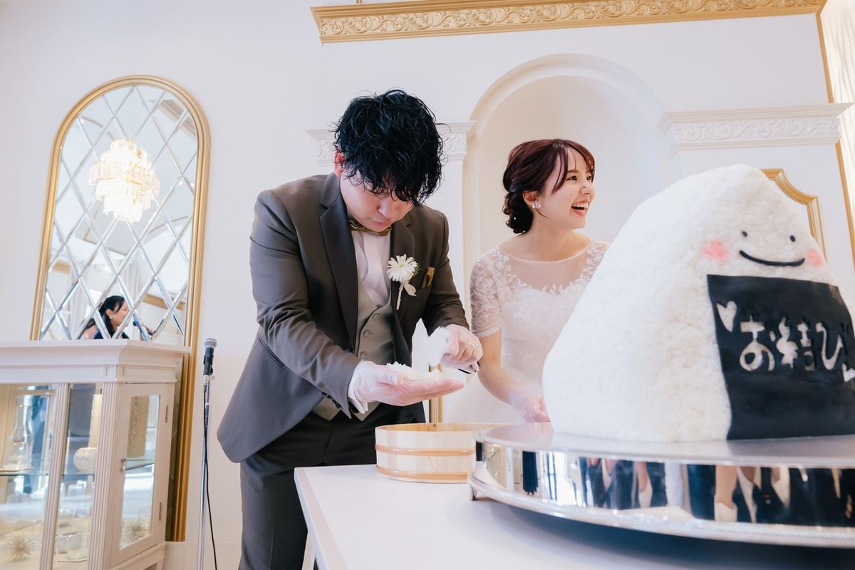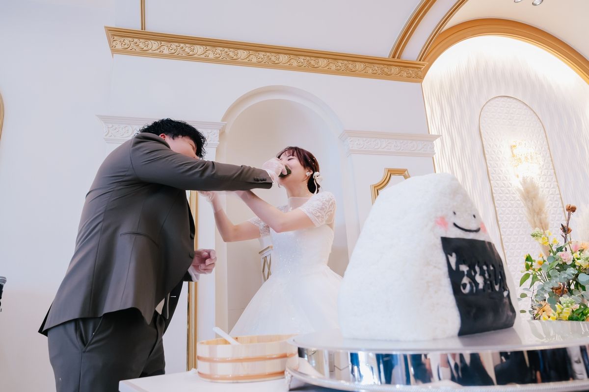 3つの会場から選んでいただいた「デビュタント ボール」での、ベージュやオレンジ系の暖色を基調としたナチュラルな装花を合わせた披露宴です。司会者の事前収録を活用したゲスト紹介や、入場曲を当てるクイズ形式の演出など、常にゲストとつながる工夫が凝らされていました。サプライズのデザートビュッフェや、“お結び”の意味を込めた特大のおにぎりなど、ユーモアあふれる演出が印象に残っています。