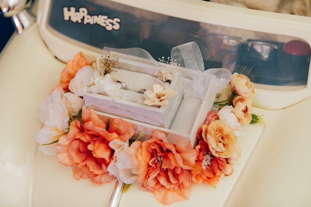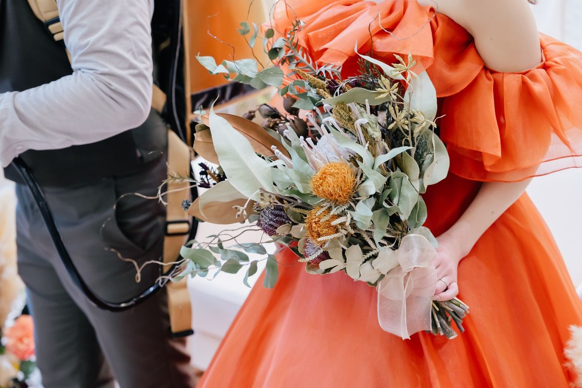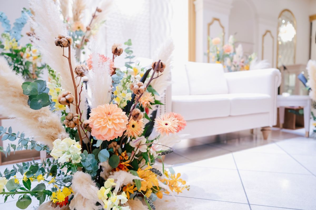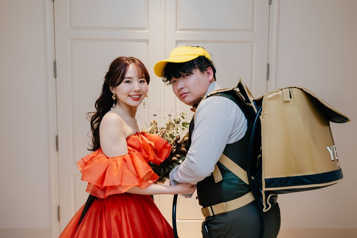 3つの会場から選んでいただいた「デビュタント ボール」での、ベージュやオレンジ系の暖色を基調としたナチュラルな装花を合わせた披露宴です。司会者の事前収録を活用したゲスト紹介や、入場曲を当てるクイズ形式の演出など、常にゲストとつながる工夫が凝らされていました。サプライズのデザートビュッフェや、“お結び”の意味を込めた特大のおにぎりなど、ユーモアあふれる演出が印象に残っています。