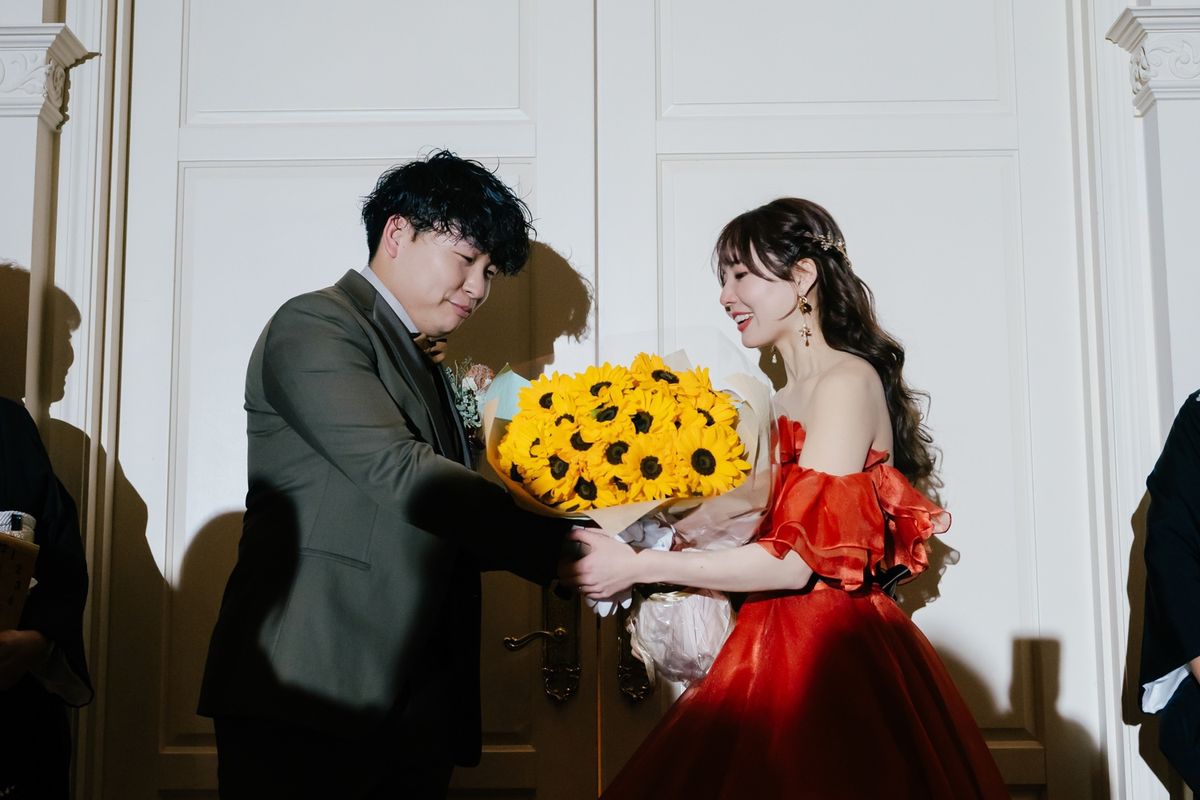 お料理はボリュームのあるコースをお選びいただき、ゲストの皆様からは温かいお皿で提供された点も「良かった!」とのお言葉を頂戴しました。披露宴終盤ではご新婦へのサプライズで、ご新郎からの花束のプレゼントが行われ、感動的なクライマックスに。プランナーと綿密に練られた内容に、会場中が温かな空気に包まれました。感謝の気持ちがしっかり伝わる、まさにテーマを体現した一日でした。