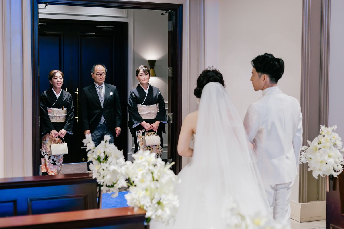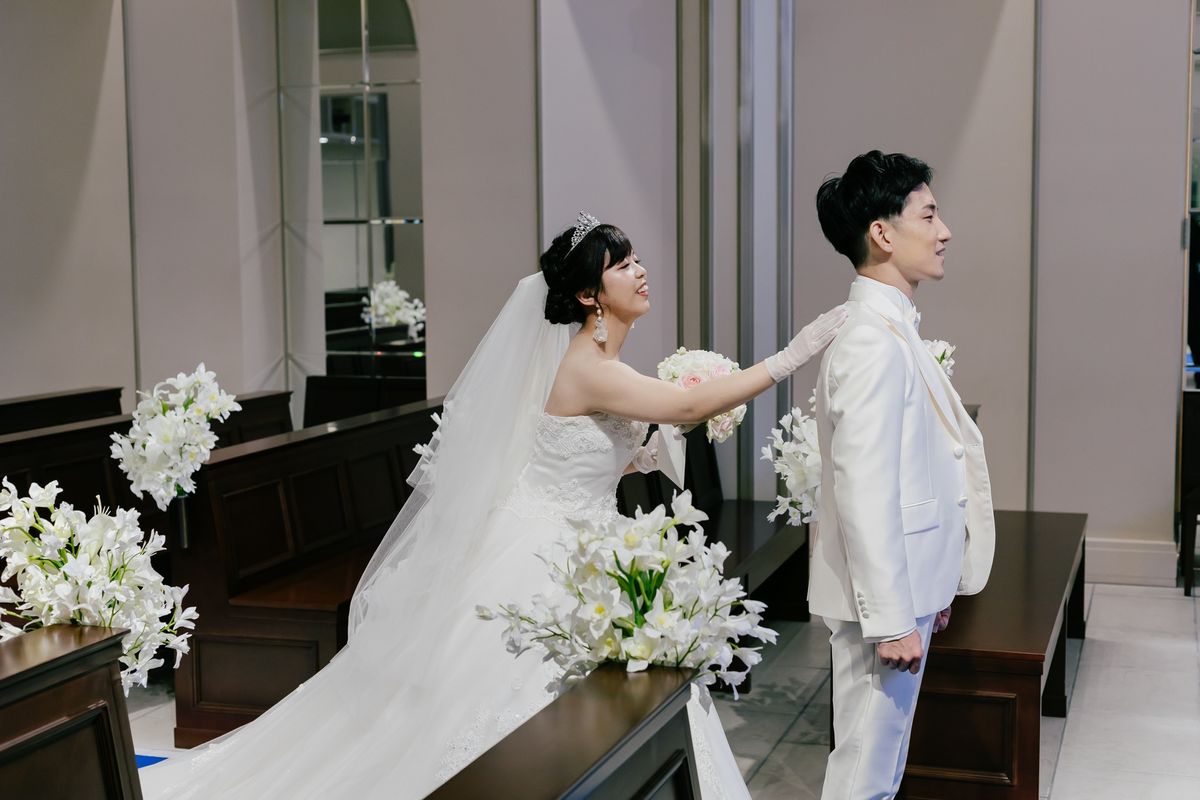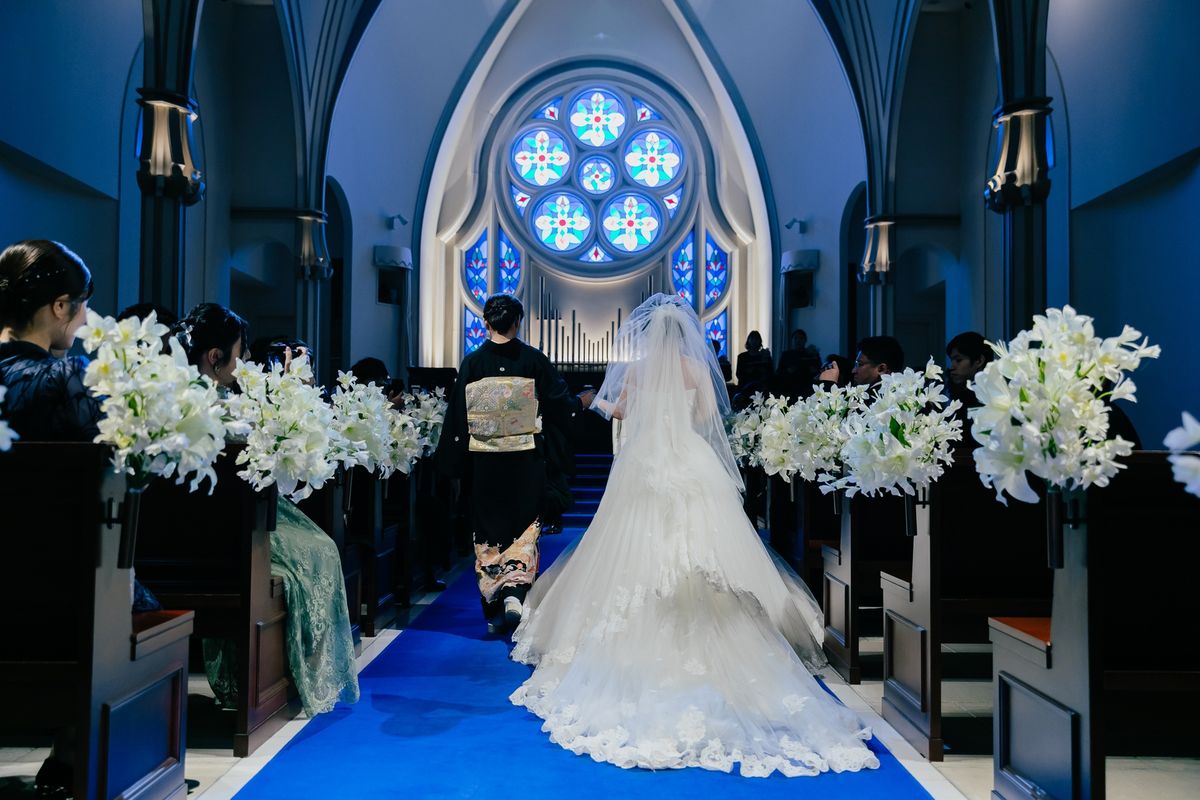 挙式では、長いバージンロードをお母様との思い出を振り返りながら一歩一歩噛み締めて歩くことができたというご新婦。青いバージンロードに、胸元がきらめくウェディングドレスがより一層映えていらっしゃいました。全面のレースが2つに分かれた、他にはないデザインが特徴の一着で、スタイリストと一緒によりご自身に似合うドレスを選んでいったそうです。