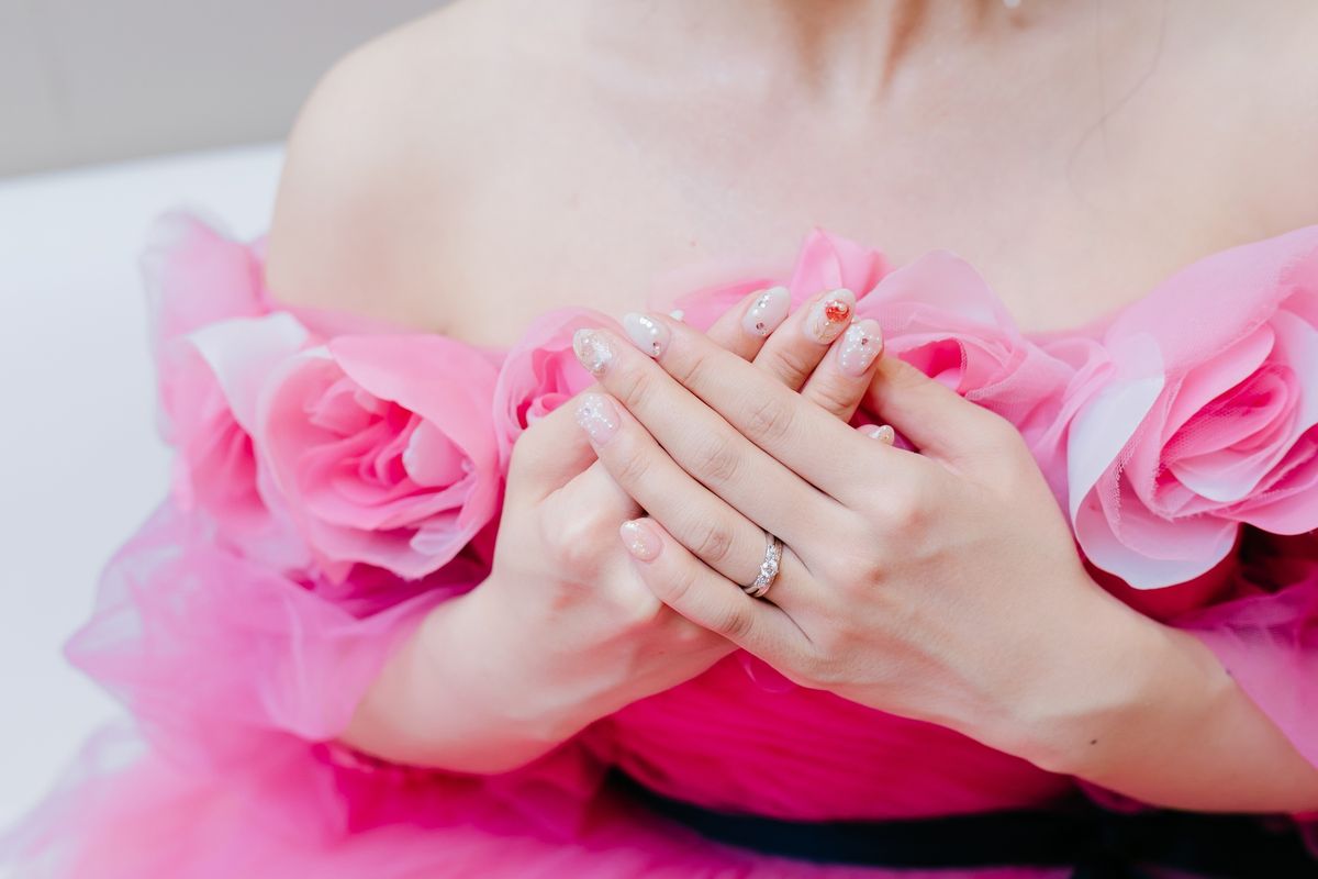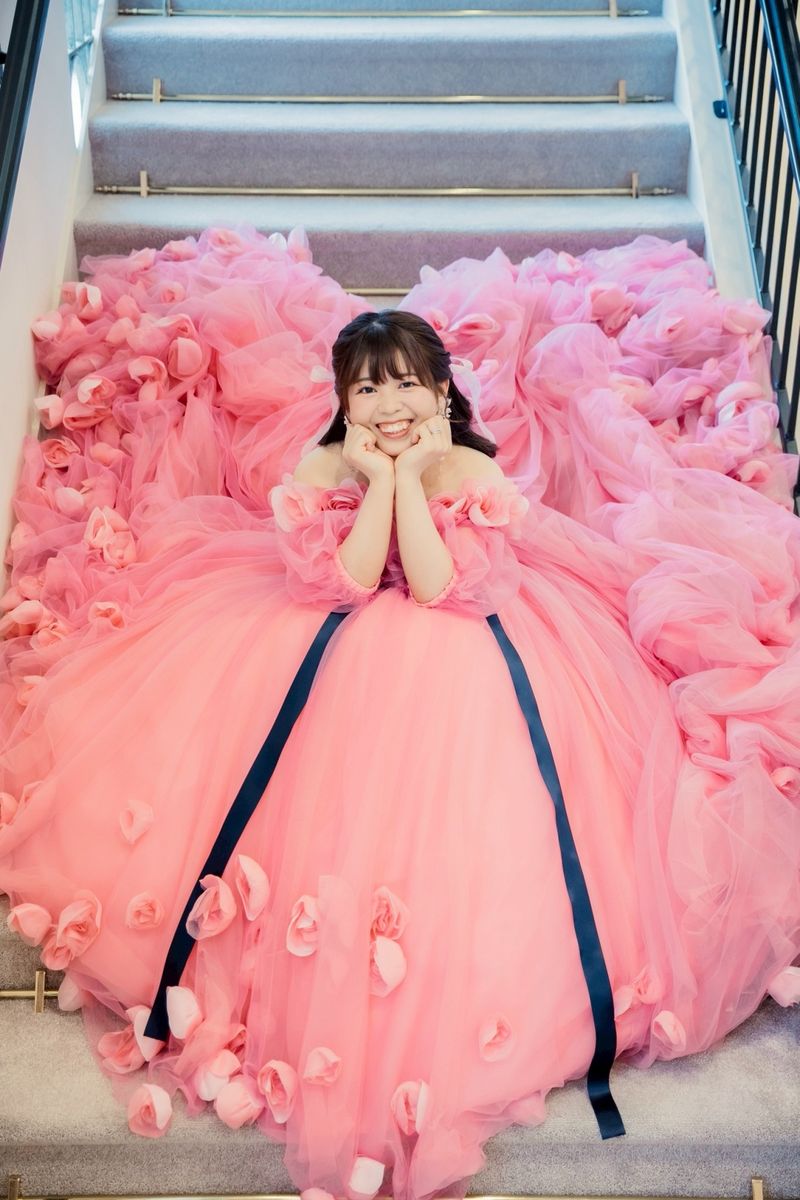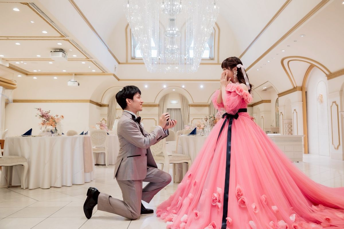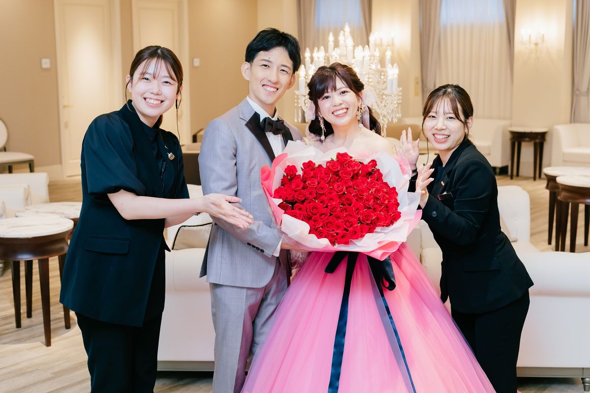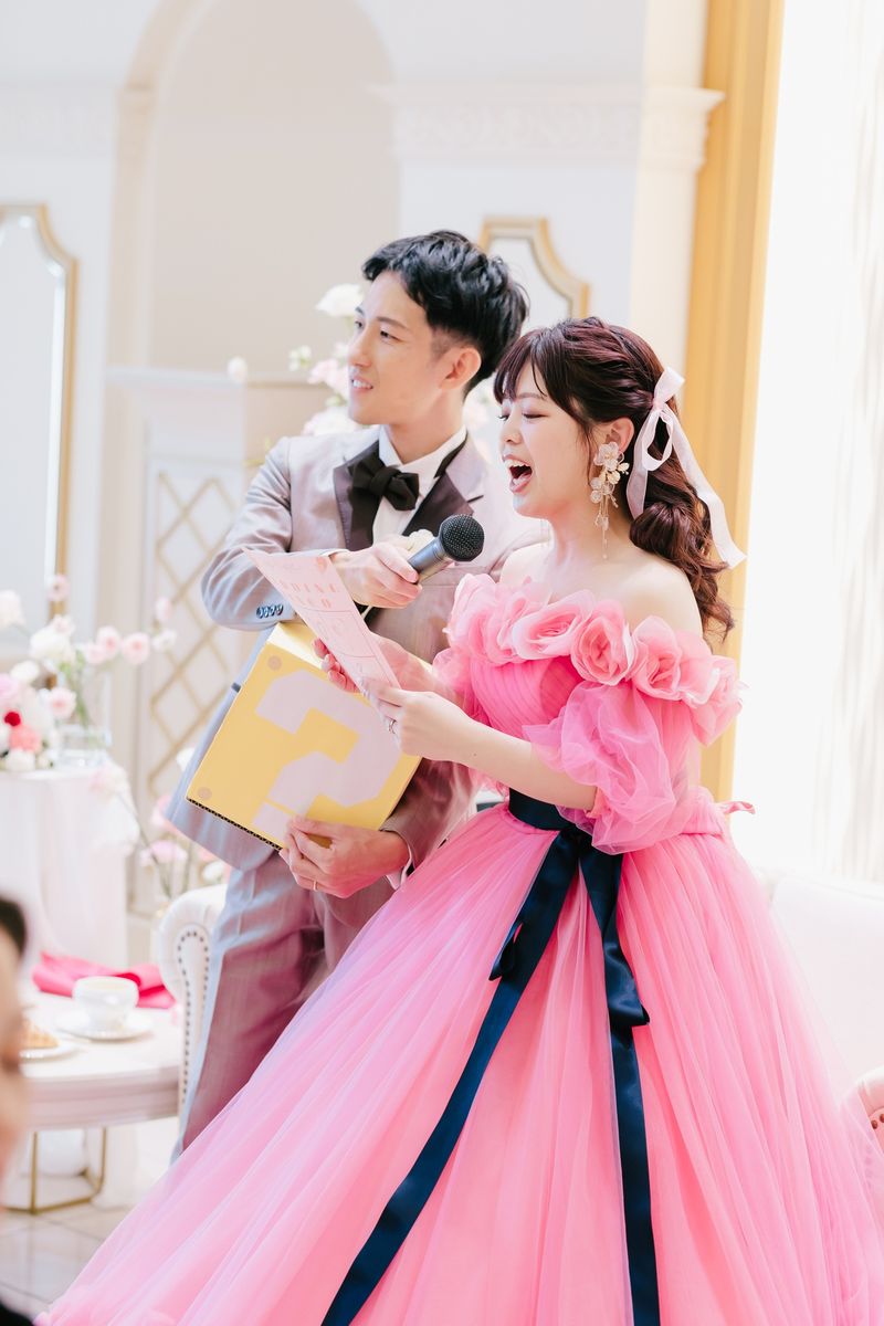 シャンデリアが輝く白を基調としたパーティ会場に、とにかく可愛くなるようにと装花は赤・白・ピンクのバラをメインに使用されました。ところどころにリボンを入れた点もこだわりです。カラードレスは鮮やかなピンクにたくさんのお花があしらわれていて、会場の雰囲気にもご新婦の好みにもぴったりの一着に。さらにピンク色やリボンのアクセサリー・ネイルを合わせ、まさに「アイドル」のようにキラキラと輝いていました。