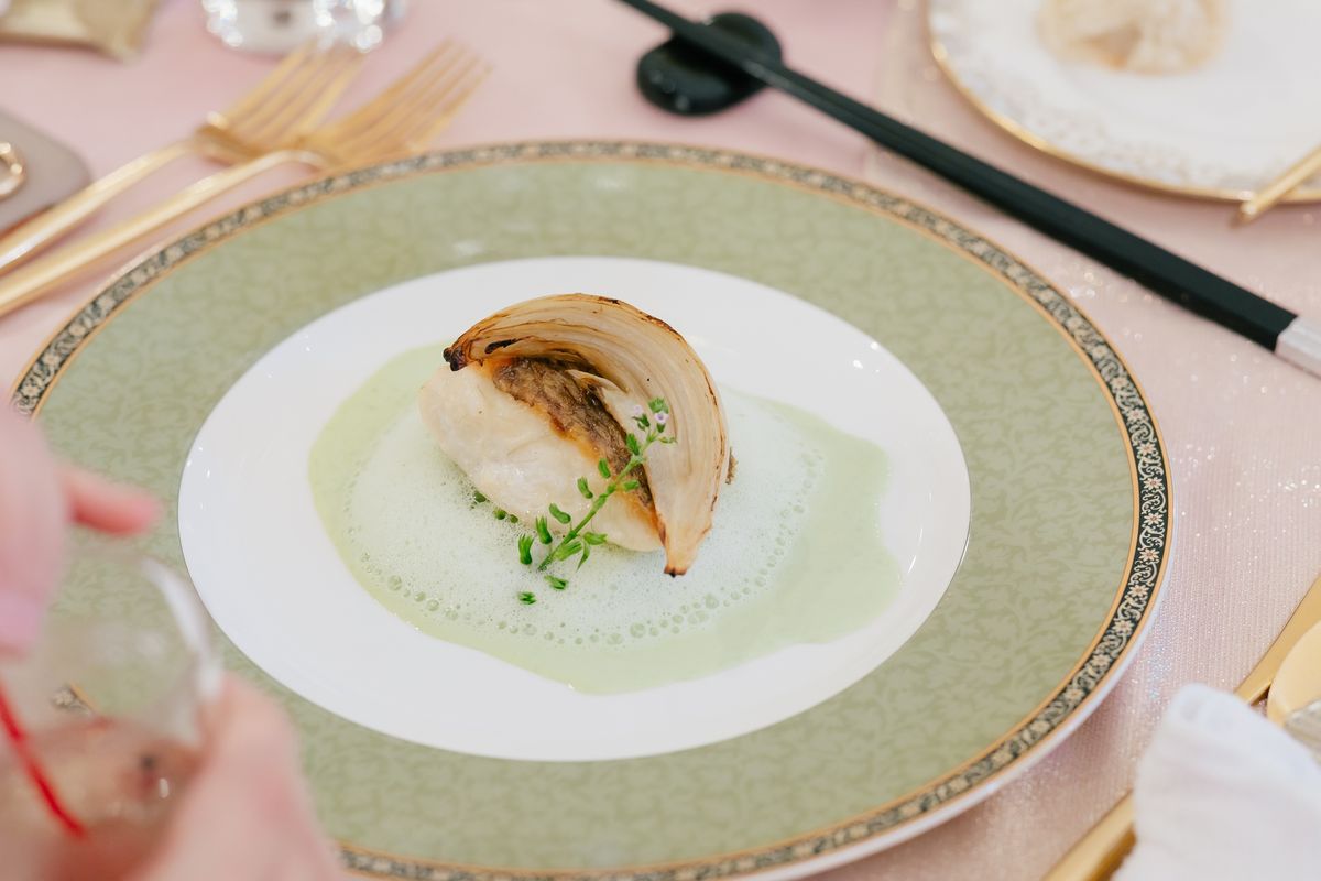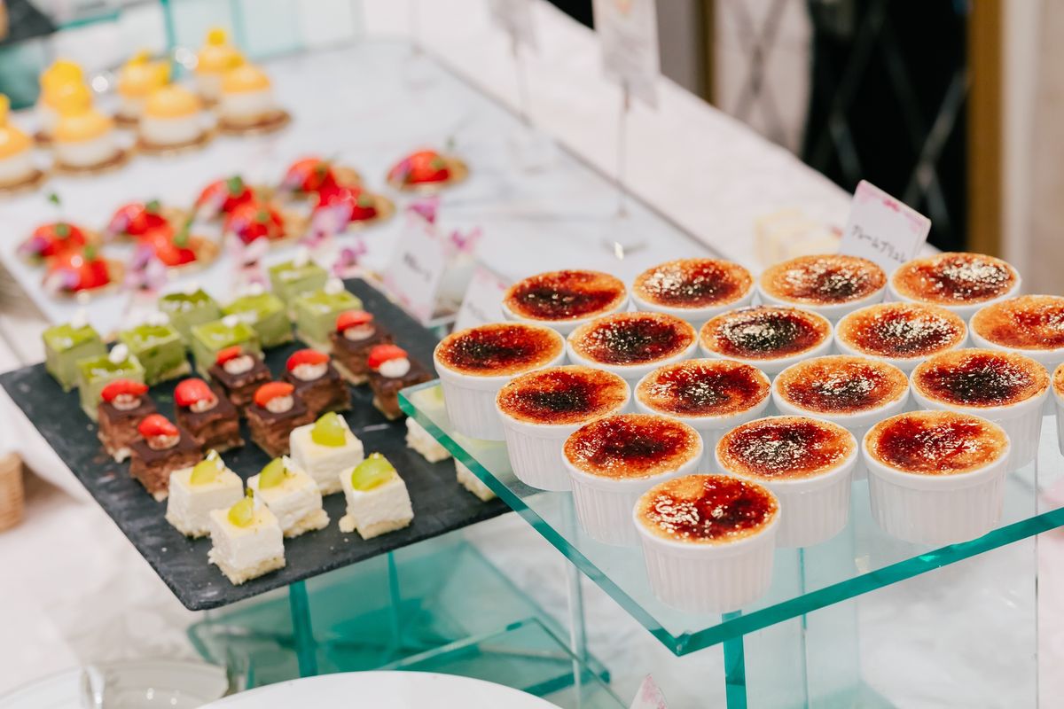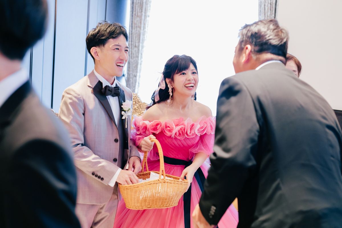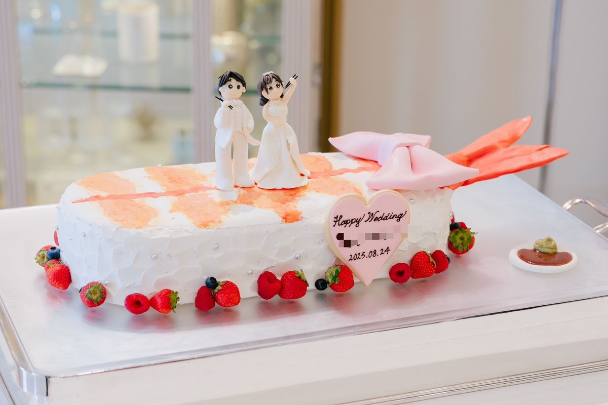 ゲストの皆様にも心から楽しんでもらえることを大切にしたおふたり。中座後の再入場では、ドレス・タキシード当てを兼ねてペンライトを振ってもらい、ライブ会場のような空間を創り上げました。お料理についてもゲストが満足できるかを基準にメニューを選び、デザートビュッフェも取り入れています。ウェディングケーキはエビのお寿司の形で、お寿司をお箸で食べているようなマジパンを乗せた、楽しいものになりました。