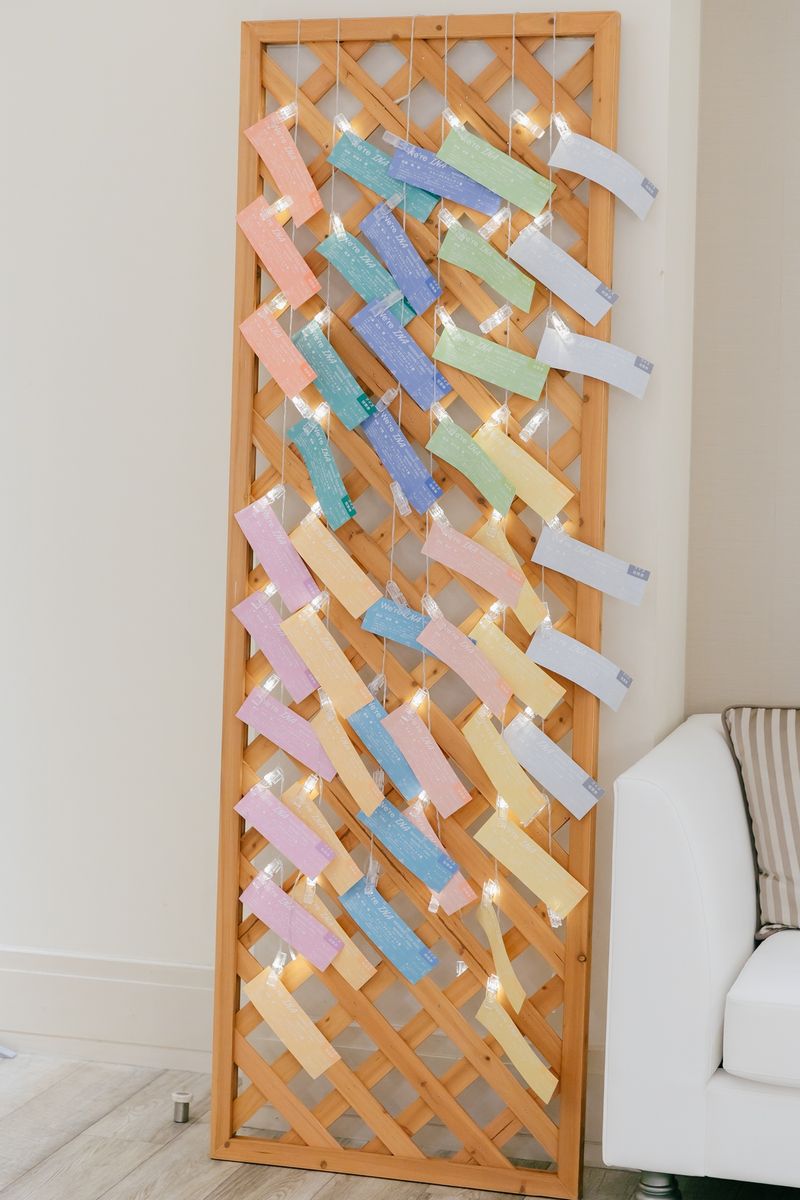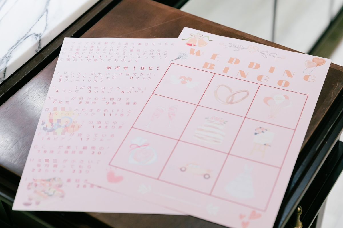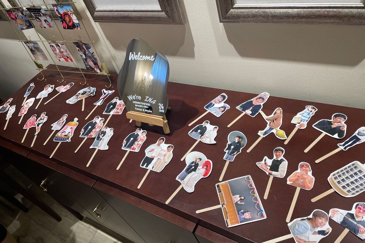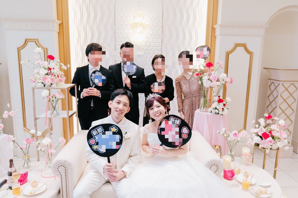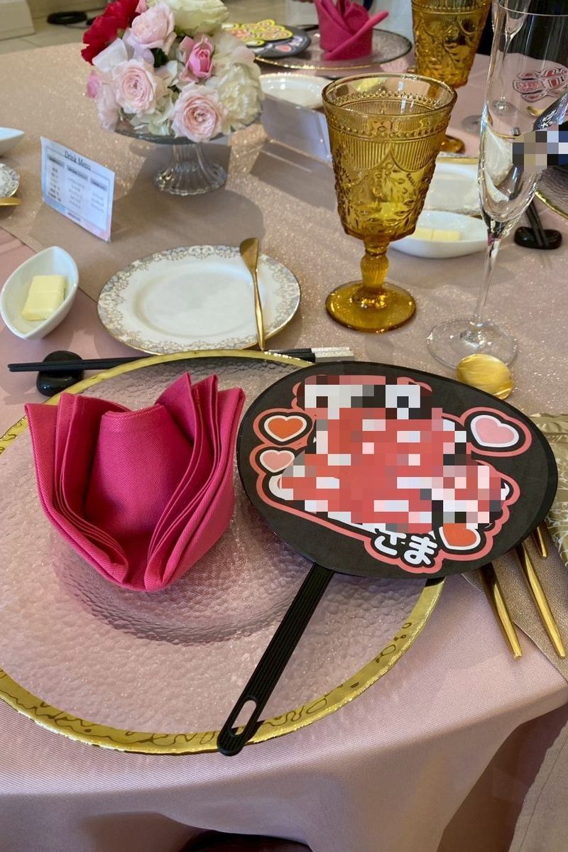 準備期間中は時間をかけて打ち合わせをし、希望を全て叶えられるよう、プロデューサーと一緒に創り上げていきました。時間に追われながらも、おふたりで協力しながら一生懸命準備を進めていたのが印象的です。エスコートカードはライブチケット風に、うちわ型にした席札の表面にはゲストの名前、裏面にはファンサービス風の言葉を選んで、貼ってもらう仕様にしました。できるだけアイテムは手作りし、節約にも繋げていらっしゃいます。