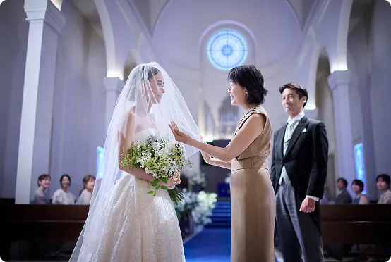 扉が開くその瞬間、夢に描いた花嫁姿が息をのむほどに美しく輝きます。 運命の一着を纏う喜びは、花嫁を内側からも輝かせるもの。 アニヴェルセルでは、半年間にわたる丁寧なサポートで、おふたりにふさわしいドレス選びを共に歩んでいきます。