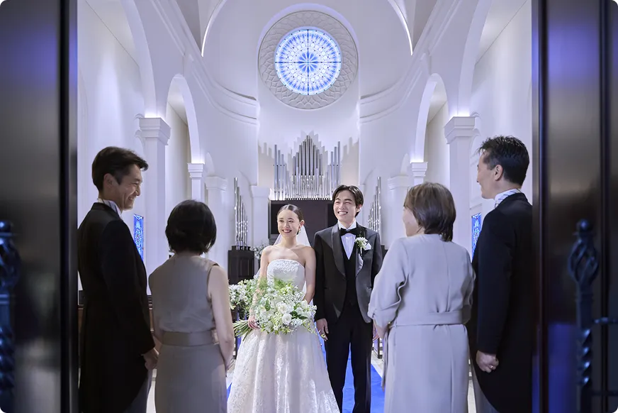 挙式の前には、ゲストの中で一番早くご家族と顔をあわせる特別な時間を。緊張がほどけ、笑顔がこぼれるこの時間に、これまでの想いがそっとかさなります。心がひとつになったそのあと、いよいよ挙式が始まります。
