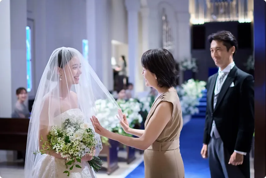 ベールは、ご新郎のもとへ向かうご新婦を守る特別なもの。そのベールを整えてくれるのは、おふたりにとって大切な存在。想いを受け取り、新しい人生へと歩み出す前の、かけがえのない時間となります。