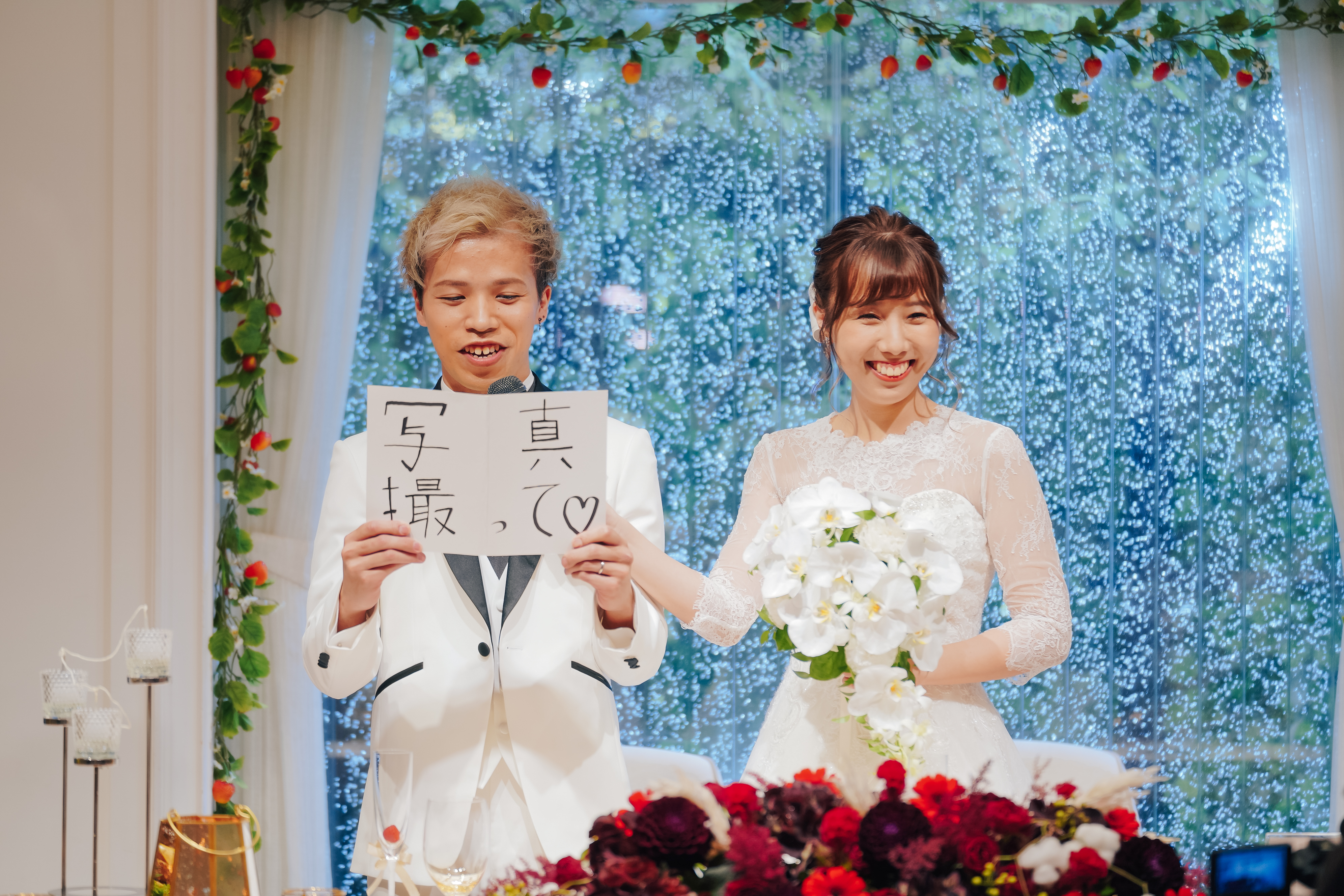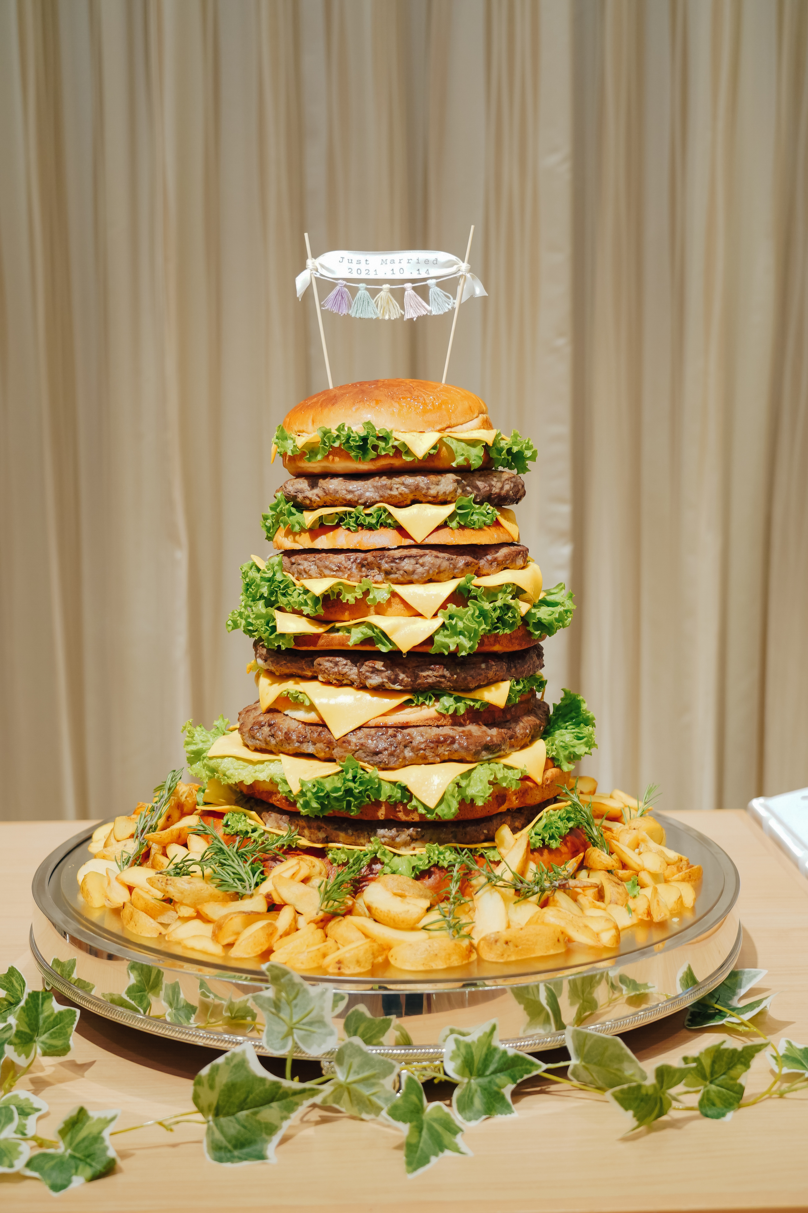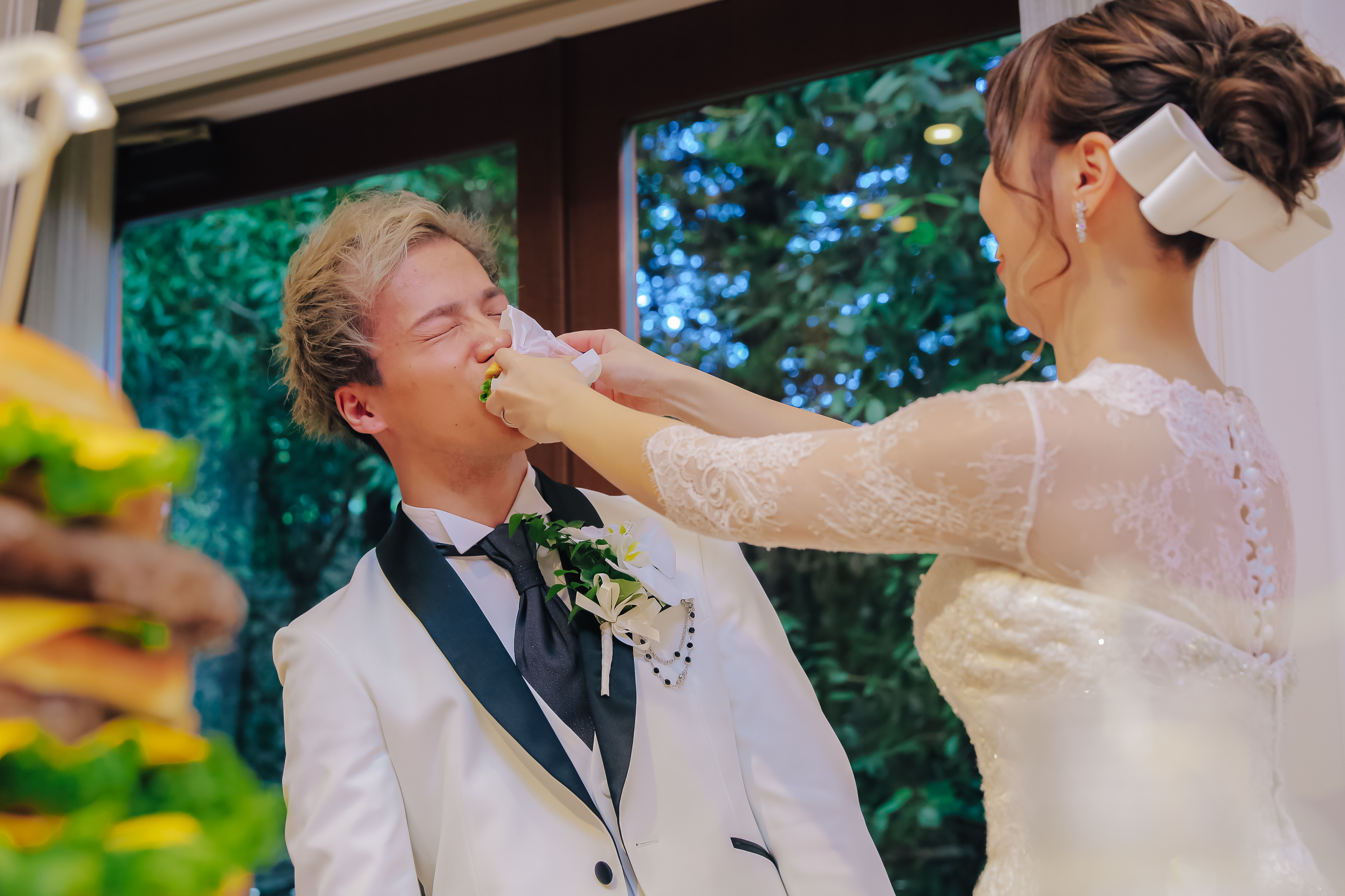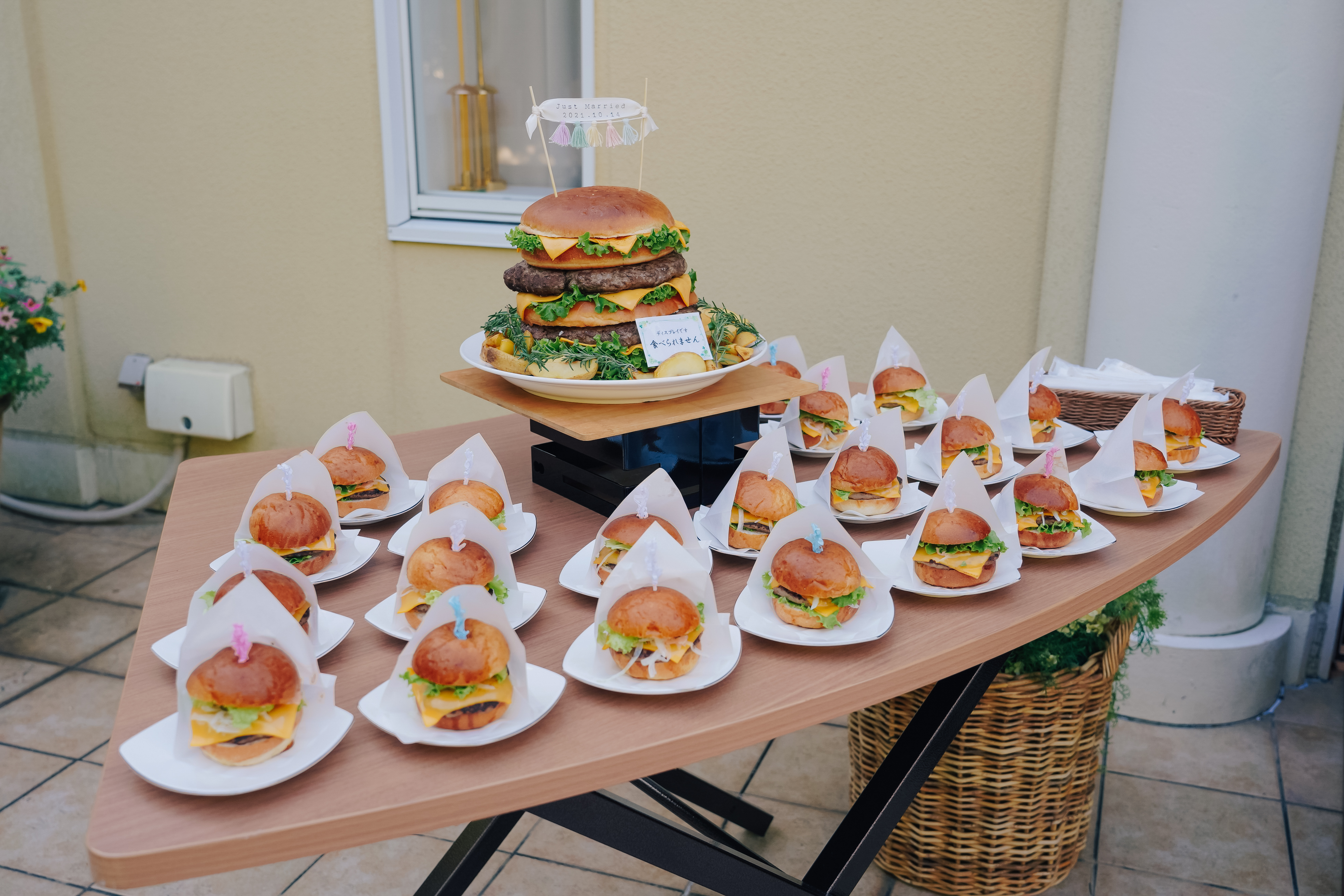 親しいご友人様とアットホームに過ごしたいとご希望いただいていたおふたり。かねてからの希望であったリングドックは大成功!おふたりならではのオリジナリティが出したい!とケーキは特大の3段ハンバーガーに!これにはゲストもびっくり!ゲスト想いのおふたりはみんなへのサプライズをたくさん計画しました!
