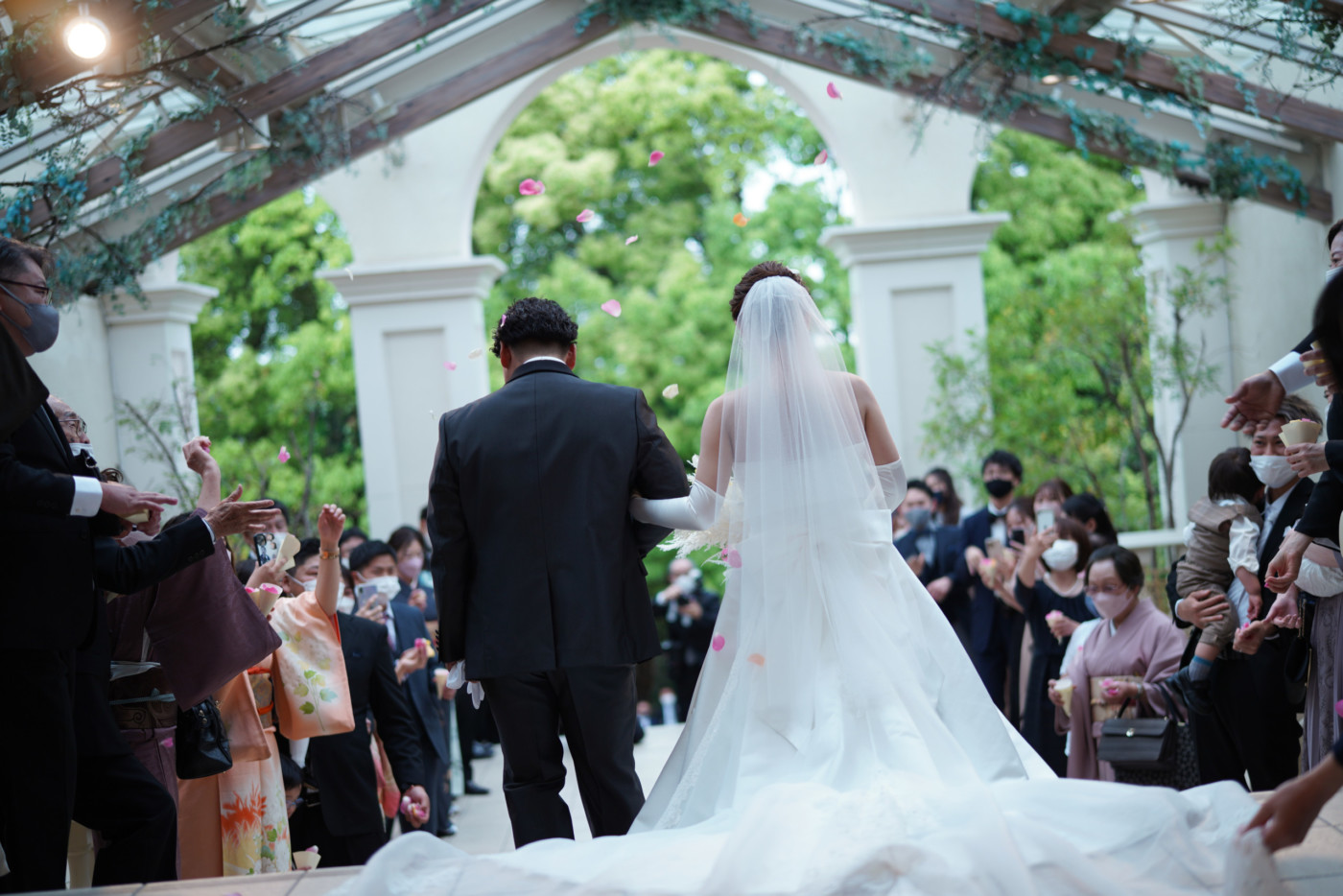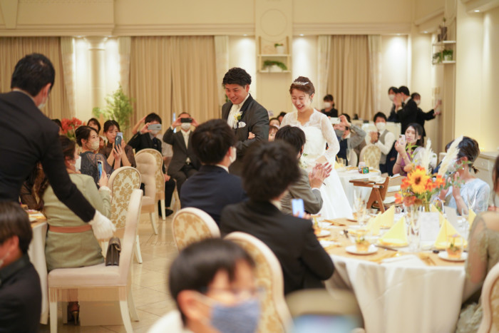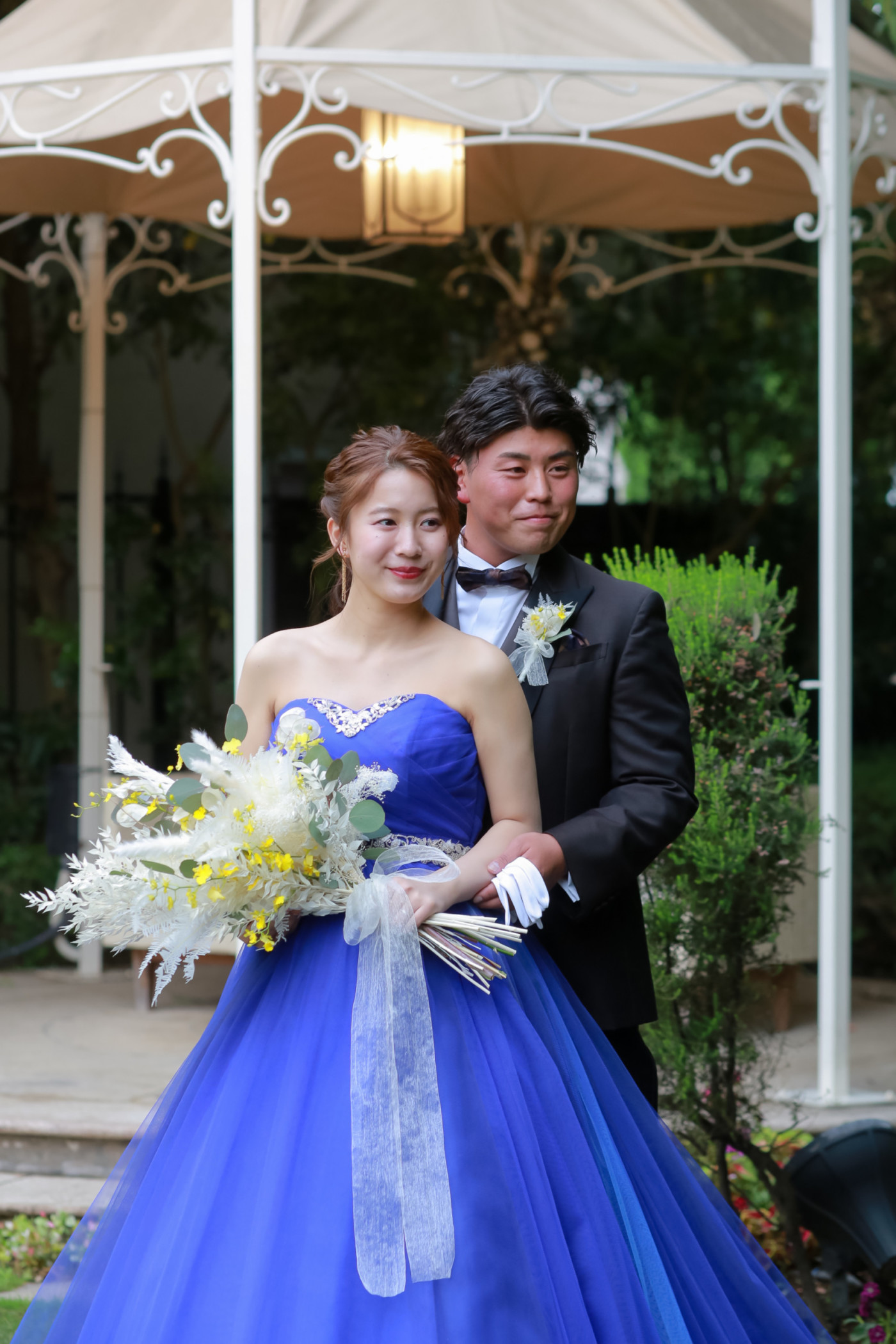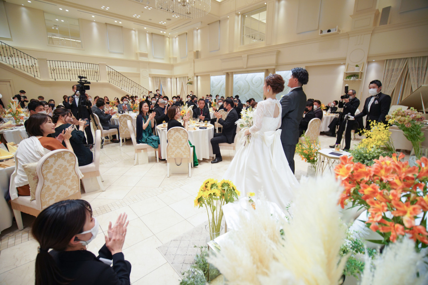 おふたりがブライダルフェアにお越しになられたのは1月末。「本当は5月に結婚式をしたいと思っていたが、準備が間に合うかどうか不安な気持ちがありました。しかし、担当のプロデューサーさんとの打合せでどんどんイメージが膨らみ、安心して当日を迎えることが出来ました。」とお言葉を頂きました。 特におふたりが大切にされたことは"ゲストと過ごす時間"であり、お越しいただいたゲストみなさまとたくさんお話が出来て、写真が撮れるアットホームな1日となりました。