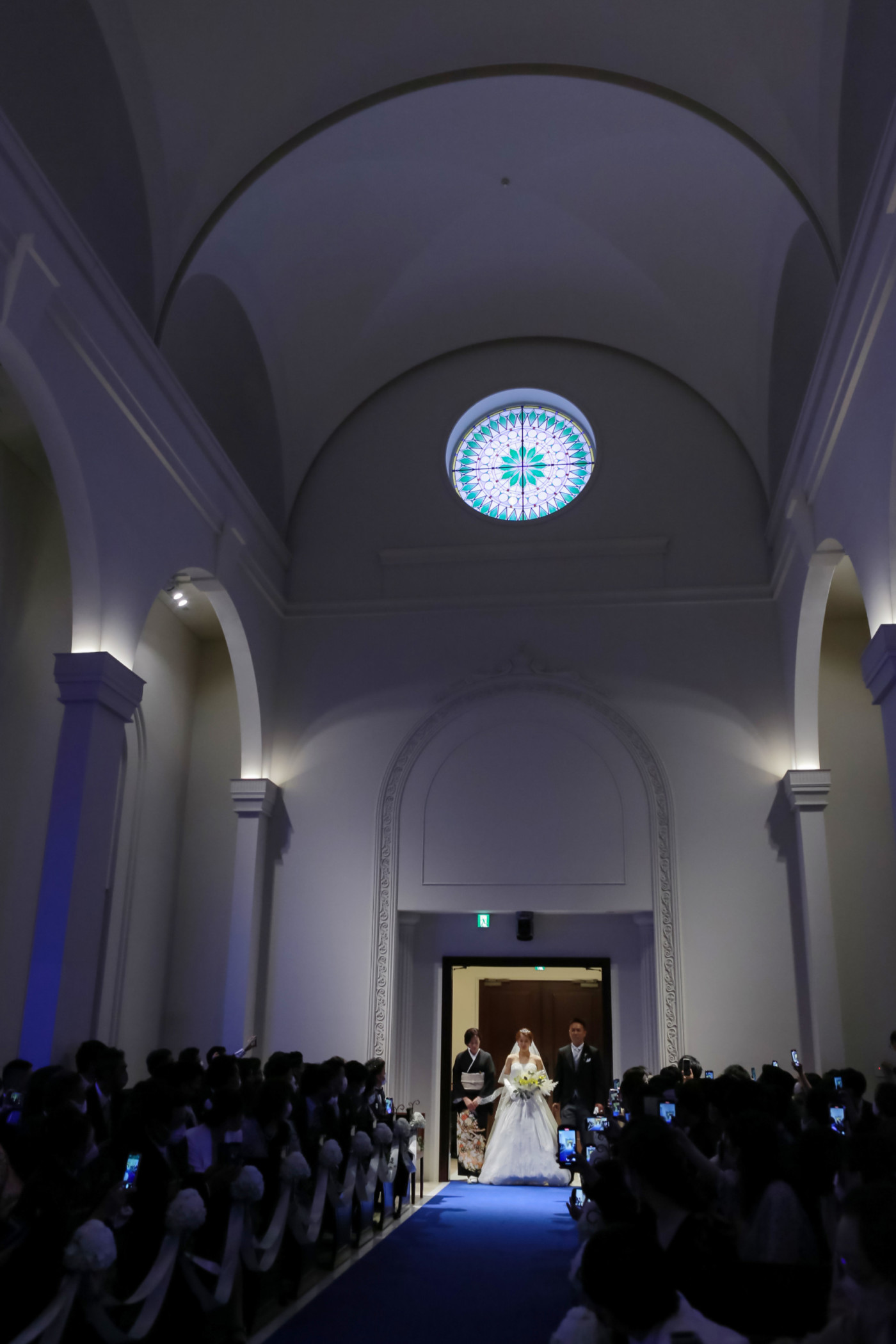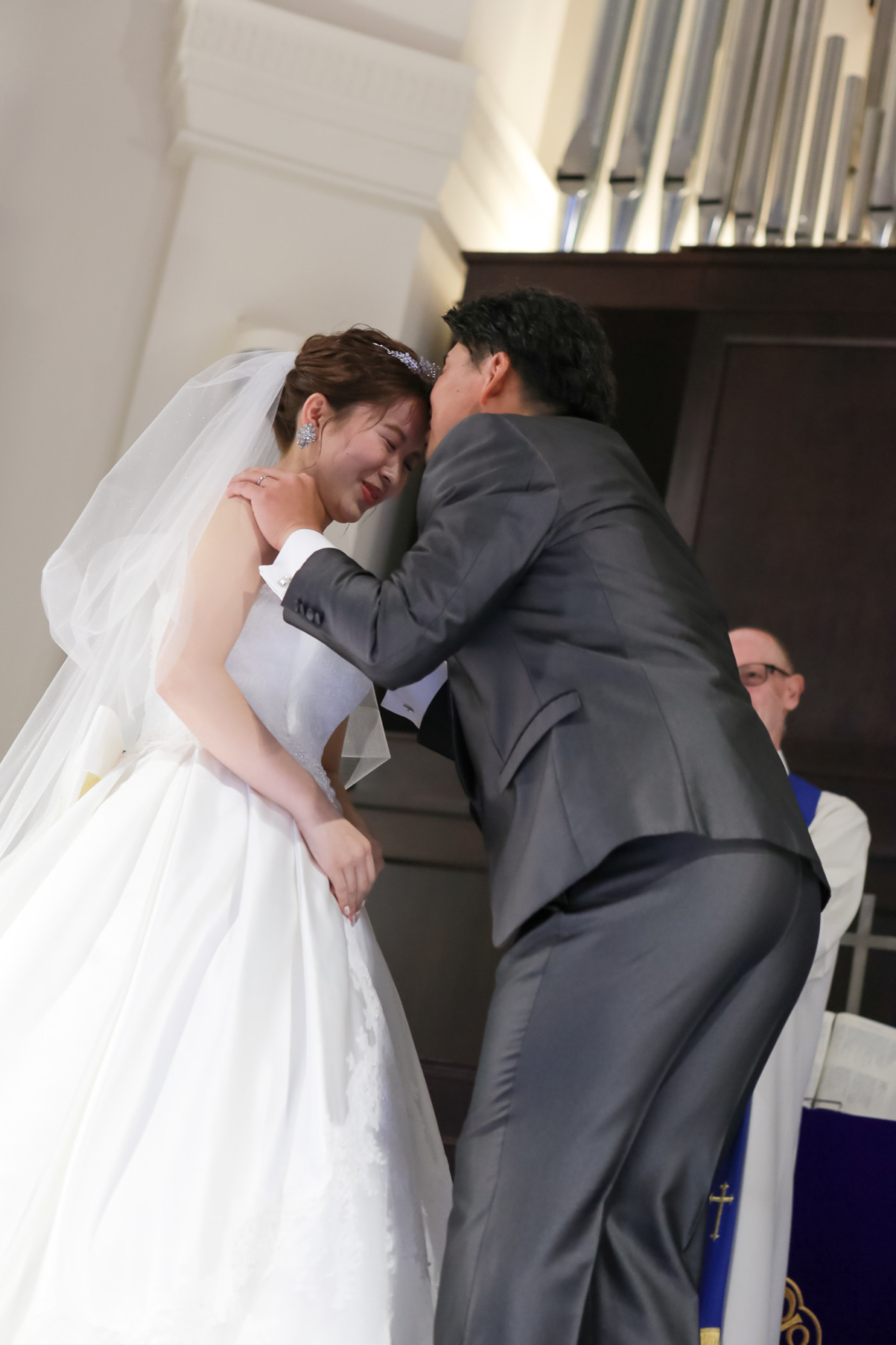 お父様にご新婦の手をバトンタッチしていただき おふたりの夫婦となるセレモニーが開始