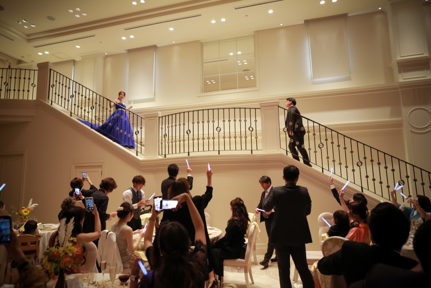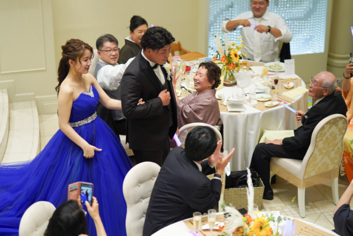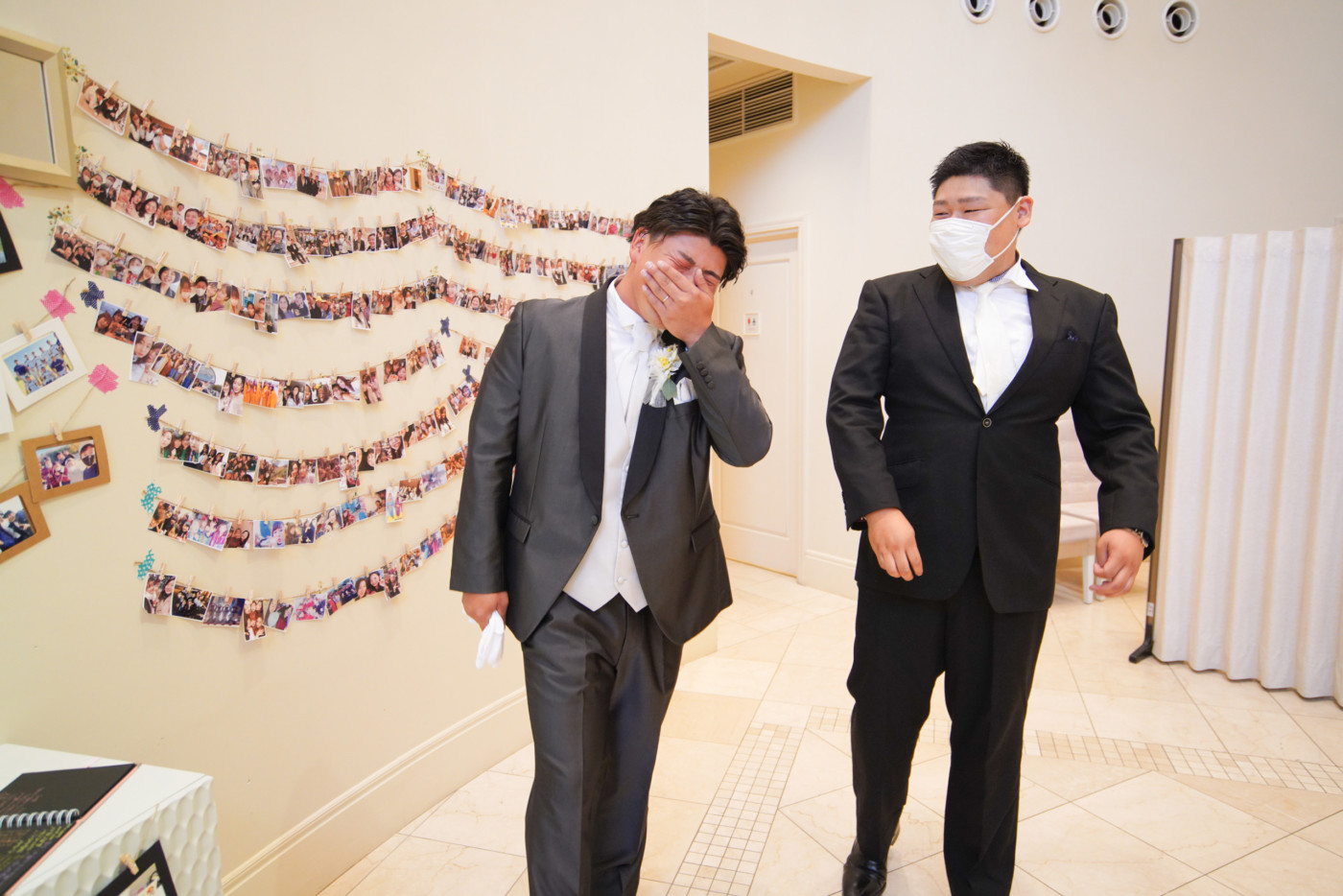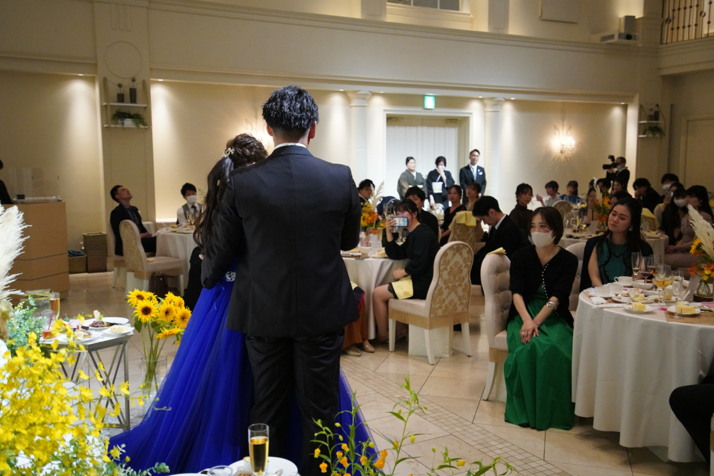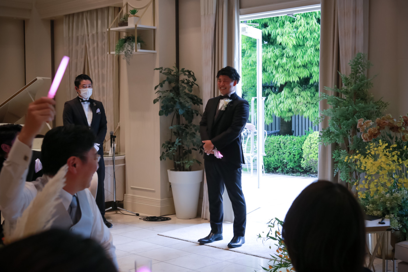 お色直しを済ませて登場したのはご新郎おひとり! ご新婦が登場するドレスが「ブルーなら男の子」「ピンクなら女の子」 ご新郎へもサプライズの演出です
