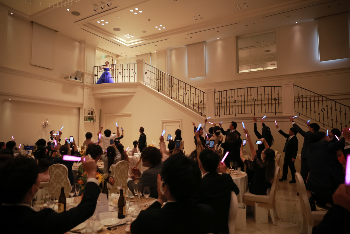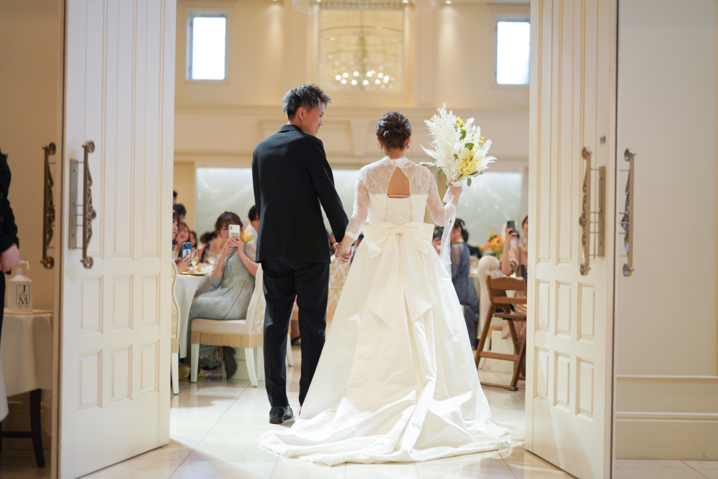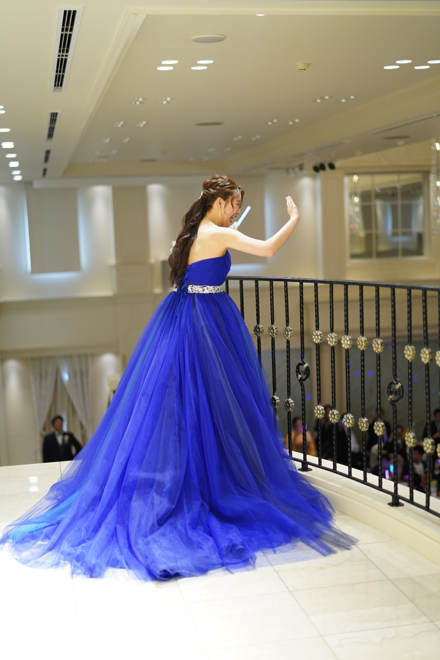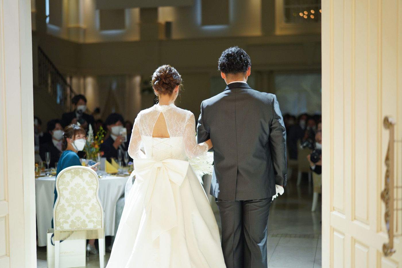 お色直しを済ませて登場したのはご新郎おひとり! ご新婦が登場するドレスが「ブルーなら男の子」「ピンクなら女の子」 ご新郎へもサプライズの演出です