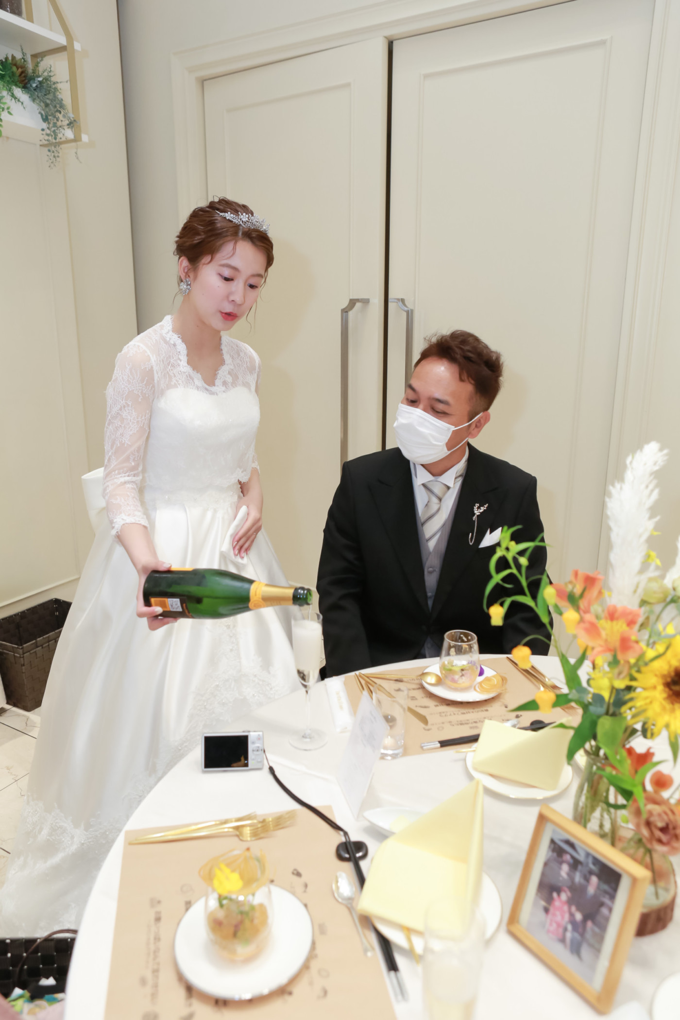 乾杯のシーンではサービス経験のあるご新婦が お父様へ乾杯酒のサーブを行いました。