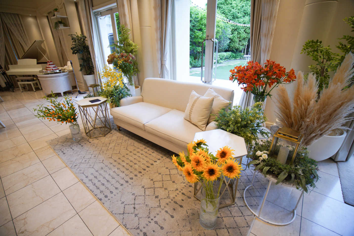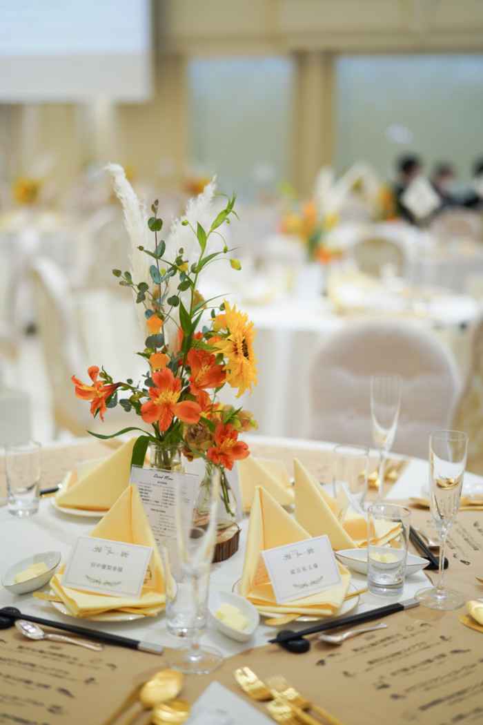 パーティ会場では初夏を感じる装飾に、 温かみのあるテーブルコーディネートをご選択