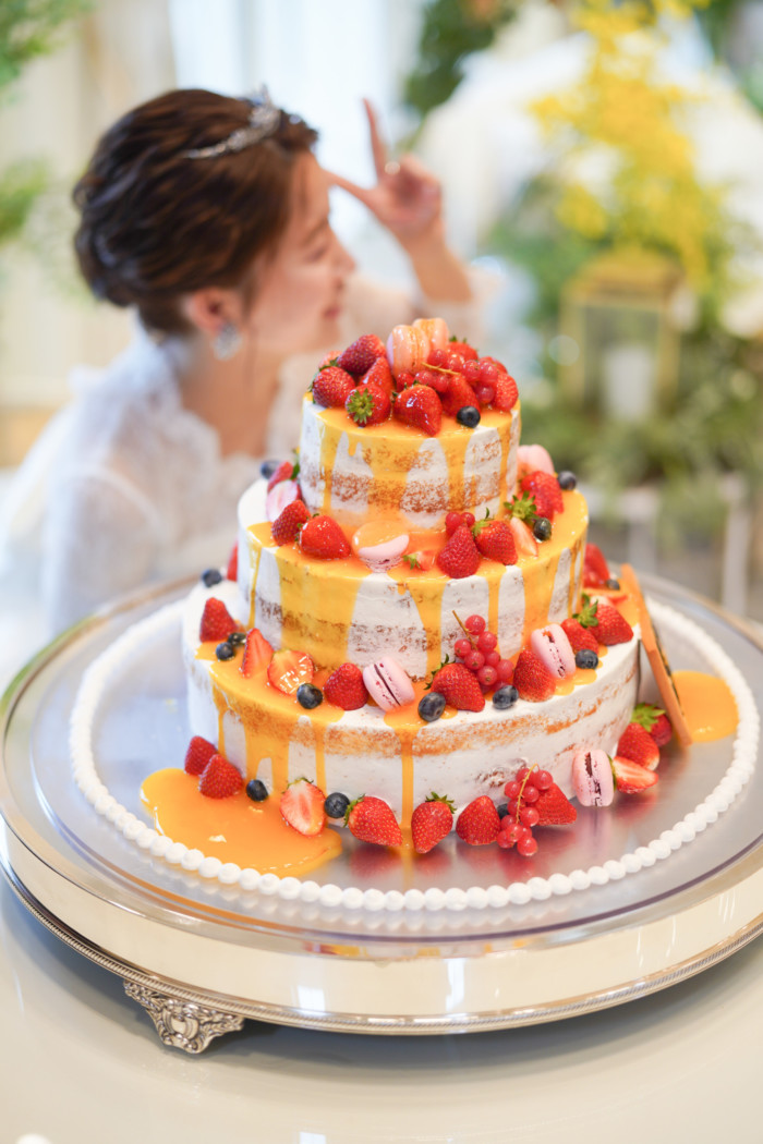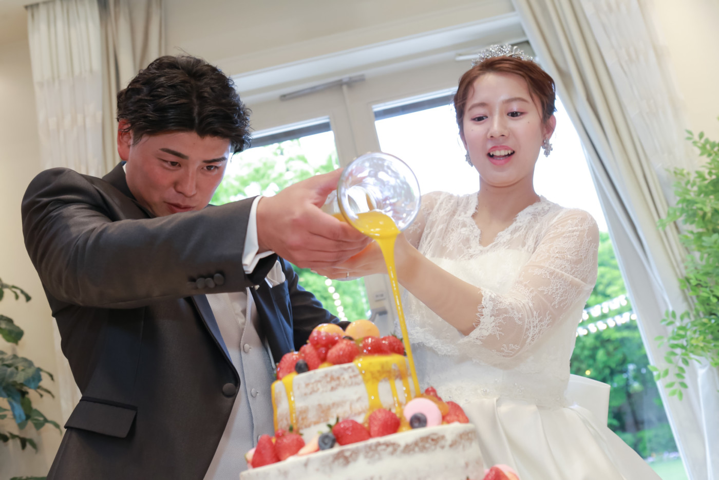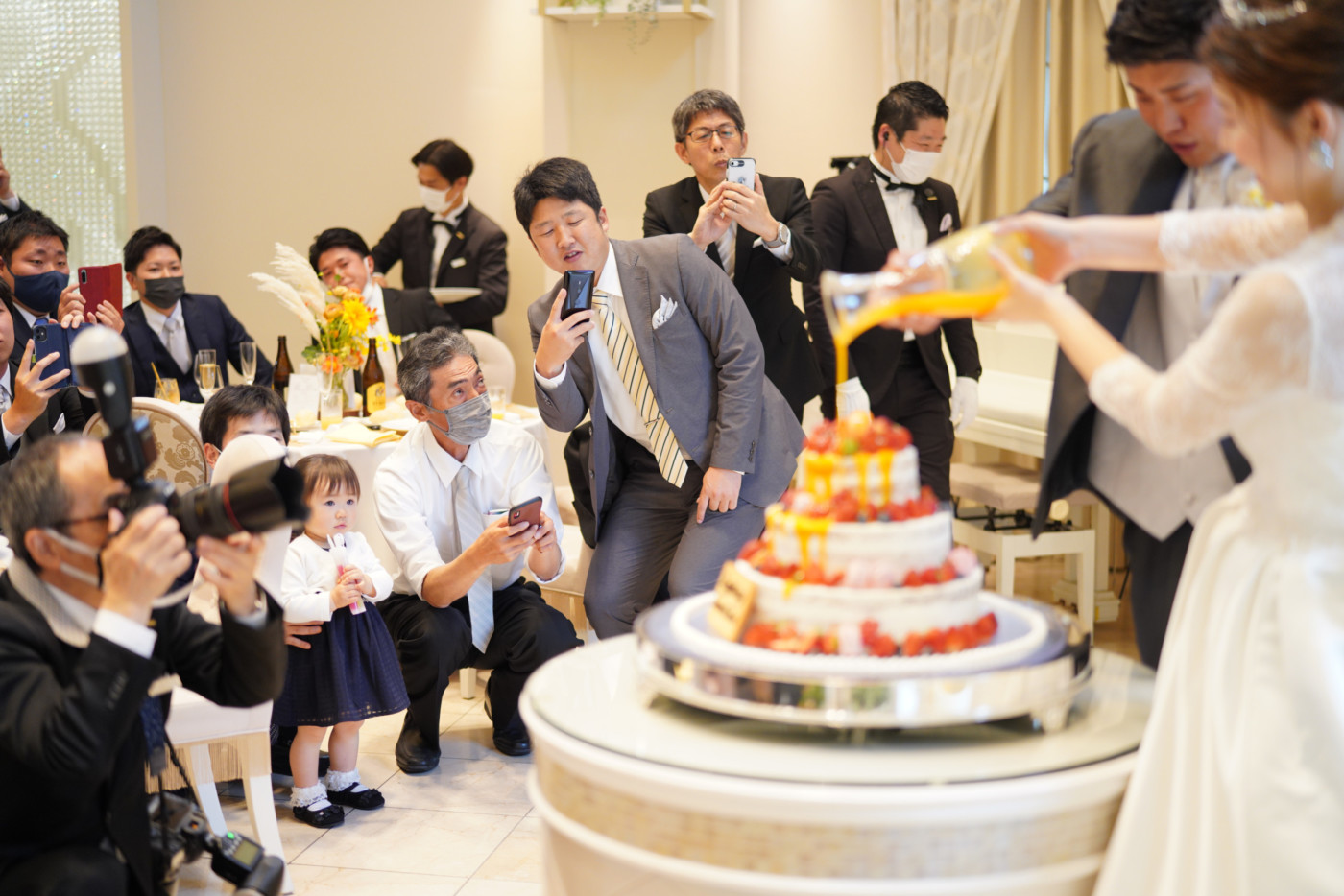 乾杯後はゲストみなさまと沢山のお写真を撮っていただき おふたりの初めての共同作業はドリップケーキ!